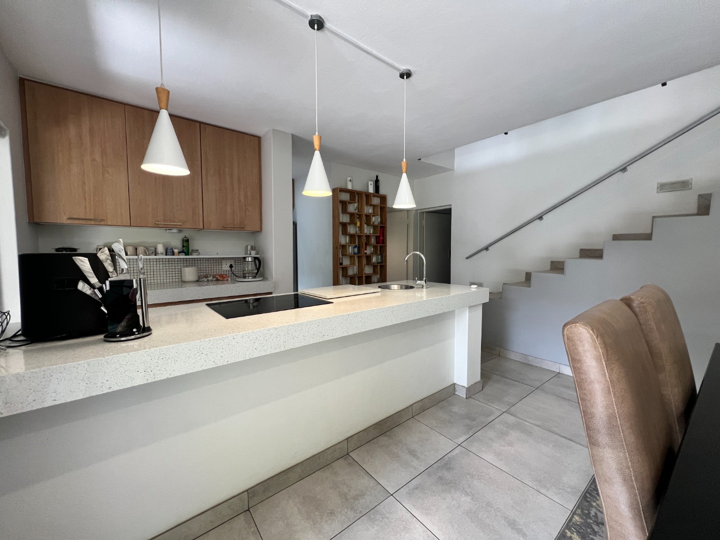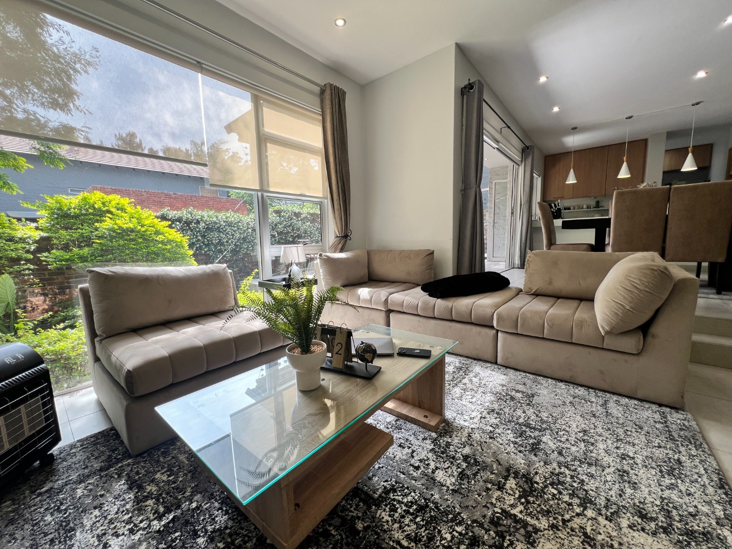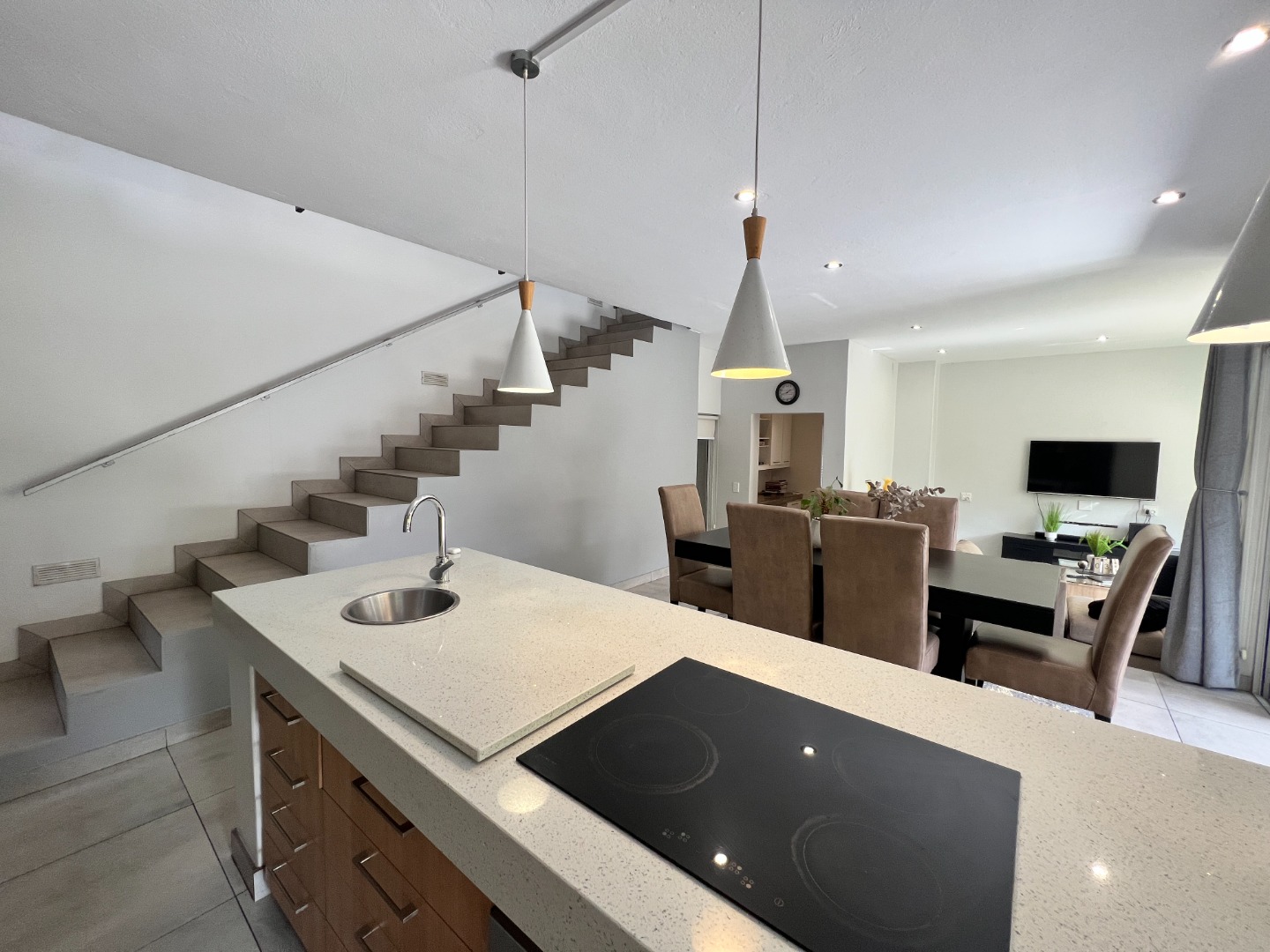 The home comes fully furnished with lounge furniture, a TV, and a dining table set, and includes a double automated garage with extra storage space, a prepaid electricity meter, and an inverter to keep essentials running during load-shedding.