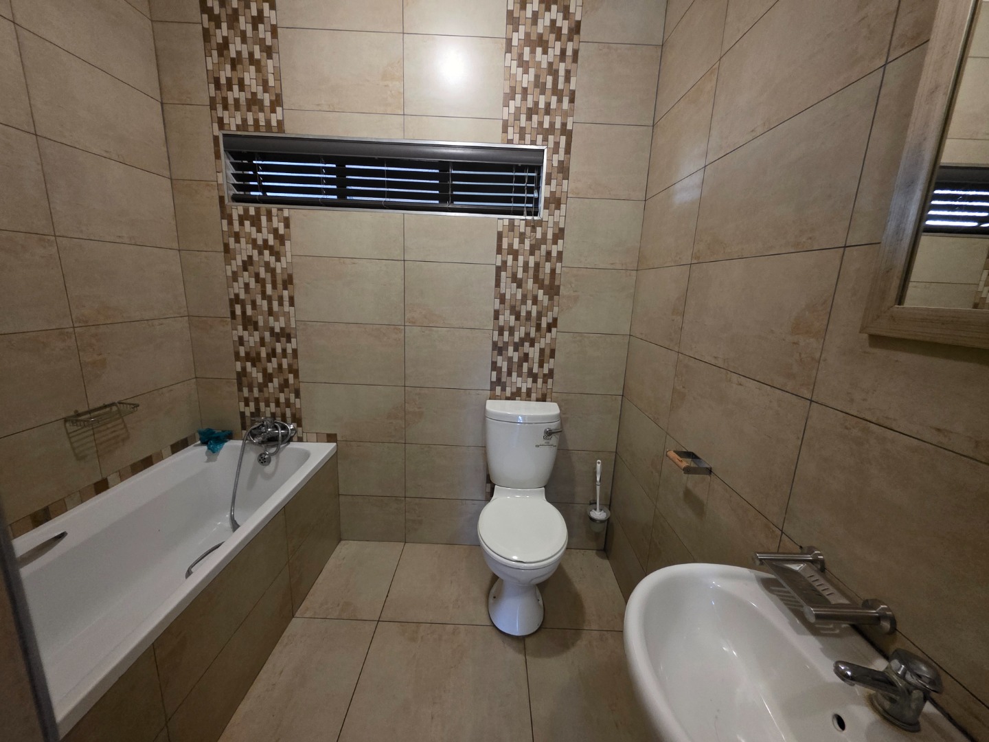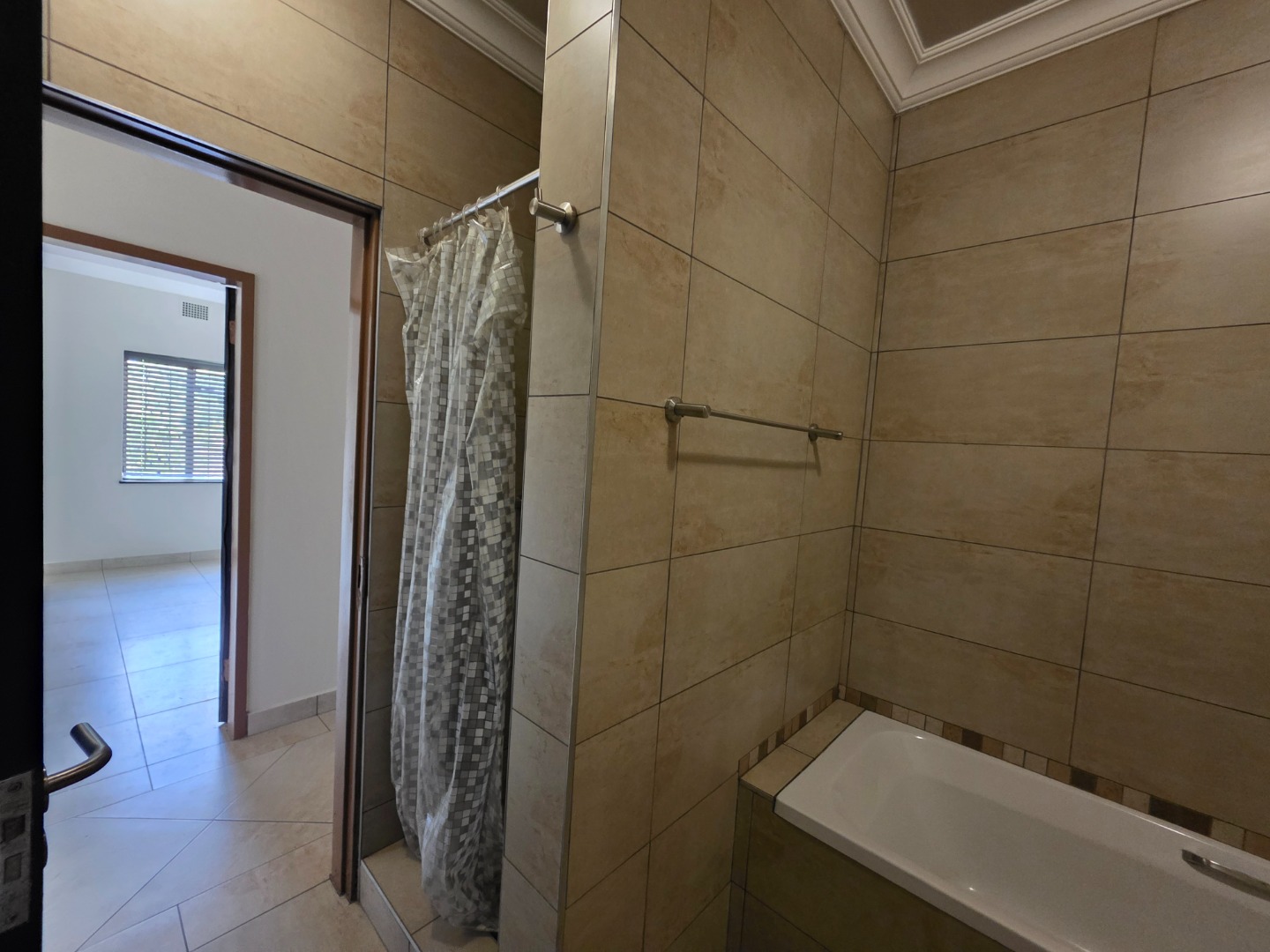 The bedrooms are exceptionally large. Three bathrooms are en-suite, each fitted with a shower, toilet, and basin. The fourth bedroom is not en-suite but has access to a full bathroom featuring a bath, shower, toilet, and basin.