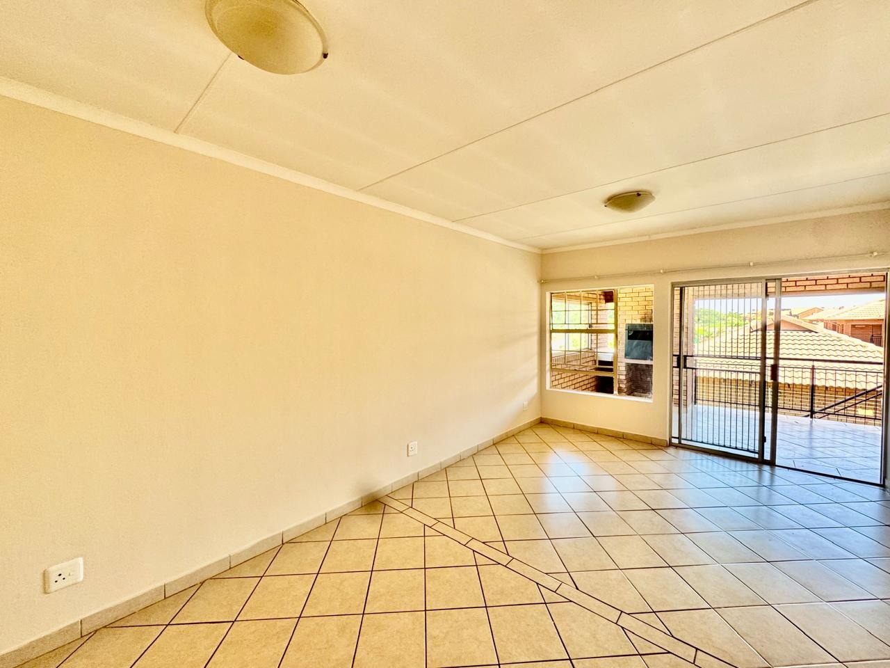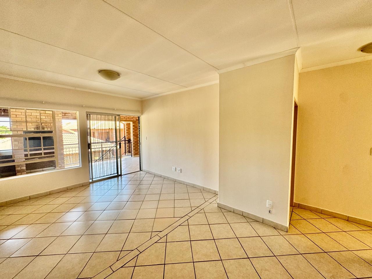 The open-plan living area features durable tiled flooring and abundant natural light, flowing seamlessly into a well-appointed kitchen.