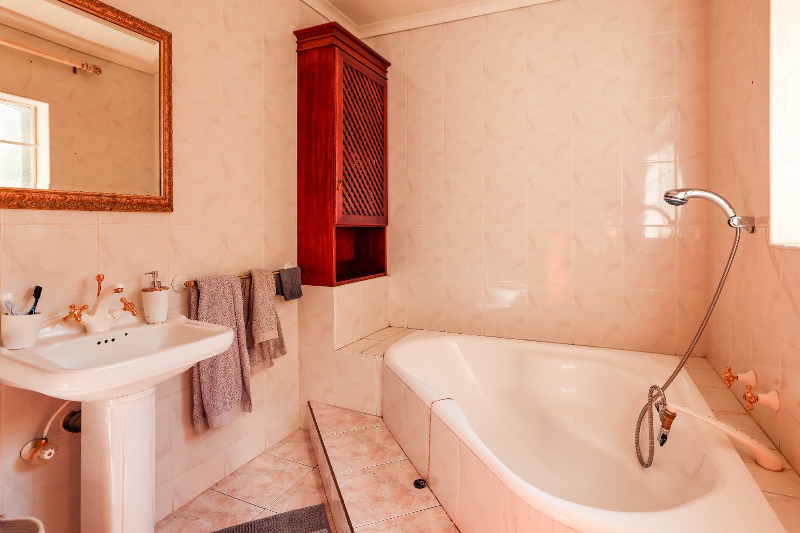 2 spacious bedrooms, one bathroom with toilet, bathtub with shower and basin.
