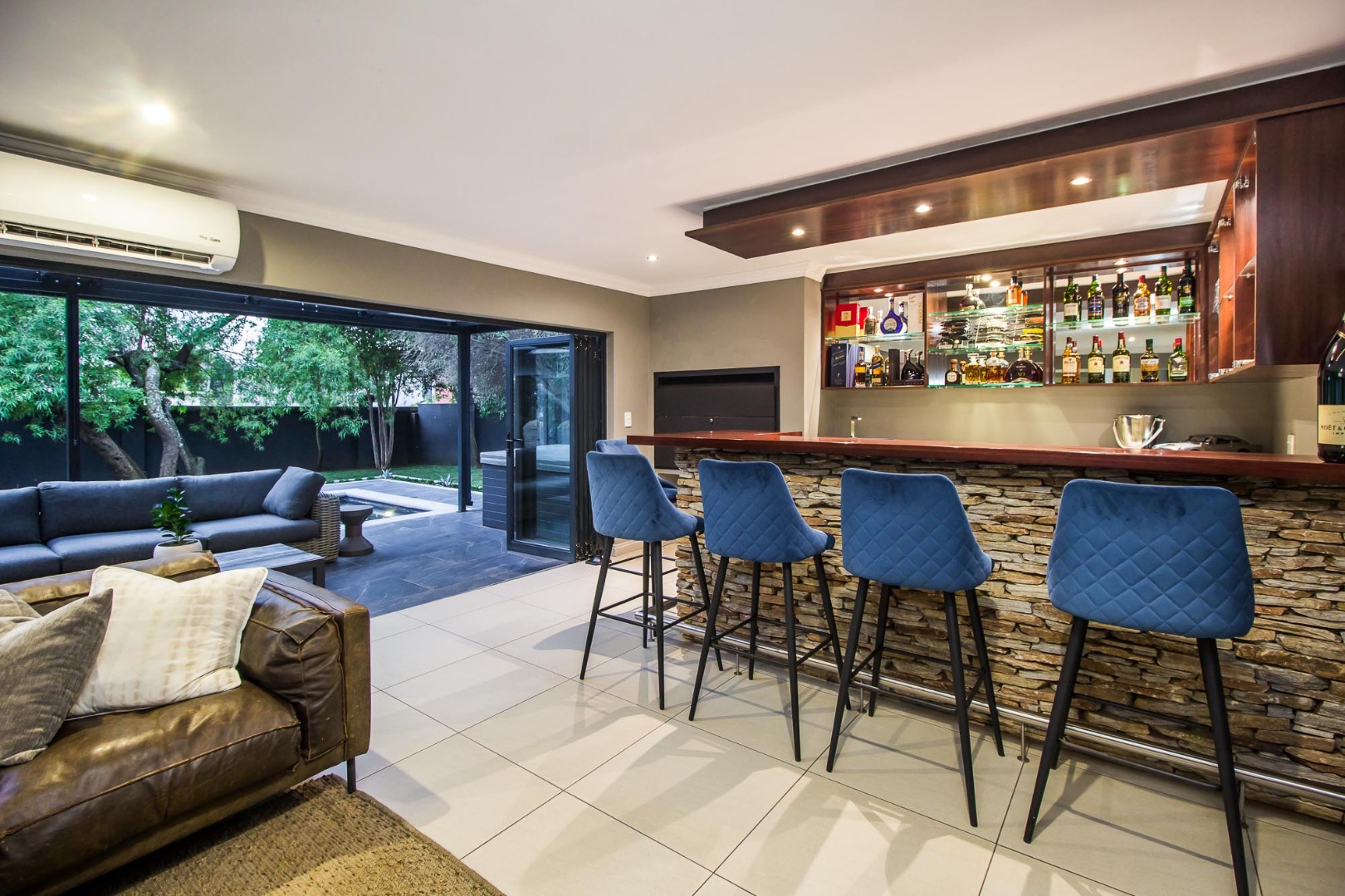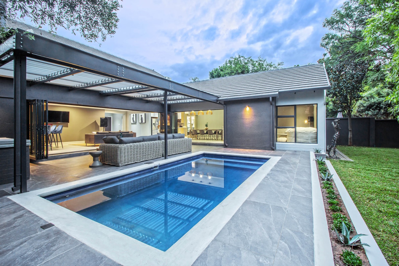 Designed for an exceptional lifestyle, this residence boasts outstanding entertainment capabilities. Large retractable doors effortlessly connect the indoor living spaces to a private outdoor oasis. Here, you will find a refreshing plunge pool, a built-in braai, and a sophisticated built-in bar, all situated within a covered patio area featuring an adjustable louvered roof. The well-maintained garden and paved driveway, leading to a double garage, further enhance the property's appeal, making it ideal for both relaxation and hosting guests. Pets are also welcome, adding to the home's family-friendly charm.