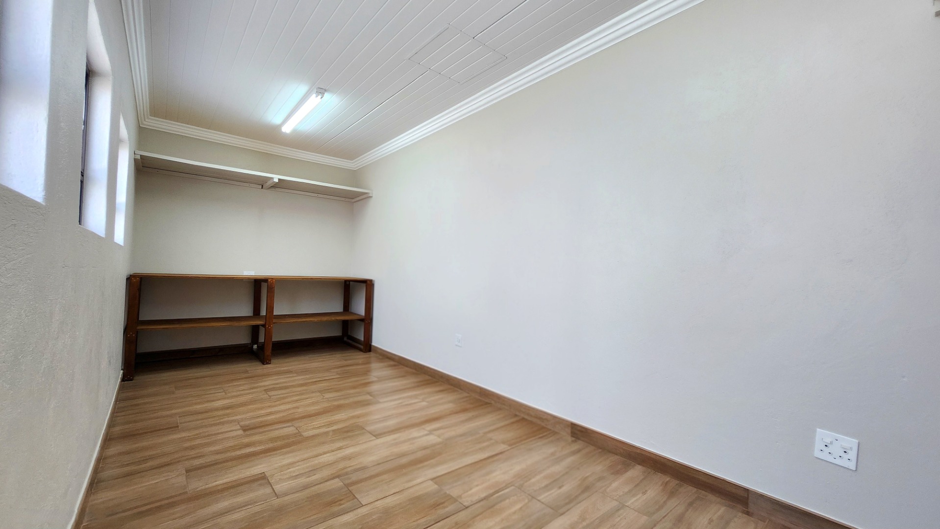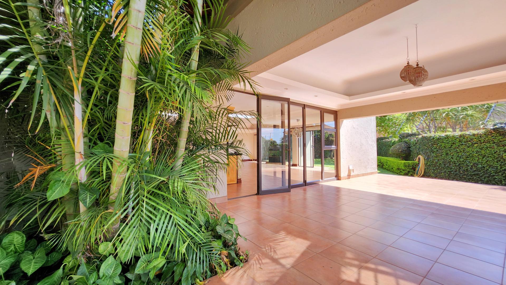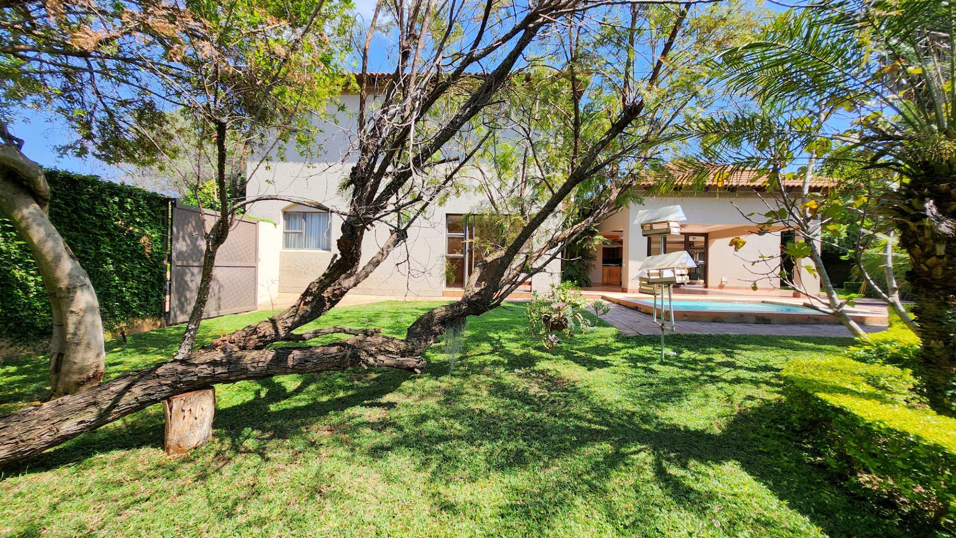Accommodation includes four generously sized bedrooms and four bathrooms, with two en-suite facilities for privacy and convenience. Outside, a private oasis awaits with a sparkling swimming pool, a spacious patio, and a beautifully landscaped garden, complete with an irrigation system, borehole, and water tanks. A built-in braai is perfect for outdoor entertaining.