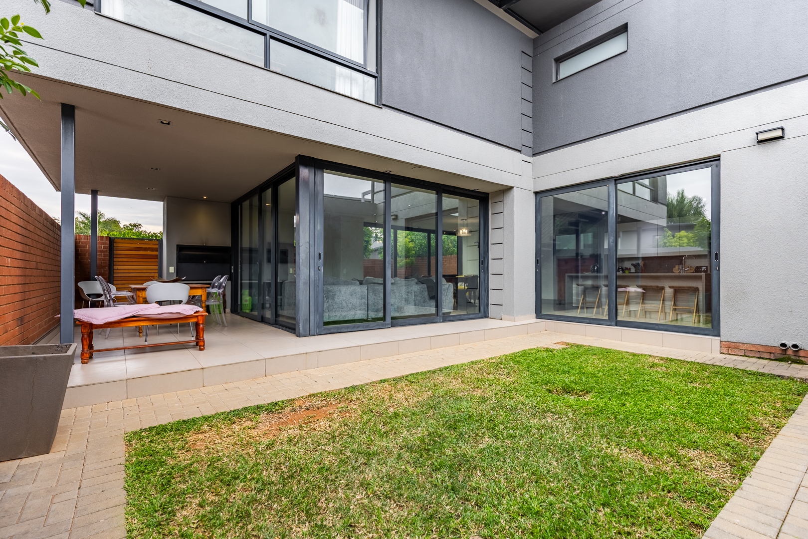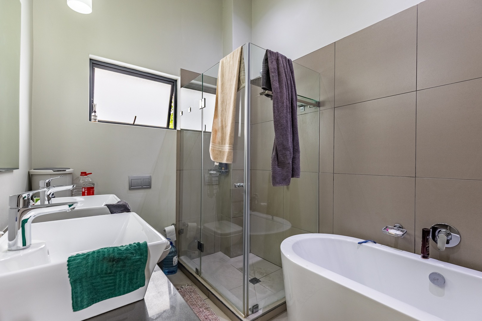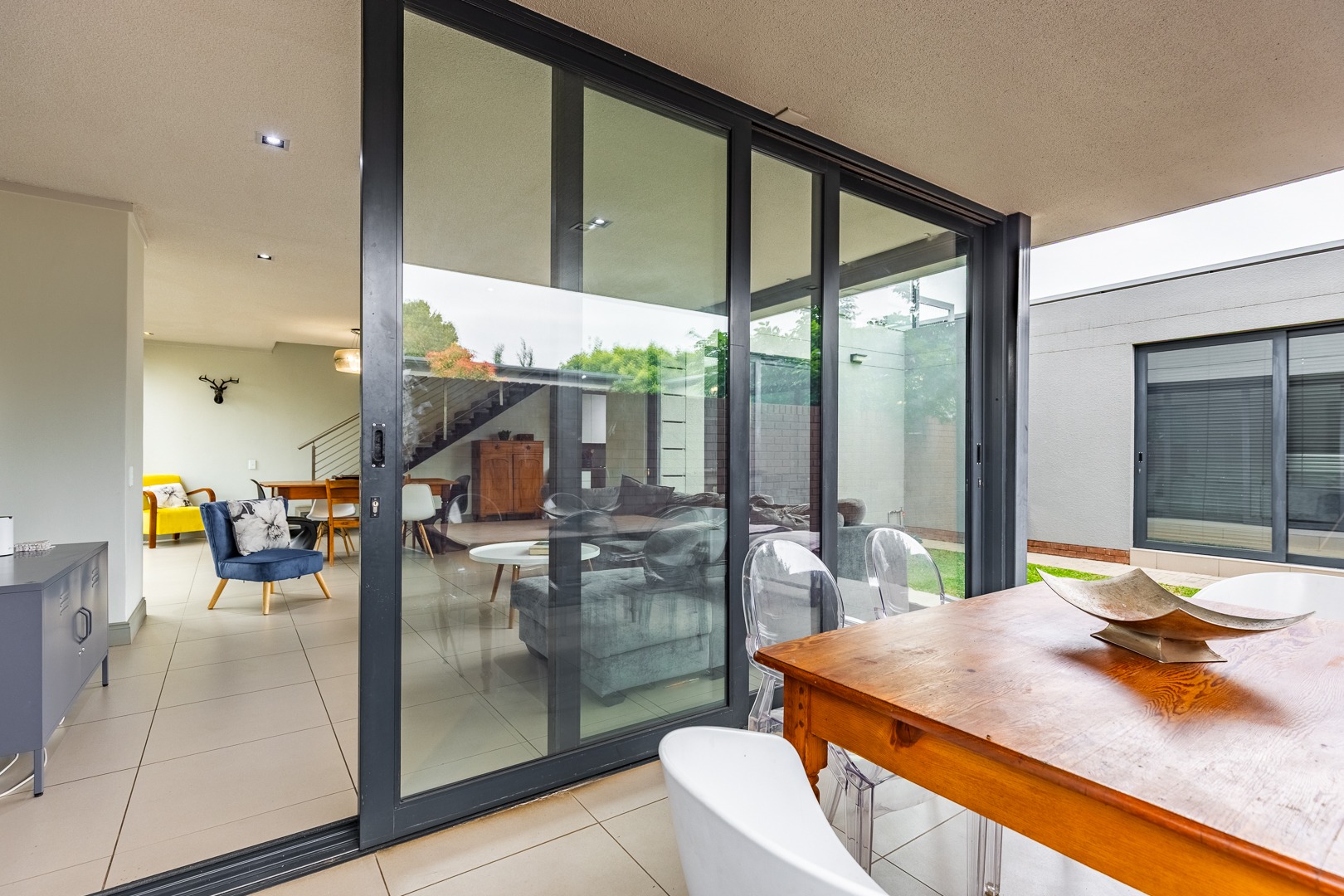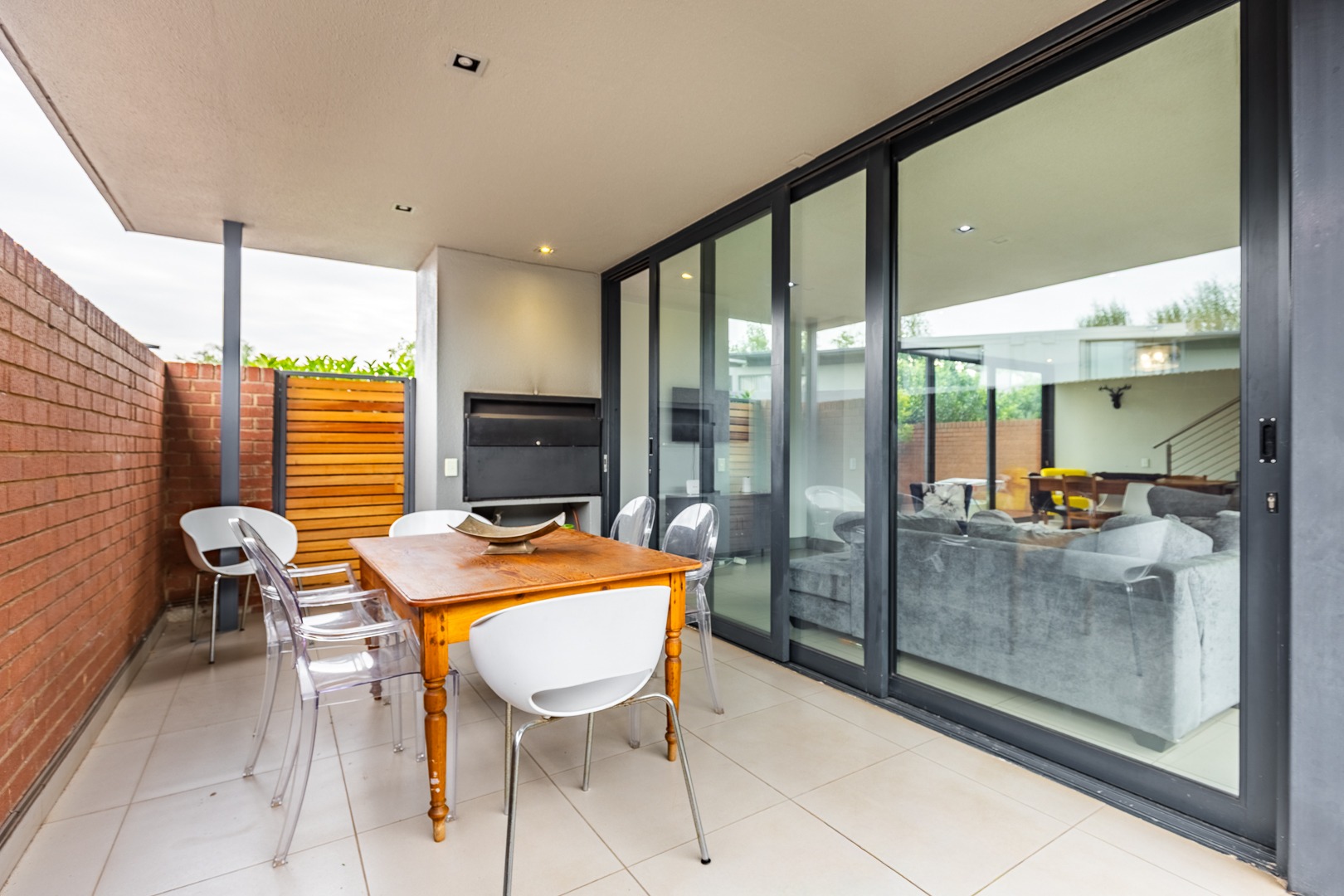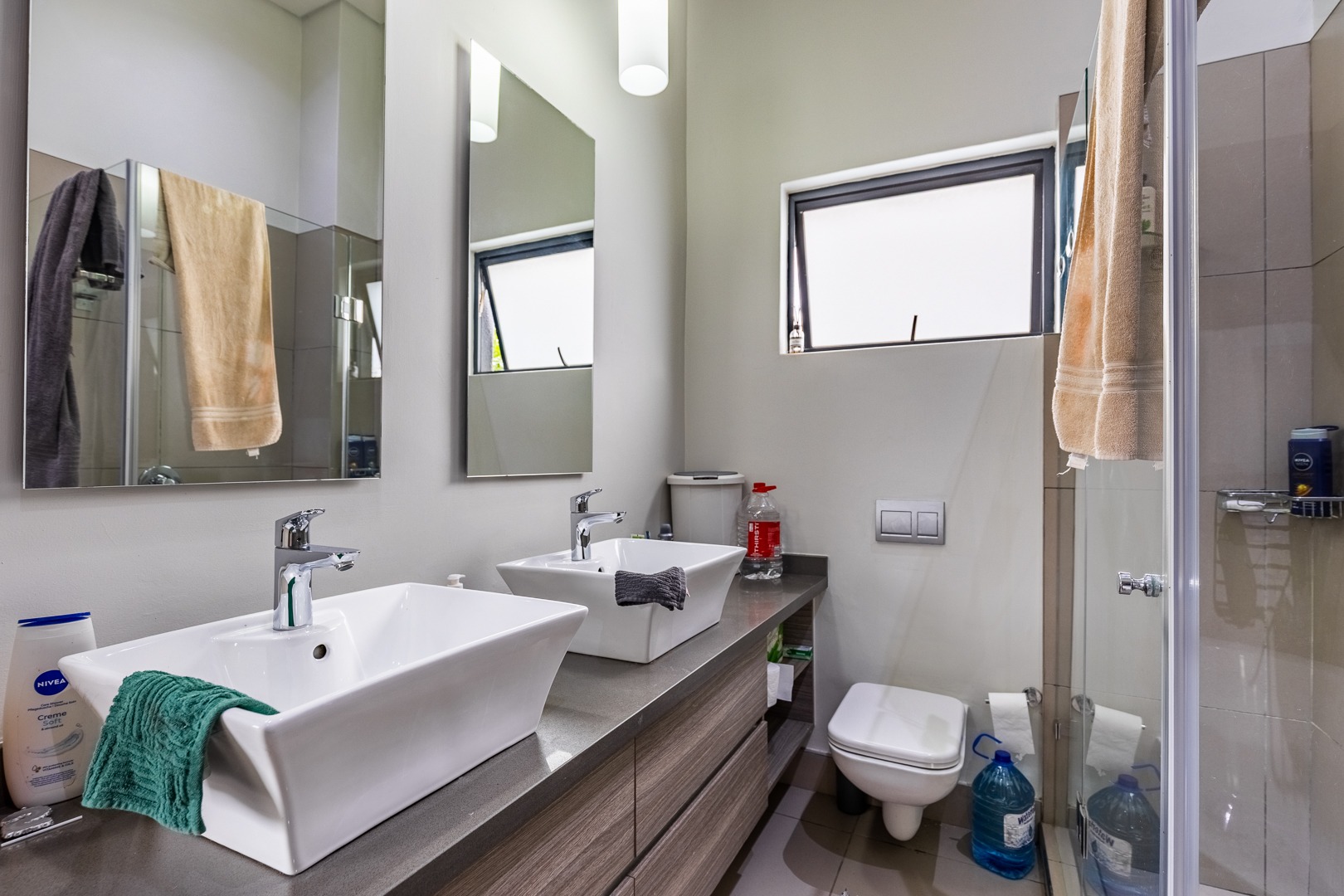 Step into a generous open-plan living and dining area, seamlessly connected to the outdoors by large glass sliding doors. Every room opens up to a meticulously landscaped garden and expansive patio—perfect for entertaining—with a built-in gas braai for effortless outdoor dining. The sleek, contemporary kitchen is equipped with soft-close cabinetry, an electric stove and oven, and a separate scullery for added convenience.Downstairs, you’ll find a spacious en-suite bedroom that can easily serve as a second master suite, complete with built-in cupboards and a luxurious full bathroom featuring double basins. A guest toilet is also located on the ground floor. Upstairs, three more well-sized bedrooms await, each with its own en-suite bathroom. The primary master suite offers abundant cupboard space and a full en-suite bathroom, ideal for relaxing at the end of the day.