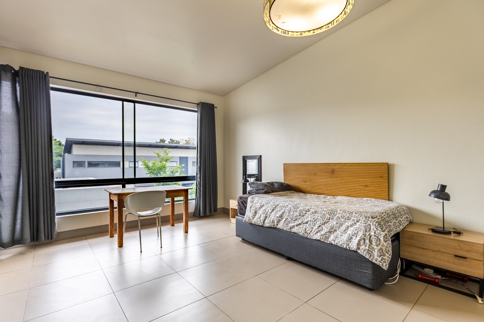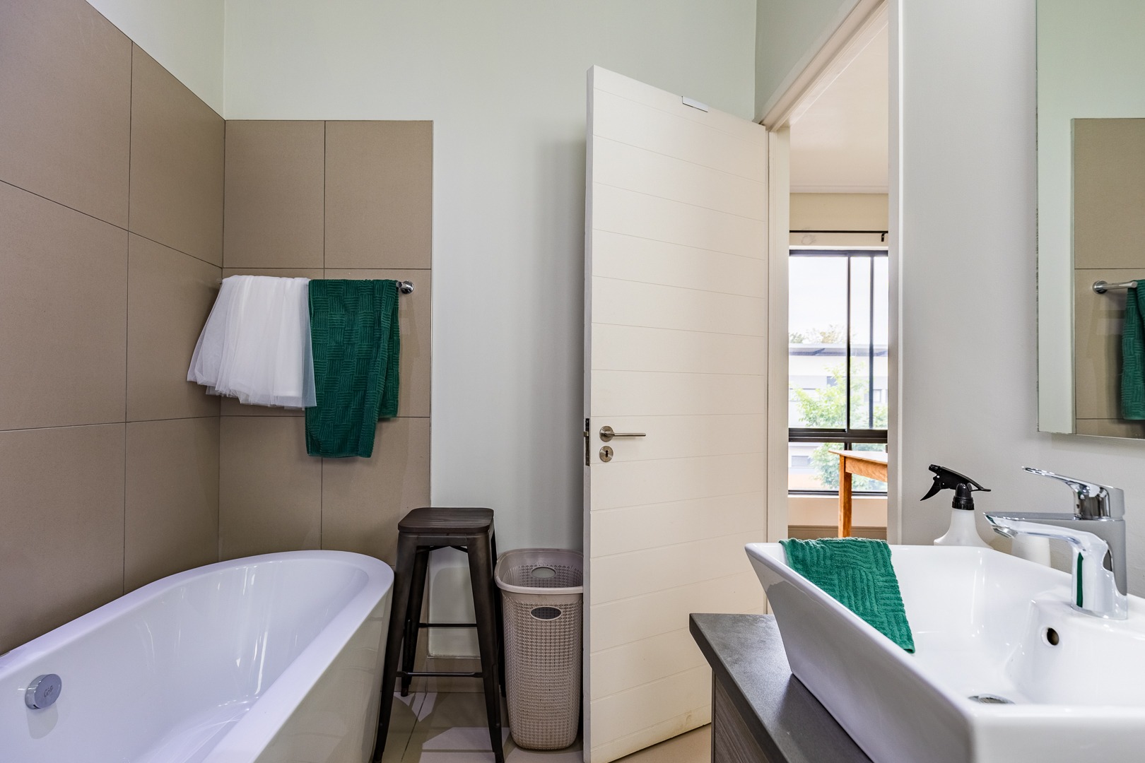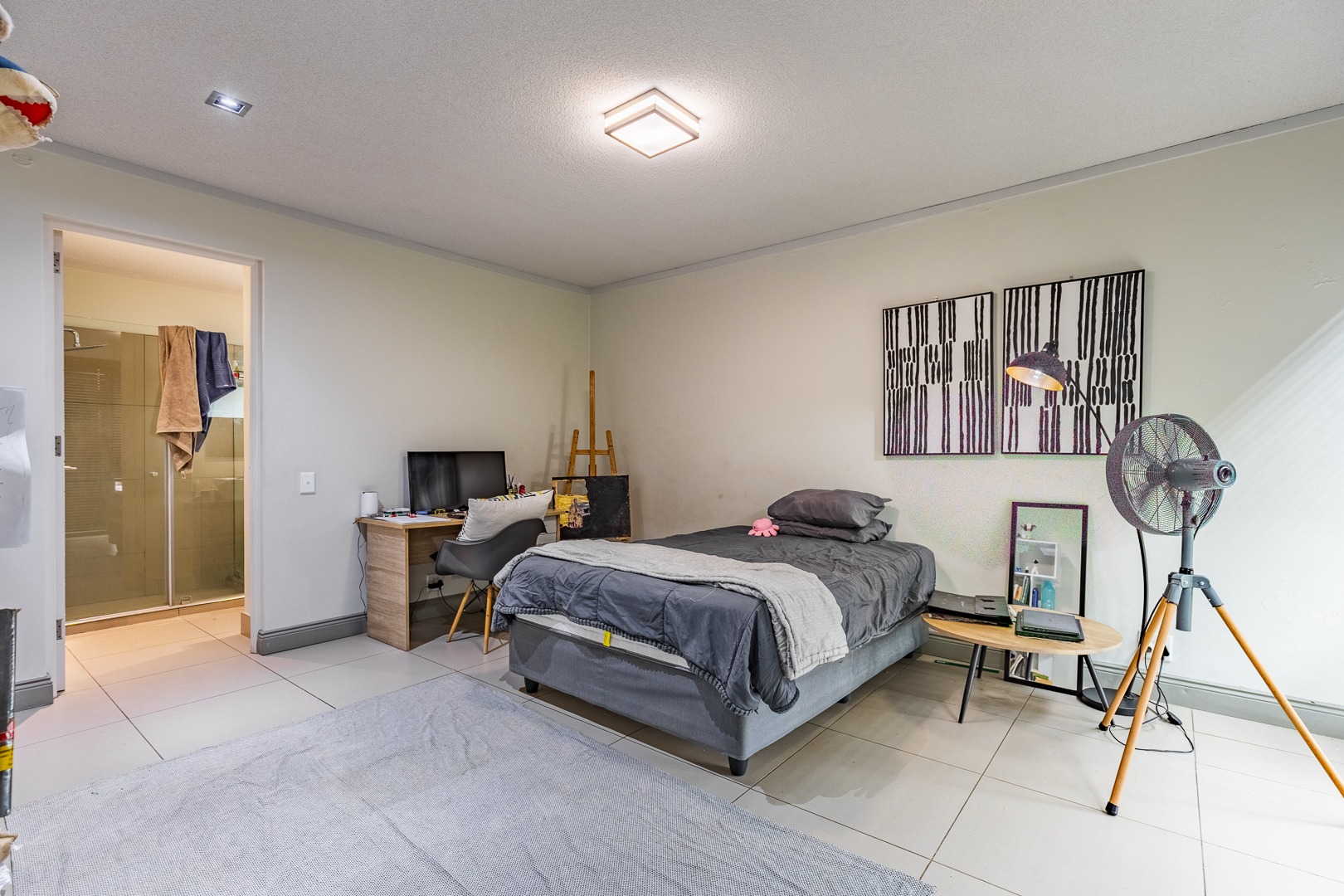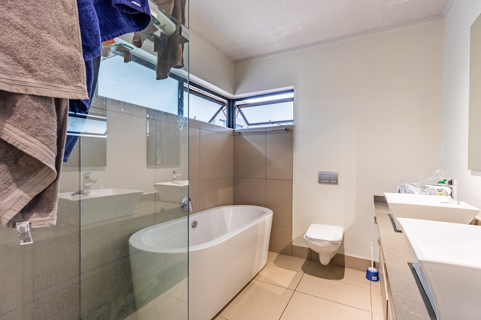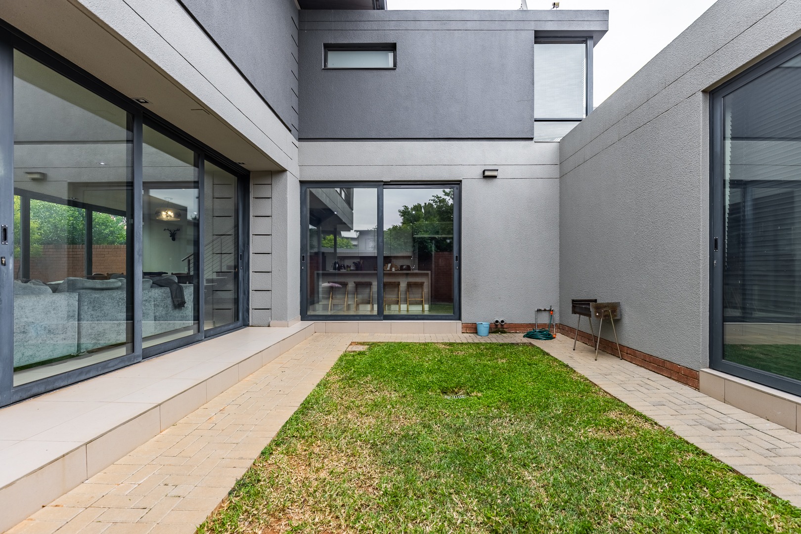 Step into a generous open-plan living and dining area, seamlessly connected to the outdoors by large glass sliding doors. Every room opens up to a meticulously landscaped garden and expansive patio—perfect for entertaining—with a built-in gas braai for effortless outdoor dining. The sleek, contemporary kitchen is equipped with soft-close cabinetry, an electric stove and oven, and a separate scullery for added convenience.Downstairs, you’ll find a spacious en-suite bedroom that can easily serve as a second master suite, complete with built-in cupboards and a luxurious full bathroom featuring double basins. A guest toilet is also located on the ground floor. Upstairs, three more well-sized bedrooms await, each with its own en-suite bathroom. The primary master suite offers abundant cupboard space and a full en-suite bathroom, ideal for relaxing at the end of the day.