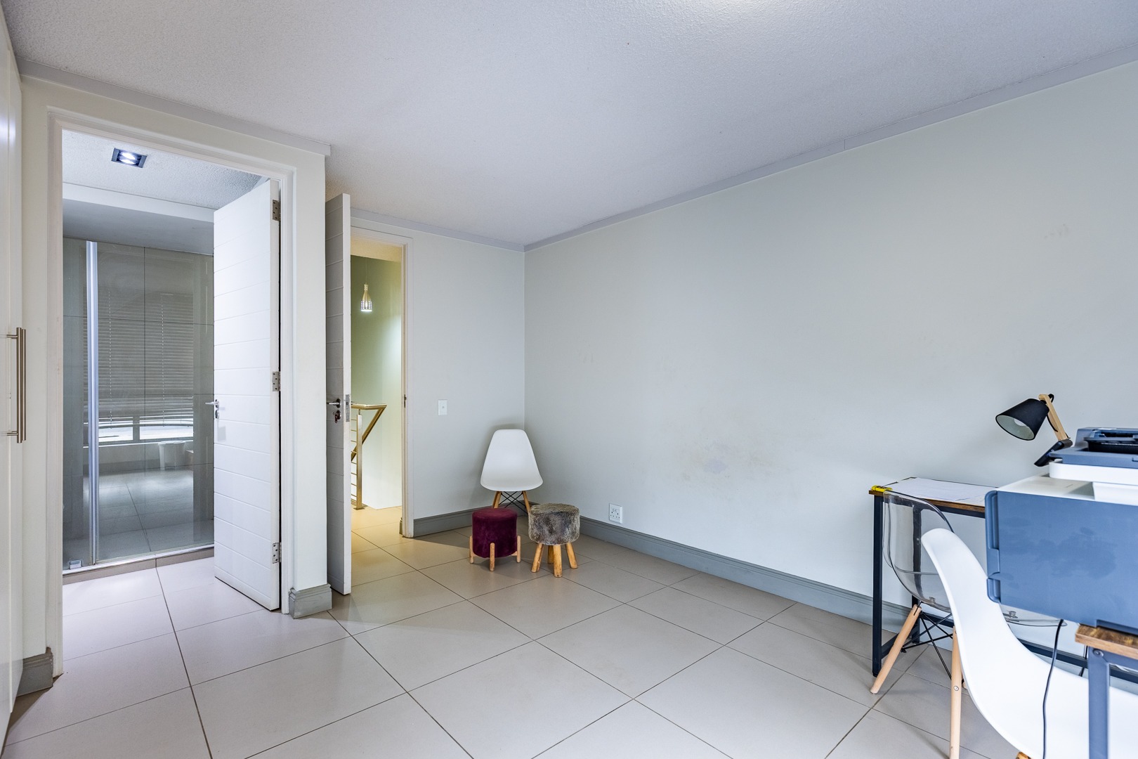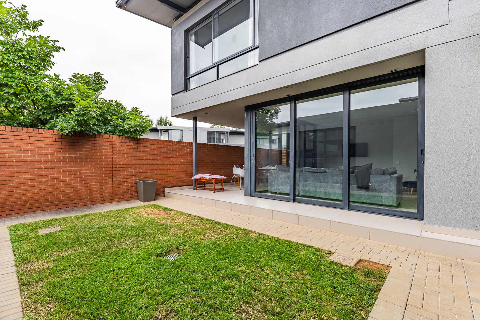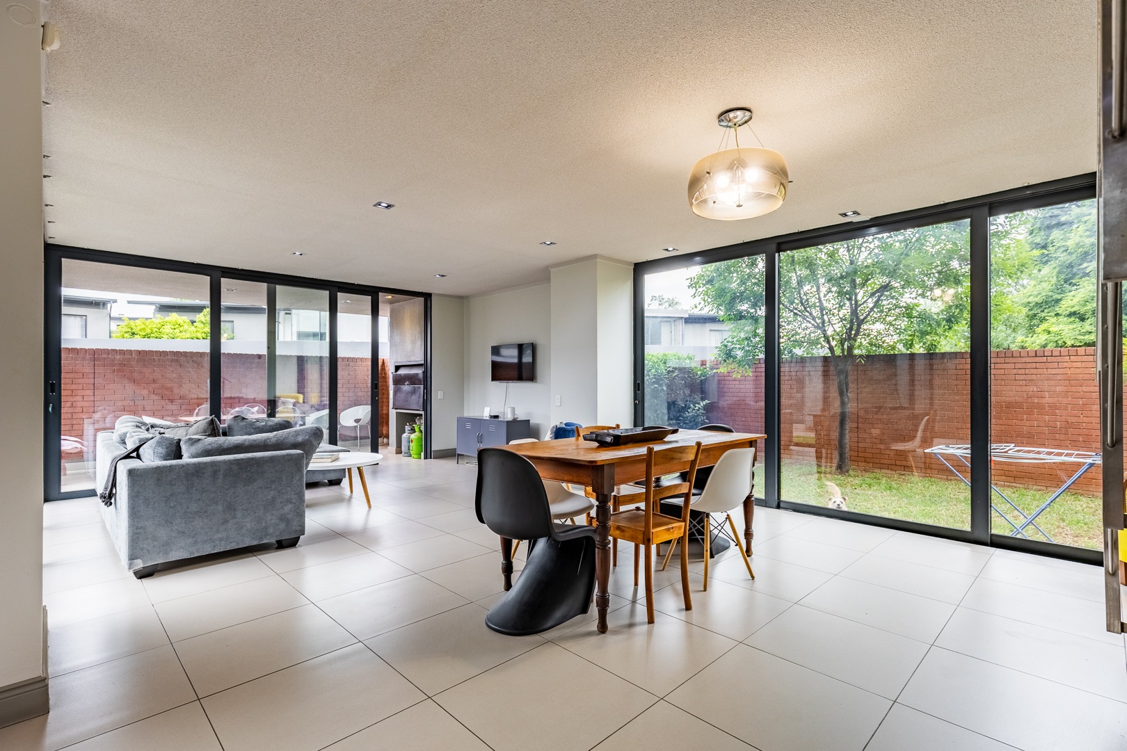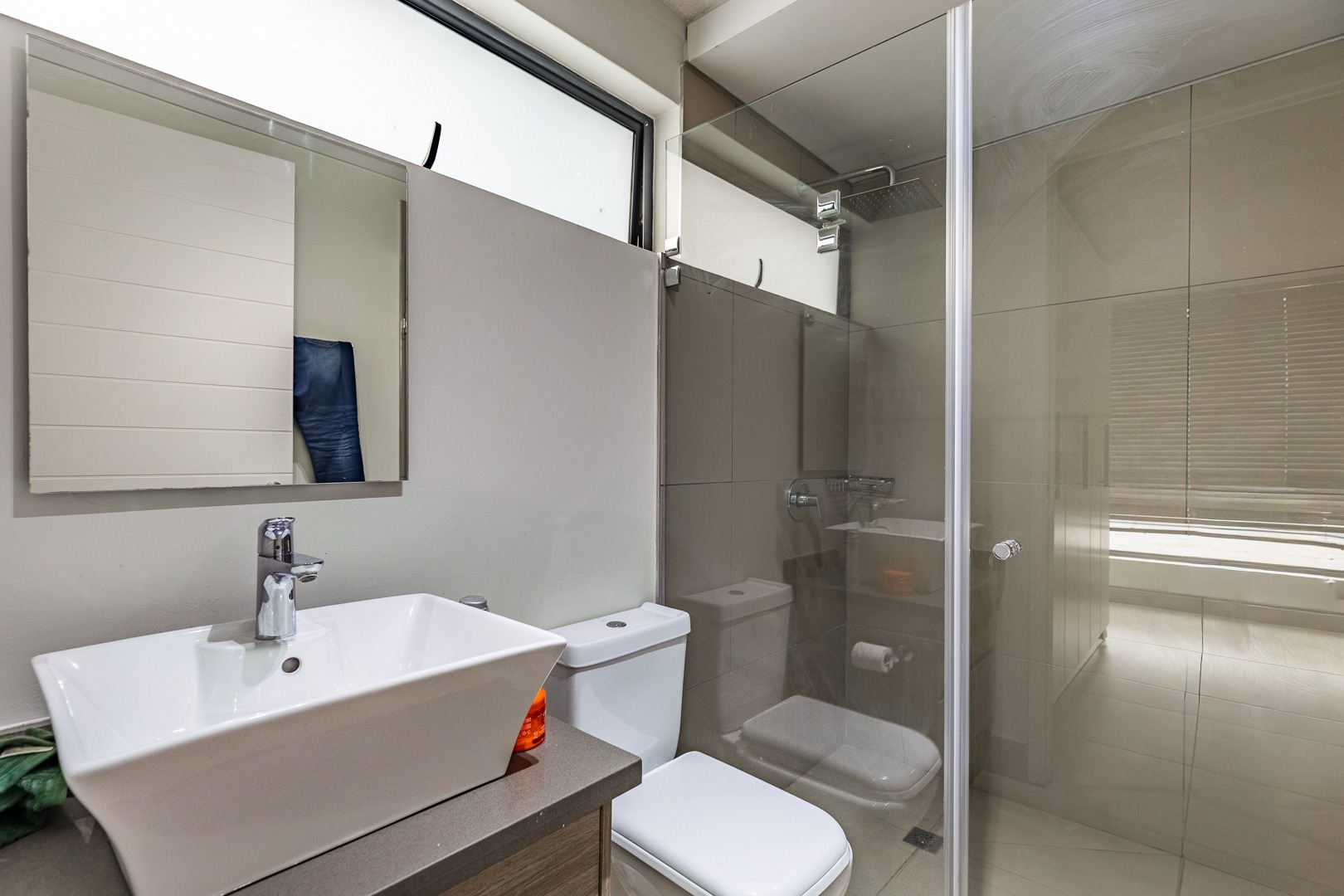 Step into a generous open-plan living and dining area, seamlessly connected to the outdoors by large glass sliding doors. Every room opens up to a meticulously landscaped garden and expansive patio—perfect for entertaining—with a built-in gas braai for effortless outdoor dining. The sleek, contemporary kitchen is equipped with soft-close cabinetry, an electric stove and oven, and a separate scullery for added convenience.Downstairs, you’ll find a spacious en-suite bedroom that can easily serve as a second master suite, complete with built-in cupboards and a luxurious full bathroom featuring double basins. A guest toilet is also located on the ground floor. Upstairs, three more well-sized bedrooms await, each with its own en-suite bathroom. The primary master suite offers abundant cupboard space and a full en-suite bathroom, ideal for relaxing at the end of the day.