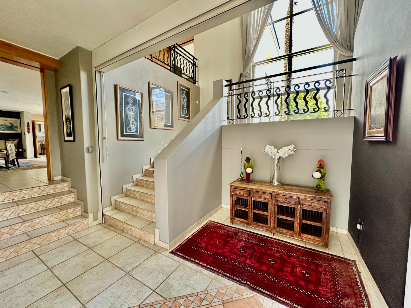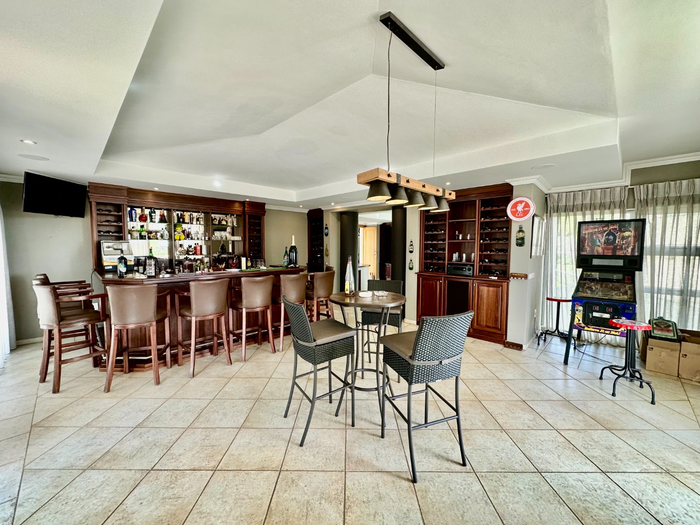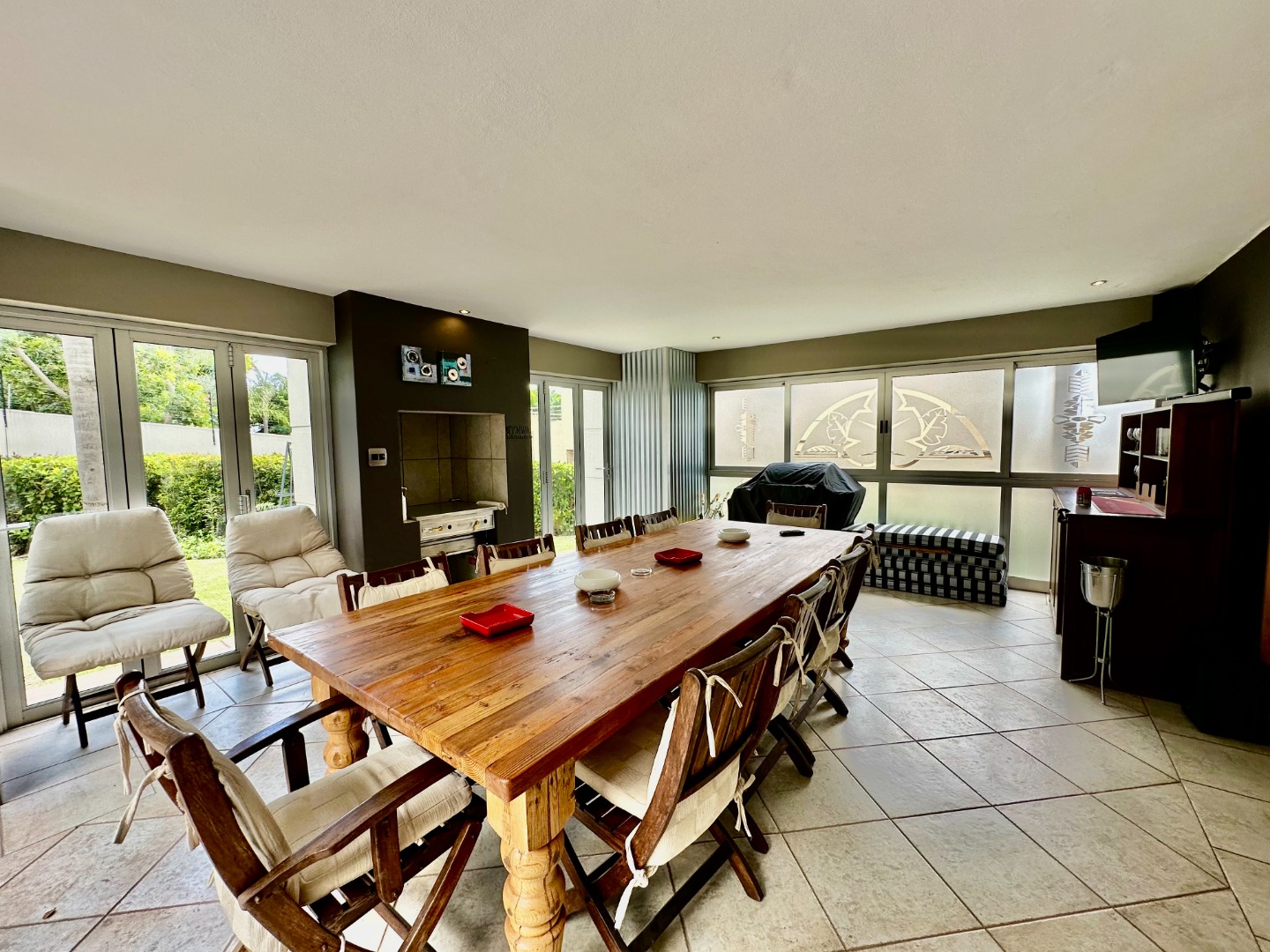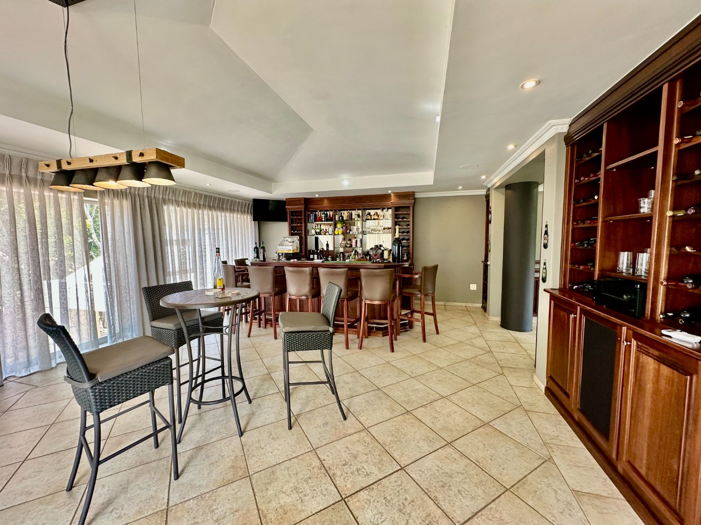 A standout feature of this property is its advanced energy and water infrastructure. The home is fibre-ready and boasts a robust sustainable energy system comprising thirty solar panels and battery inverters to ensure an uninterrupted power supply. The exterior grounds are supported by a borehole, water tanks, and an automated irrigation system, ensuring the garden remains lush throughout the year.