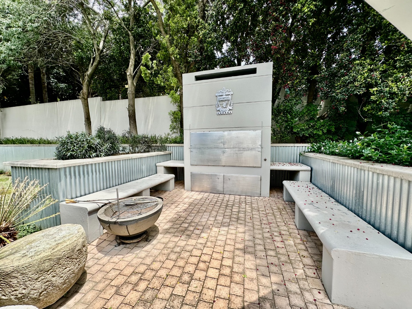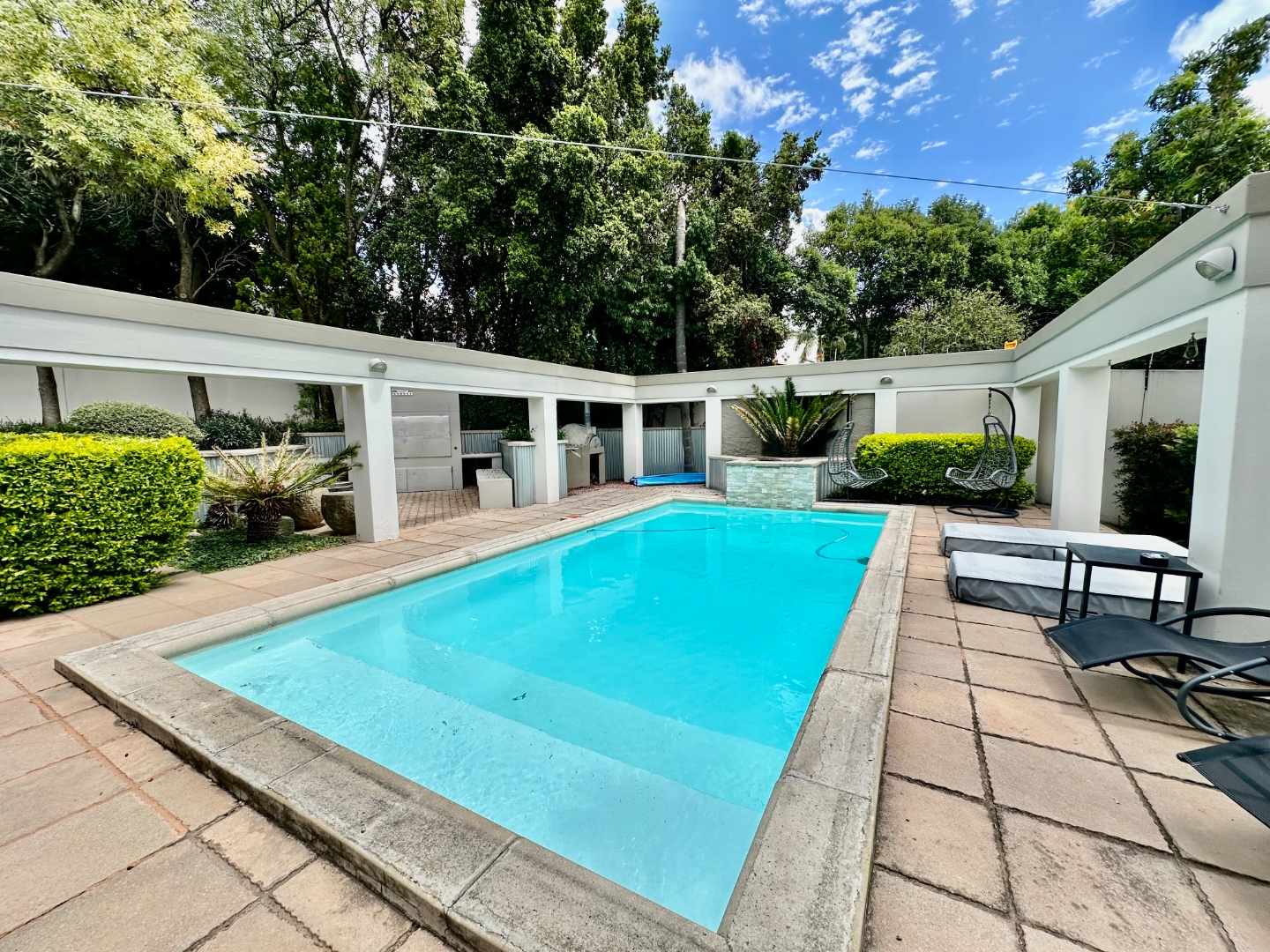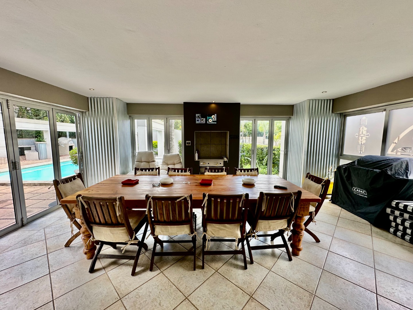 The outdoor entertainment area is exceptional, featuring a private swimming pool, a covered patio, and a traditional lapa. The space is further enhanced by a built-in braai and a pizza oven, making it an ideal venue for hosting guests.