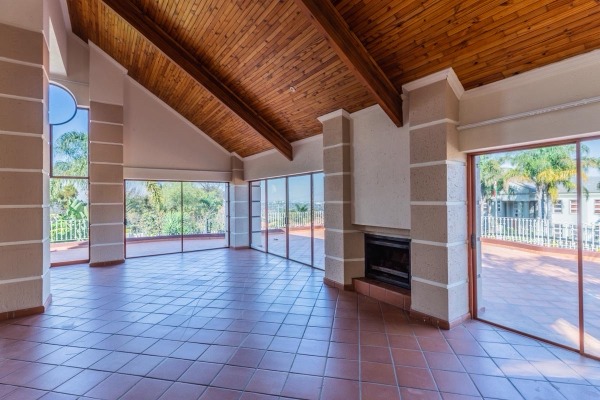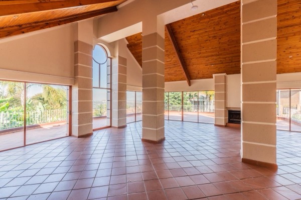 The heart of the home is a massive double-volume lounge and dining area, filled with natural light and enhanced by a striking fireplace and a wraparound balcony that showcases beautiful panoramic views. This space seamlessly connects to an impressive entertainment area featuring a TV and billiards room, all opening out onto a large swimming pool and a built-in outdoor braai area, creating the perfect setting for gatherings.