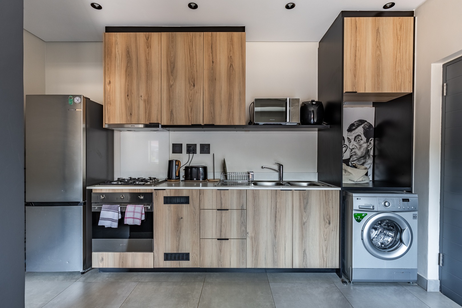 The contemporary kitchen features ample cupboard space and space for two appliances. Appliances (fridge, microwave, and washing machine) are available on request. WiFi is also available on request, offering added flexibility to suit your needs.