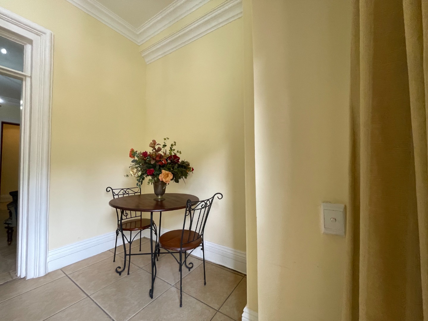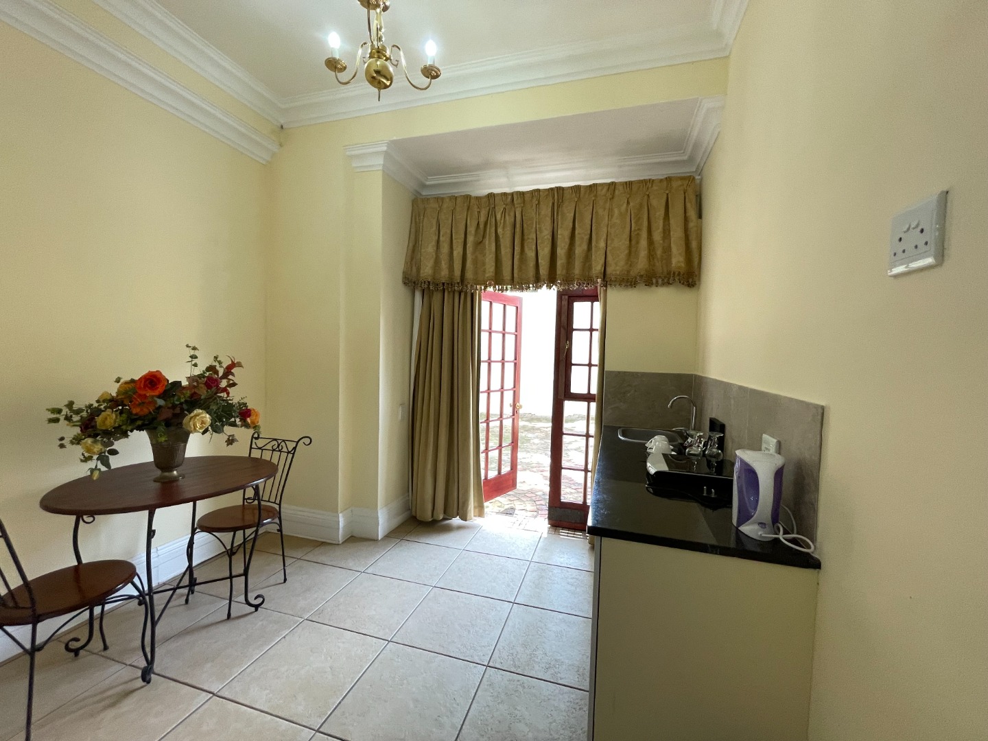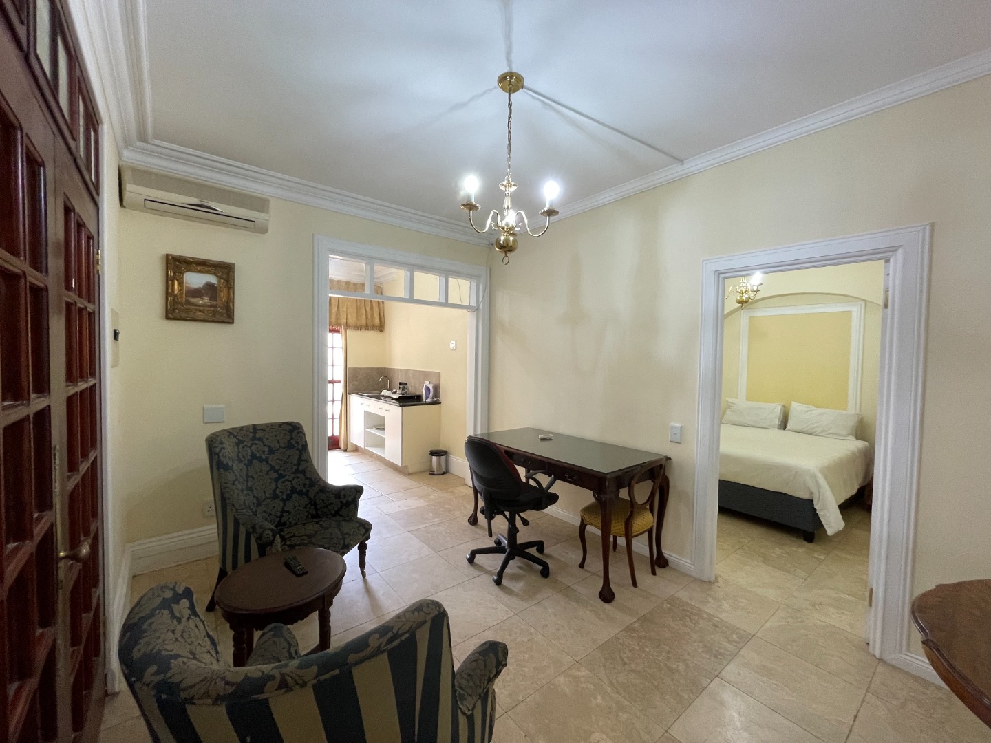 Discover this inviting 1-bedroom, 1-bathroom rental unit within a secure gated community in Pretoria's prestigious Waterkloof suburb. Ideal for a single professional or couple, this dual living opportunity offers a compact yet functional layout. The unit features a comfortable lounge and a practical kitchenette, perfect for everyday living. Interiors boast elegant tiled flooring, crown molding, and classic chandeliers, creating a refined atmosphere. The bedroom includes an ensuite bathroom and a unique arched niche, with double doors providing direct outdoor access. Enjoy peace of mind with a secure entrance, ornate wrought-iron gates, and high perimeter walls. The property benefits from a paved driveway and mature trees, enhancing its curb appeal. One dedicated parking space is available. Waterkloof is a sought-after metropolitan area in South Africa, known for its tranquil environment and convenient city access. Key Features: * 1 Bedroom, 1 Bathroom (Ensuite) * Compact Kitchenette & Lounge * Gated Community Security * Paved Driveway & 1 Parking Bay * Tiled Floors & Crown Molding