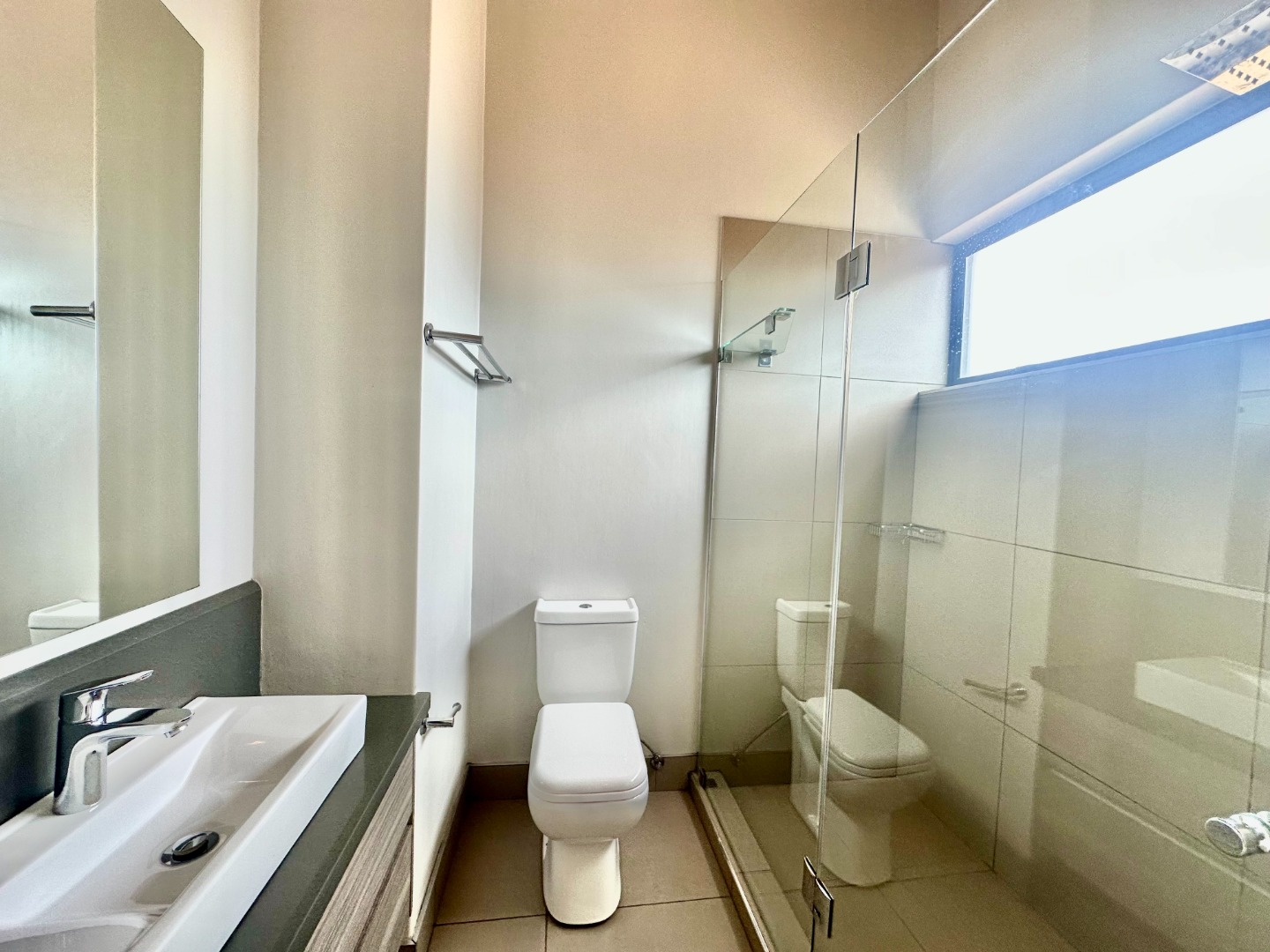 Upstairs, you’ll find three spacious en-suite bedrooms, including a luxurious main suite with abundant cupboard space and a spa-like bathroom complete with both a bath and shower. The home also includes a double automated garage and additional storage. Perfectly positioned close to top schools, shops, and main routes, this secure and stylish home is ideal for families or professionals seeking upscale living in a prime location.