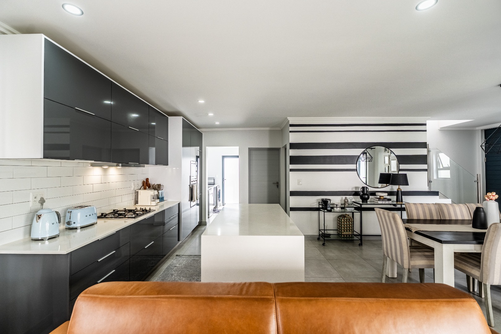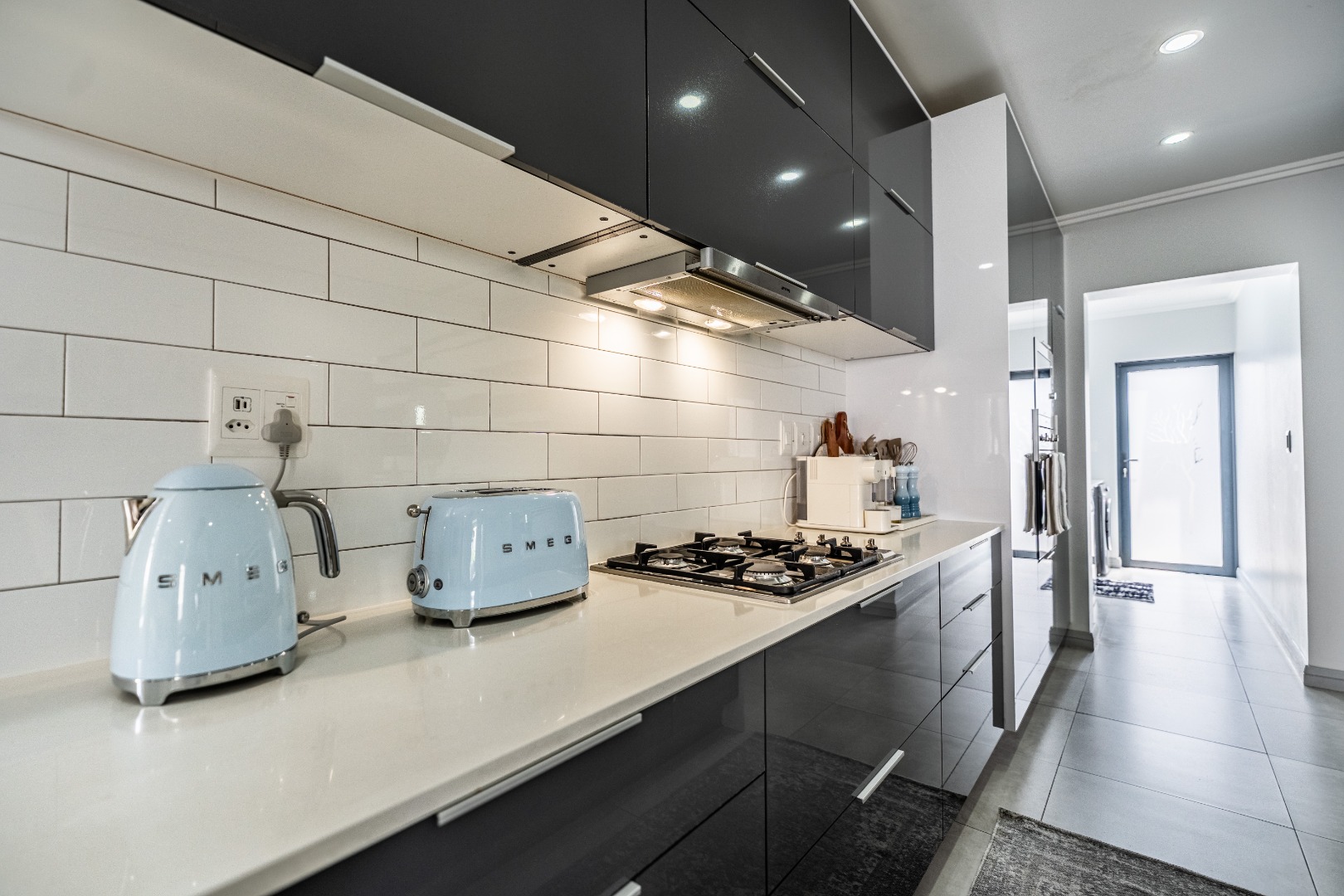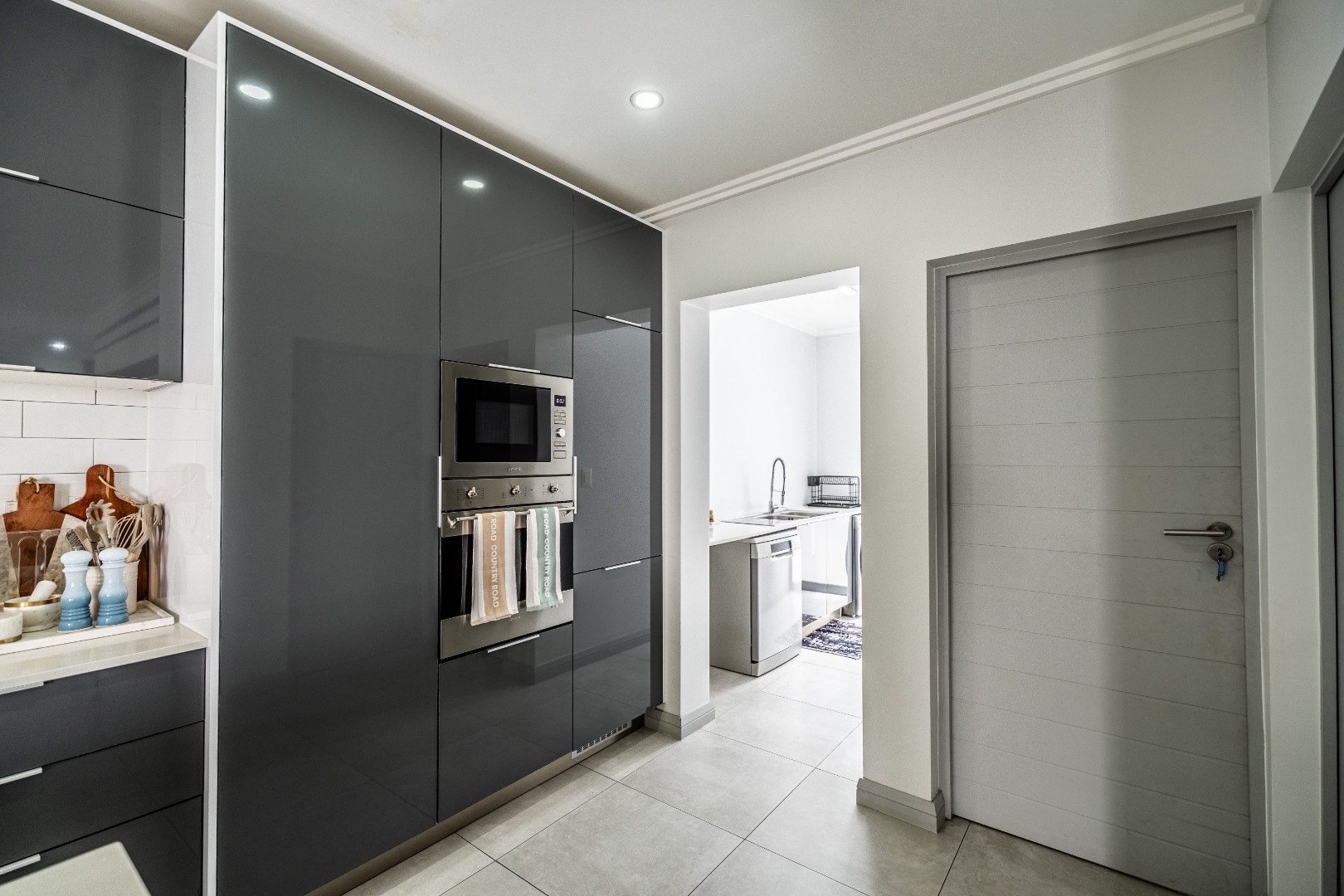 As you step inside, you are greeted by a spacious open-plan living area encompassing a welcoming lounge, dining space, and a stunning designer kitchen. The kitchen features high-gloss cabinetry, ample storage, and a centre island with breakfast bar — perfect for family gatherings or entertaining. Quality appliances include a gas hob with extractor fan, eye-level oven, integrated fridge, and integrated microwave, while the separate scullery provides space for three under-counter appliances.
