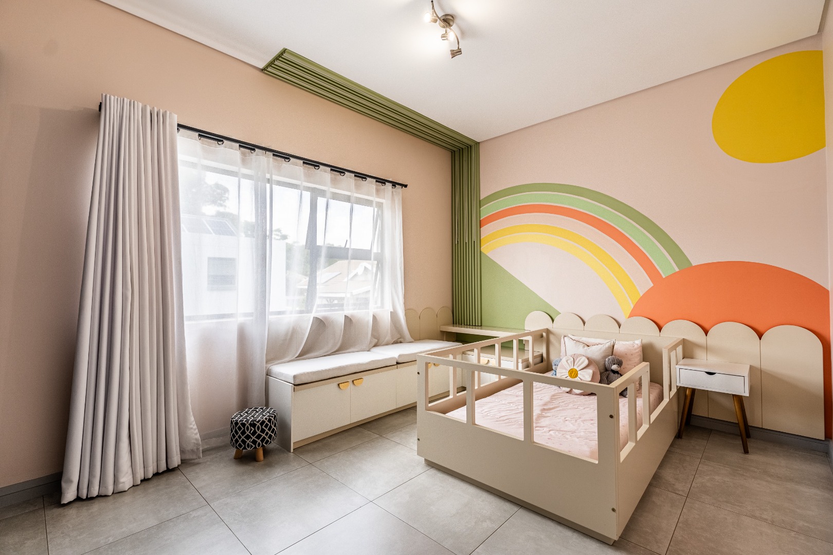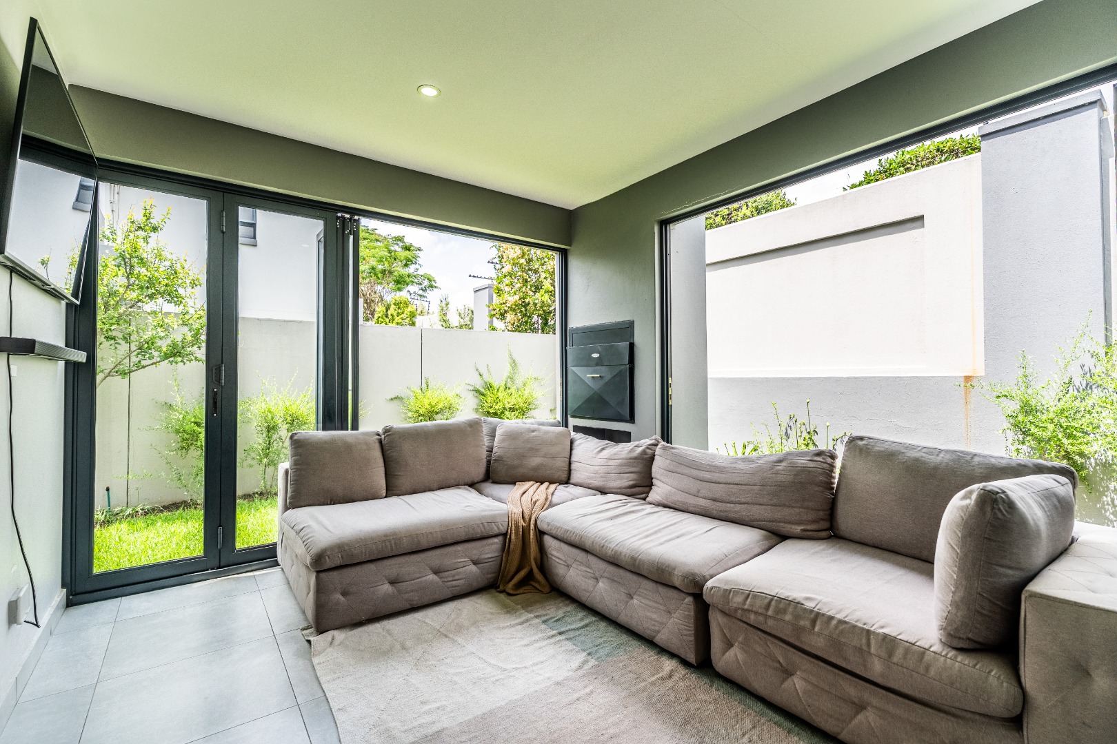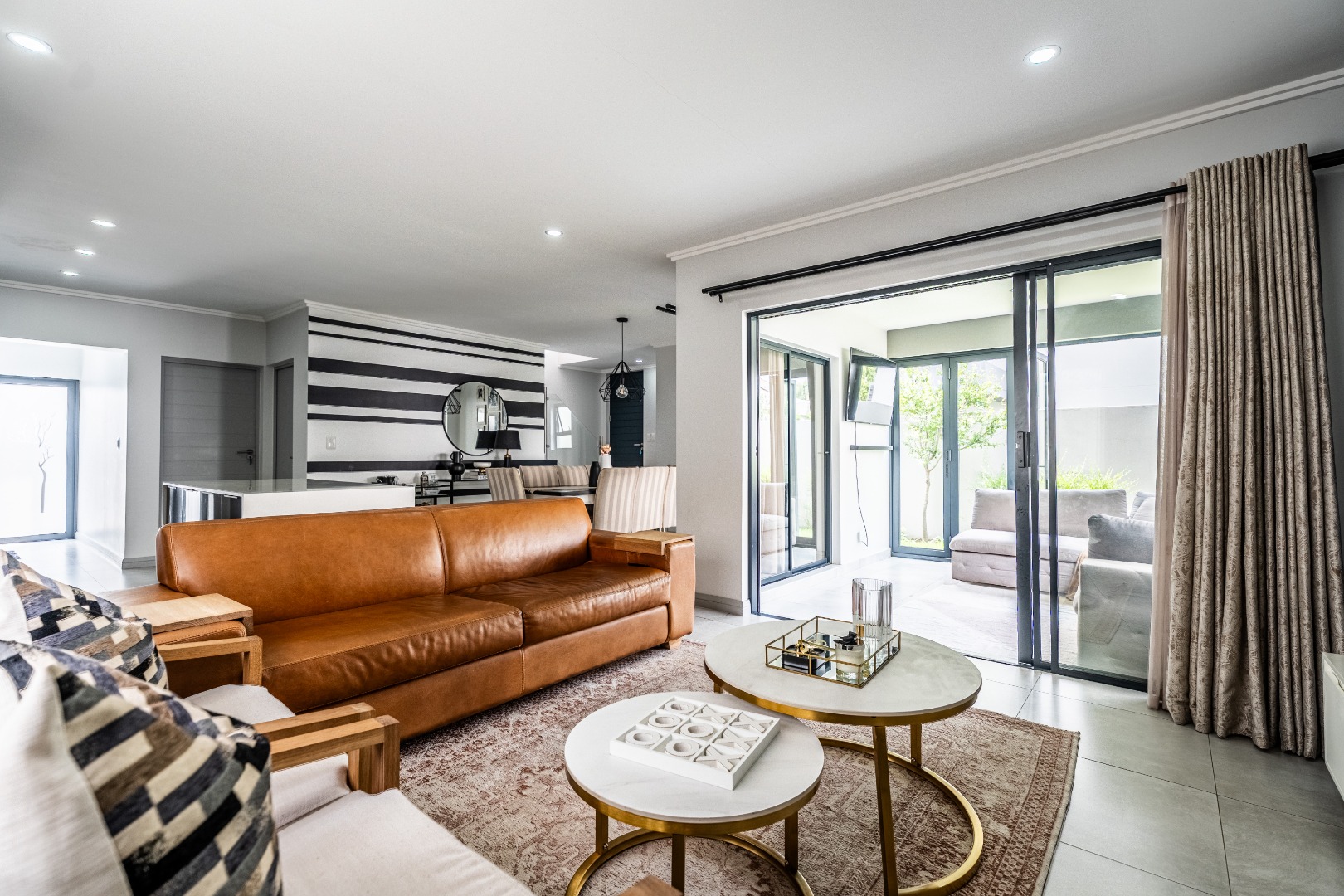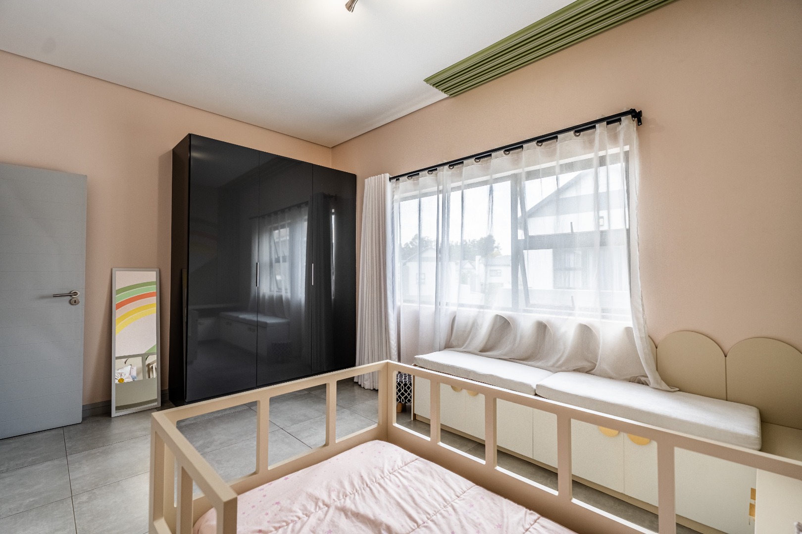 Extending from the living area, the enclosed patio with built-in braai offers versatility as a second lounge, recreation room, or entertainment space. Expansive glass stacking doors open out to the wrap-around garden, creating a light-filled flow between the indoors and outdoors.