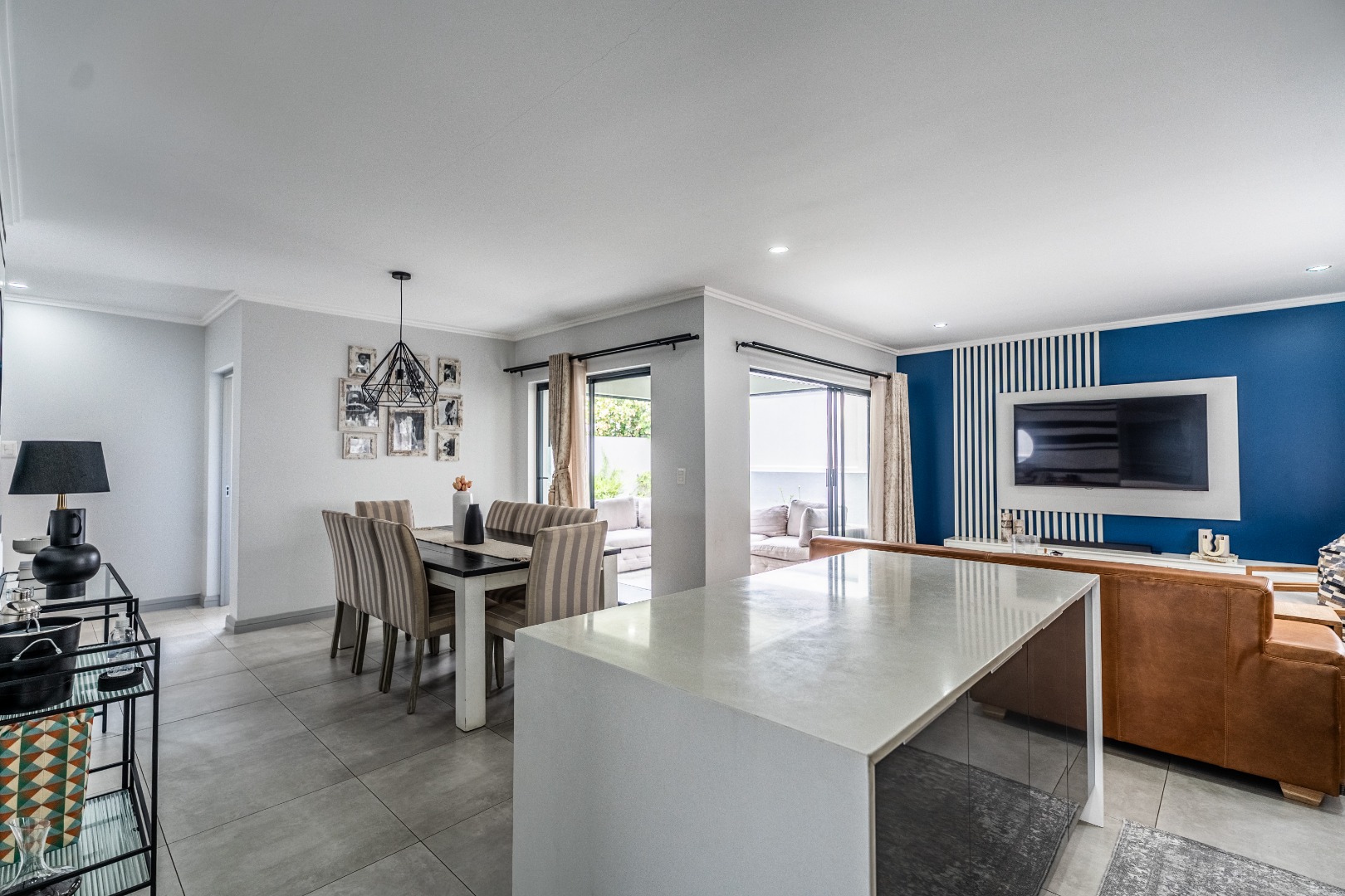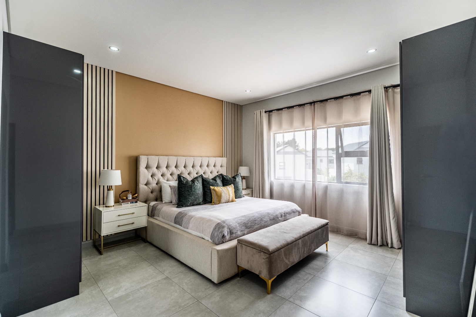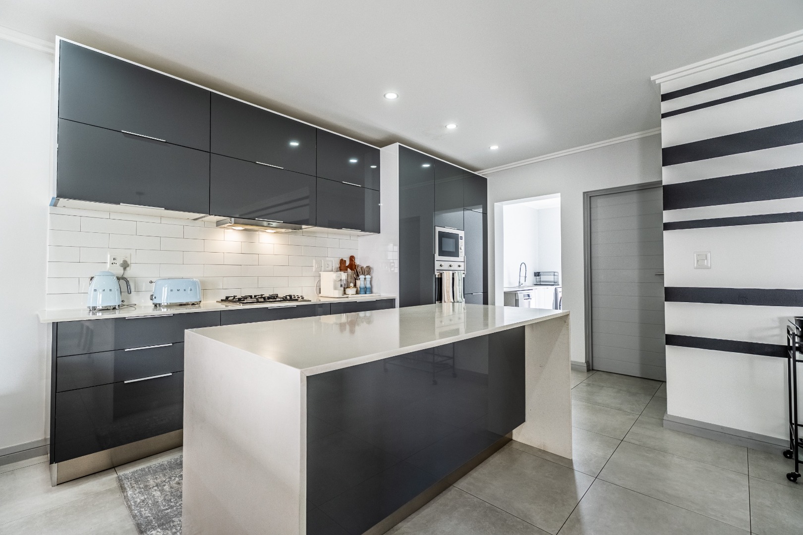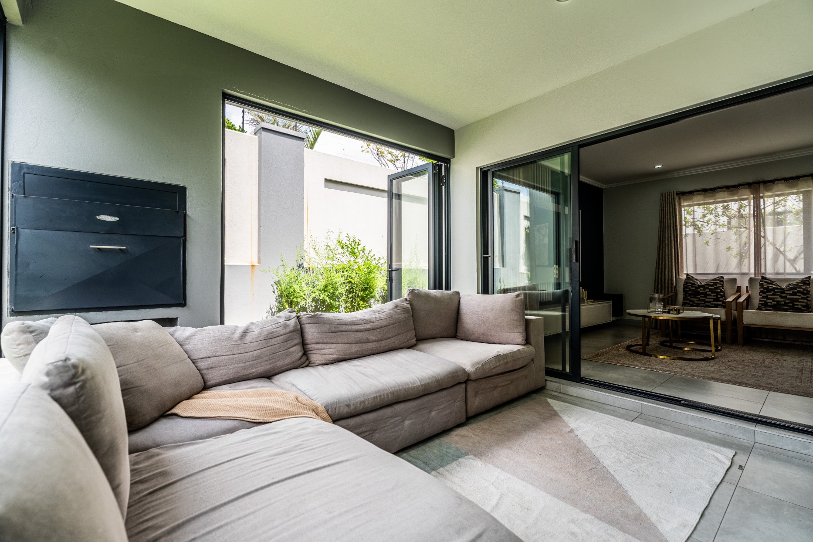 Extending from the living area, the enclosed patio with built-in braai offers versatility as a second lounge, recreation room, or entertainment space. Expansive glass stacking doors open out to the wrap-around garden, creating a light-filled flow between the indoors and outdoors.