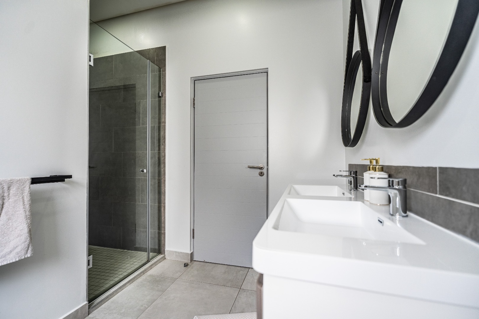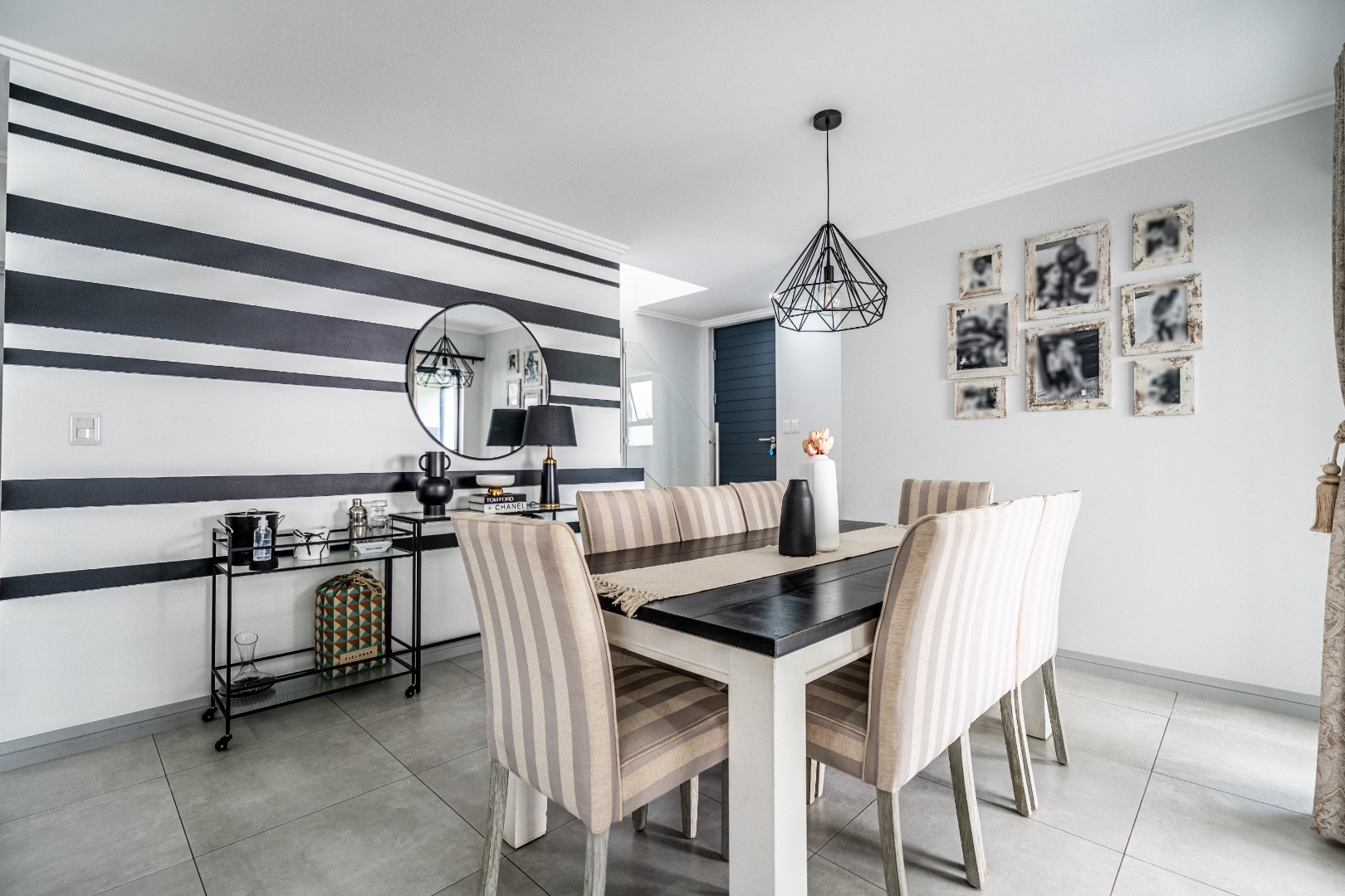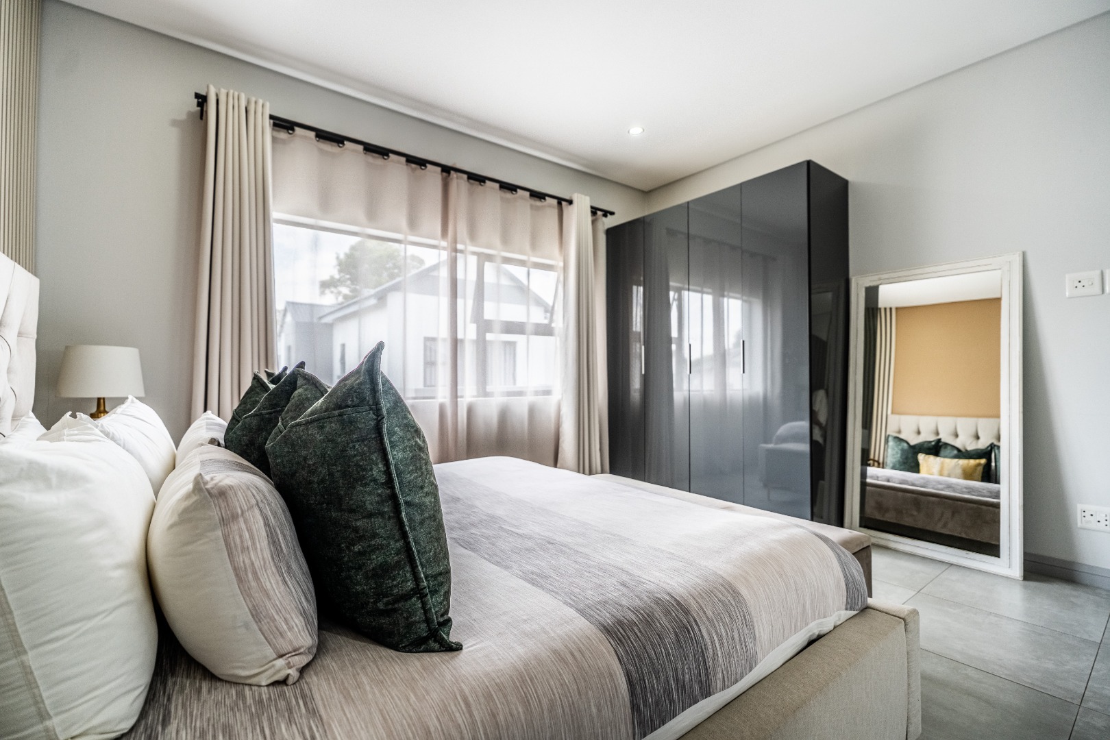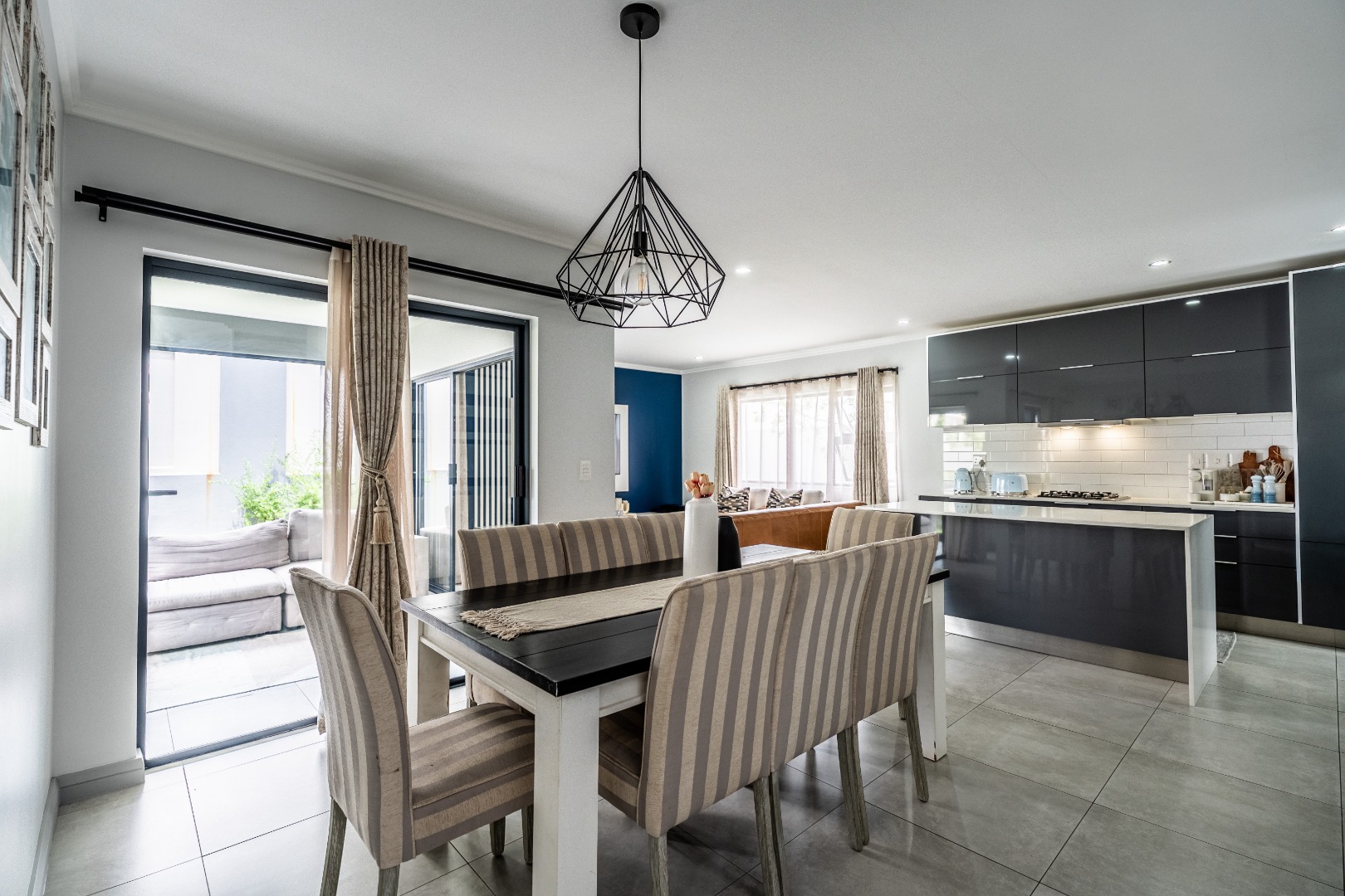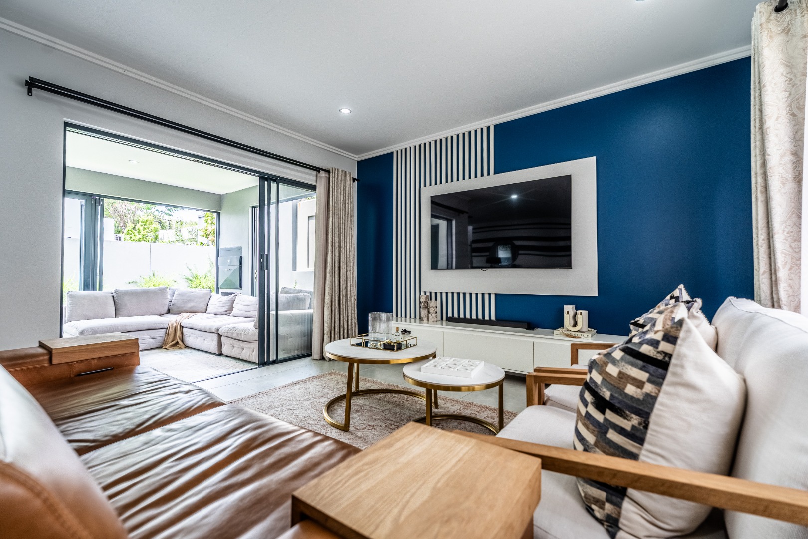 Extending from the living area, the enclosed patio with built-in braai offers versatility as a second lounge, recreation room, or entertainment space. Expansive glass stacking doors open out to the wrap-around garden, creating a light-filled flow between the indoors and outdoors.