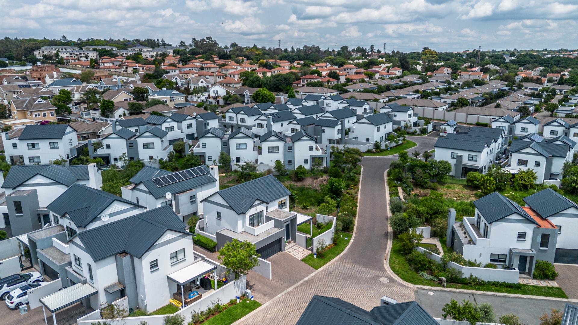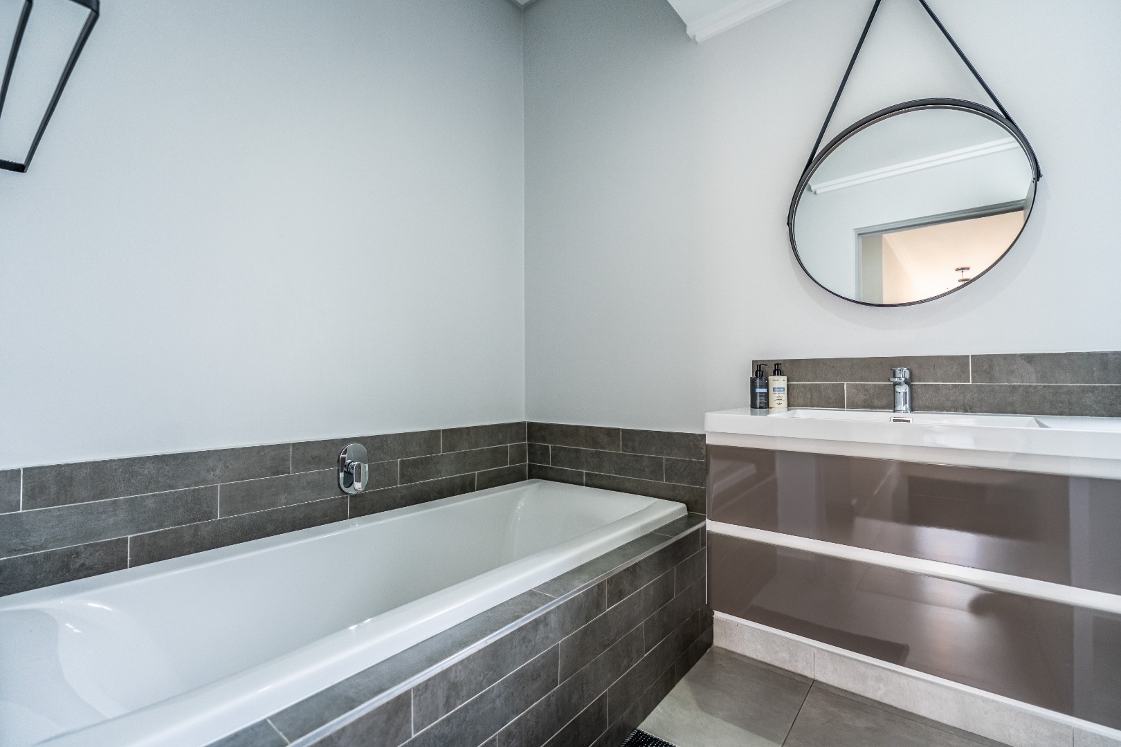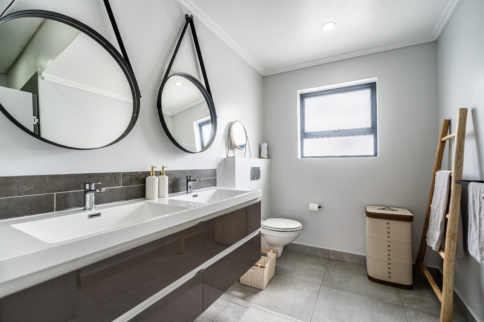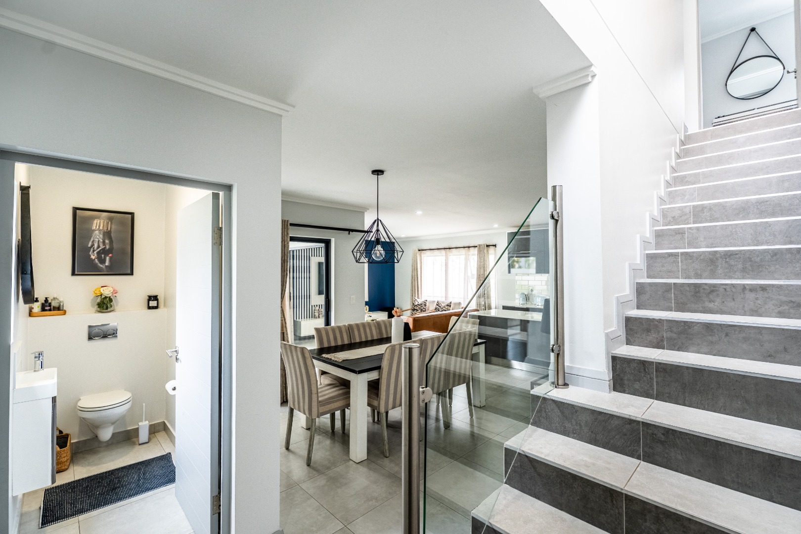 Extending from the living area, the enclosed patio with built-in braai offers versatility as a second lounge, recreation room, or entertainment space. Expansive glass stacking doors open out to the wrap-around garden, creating a light-filled flow between the indoors and outdoors.
