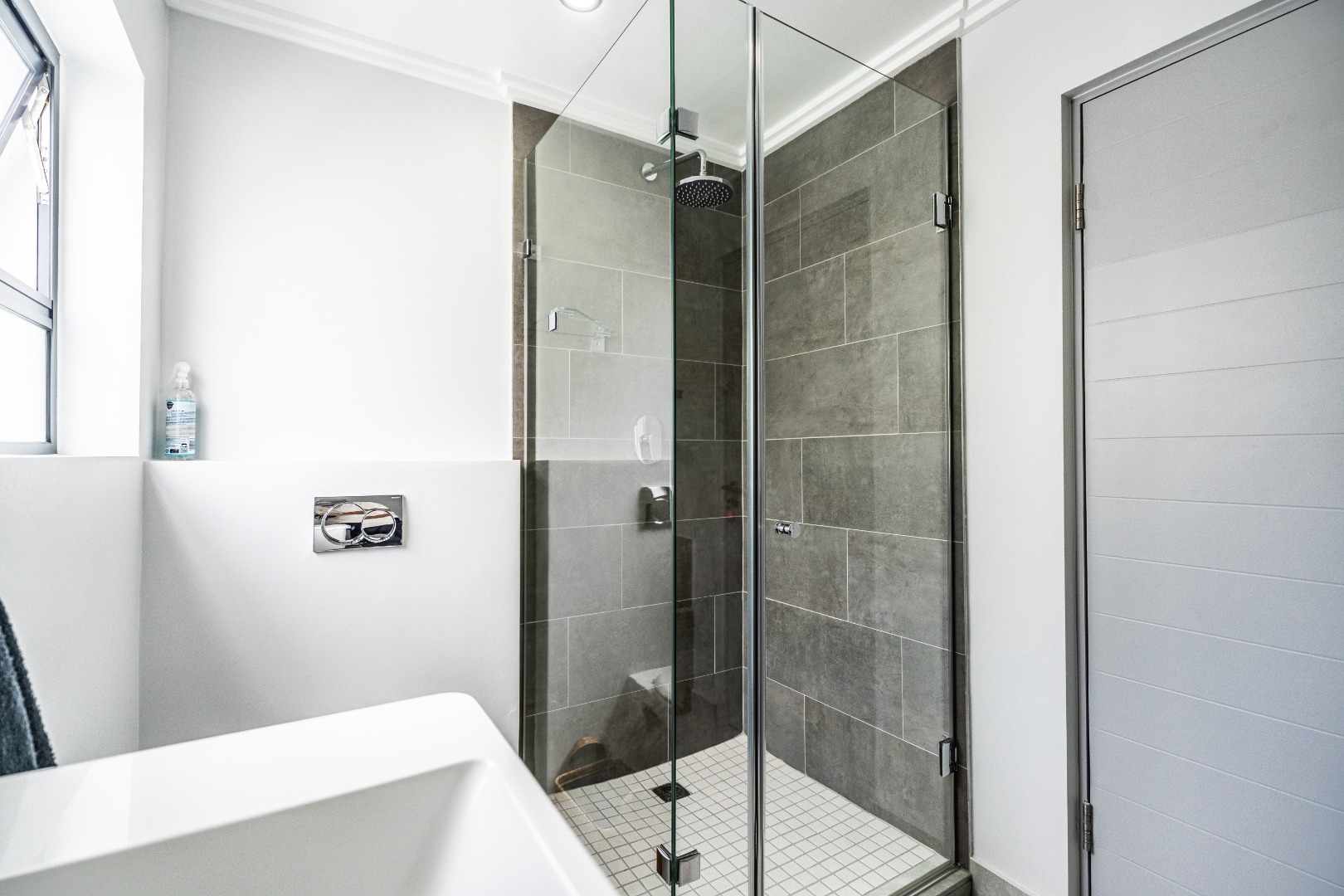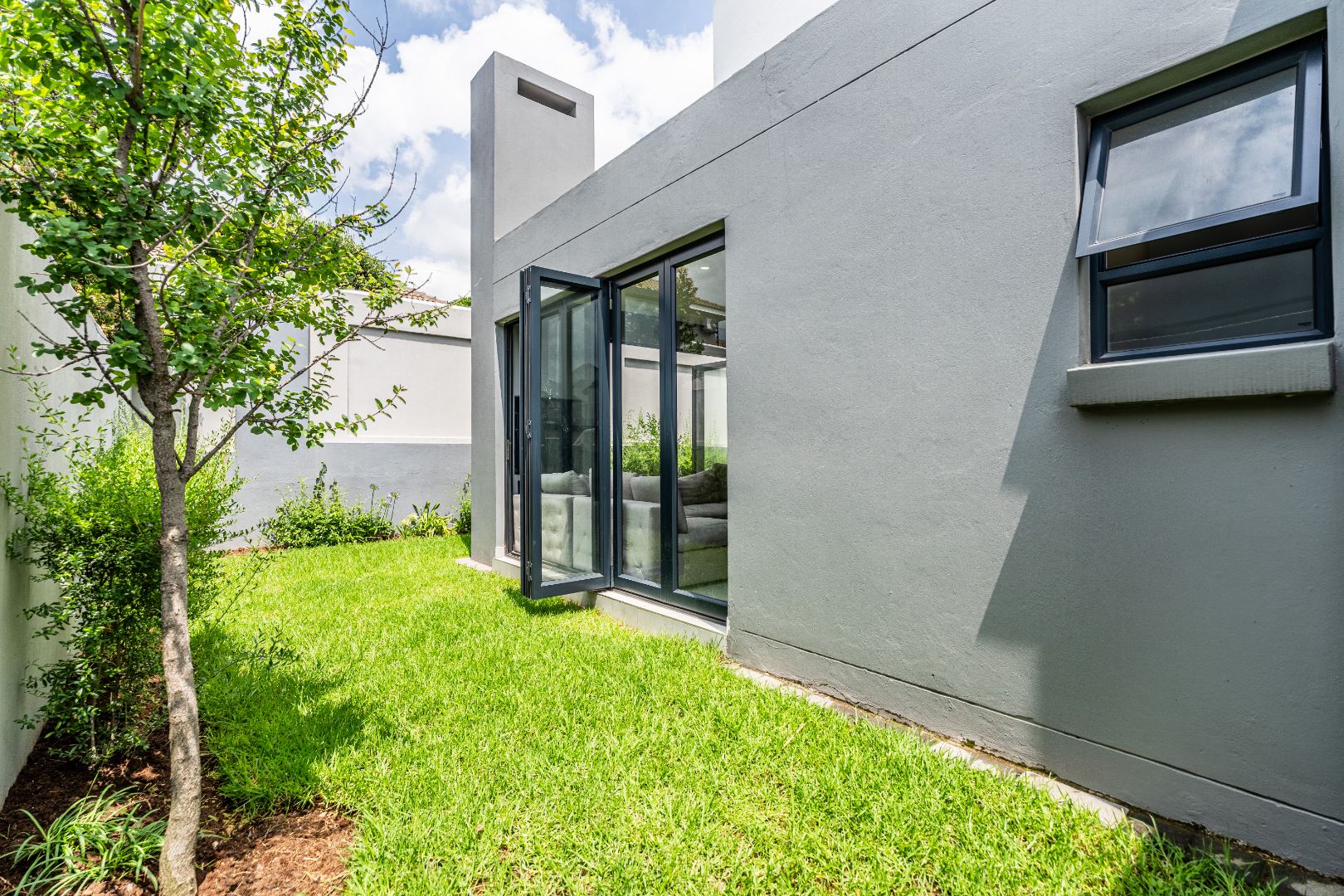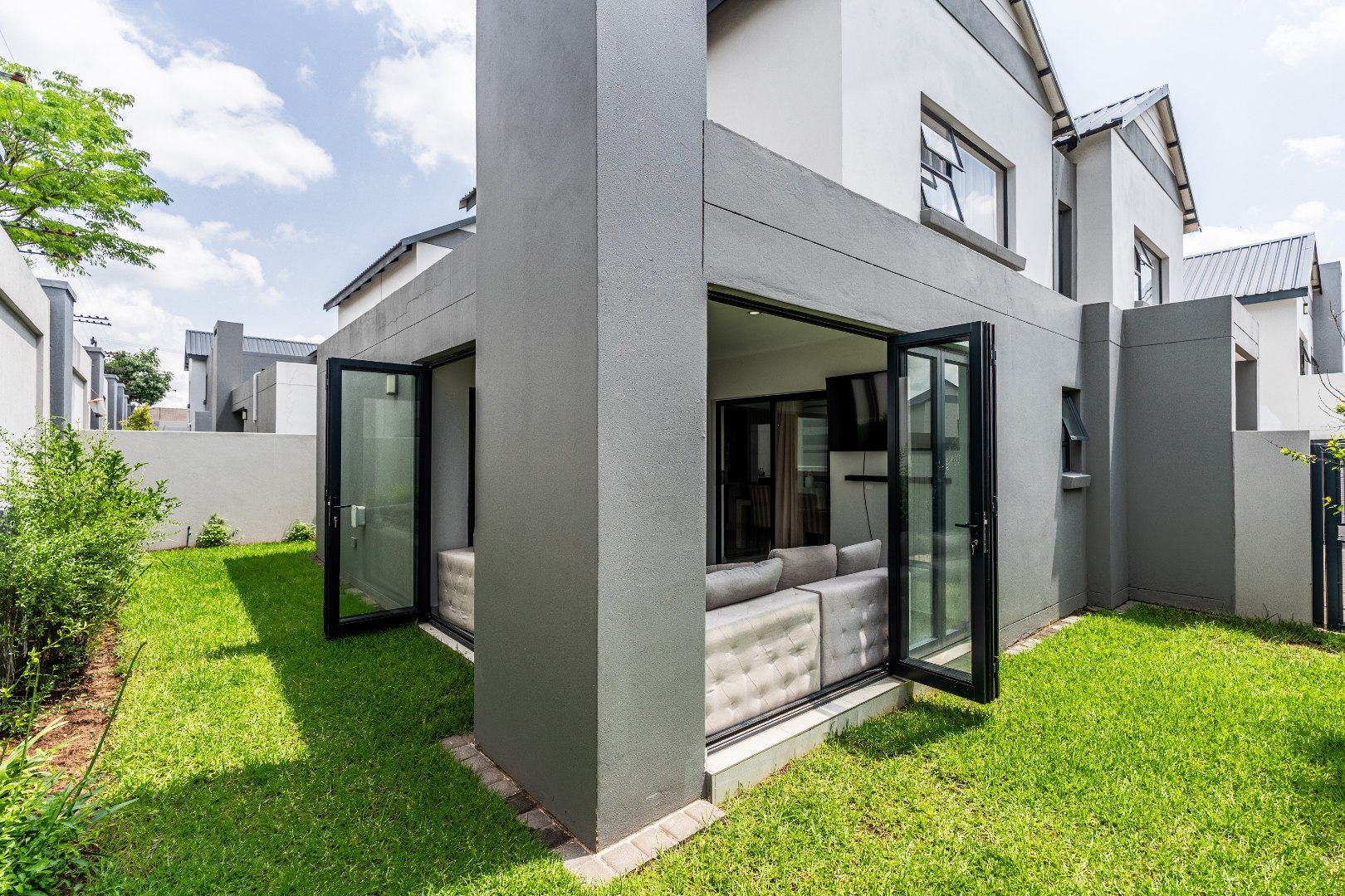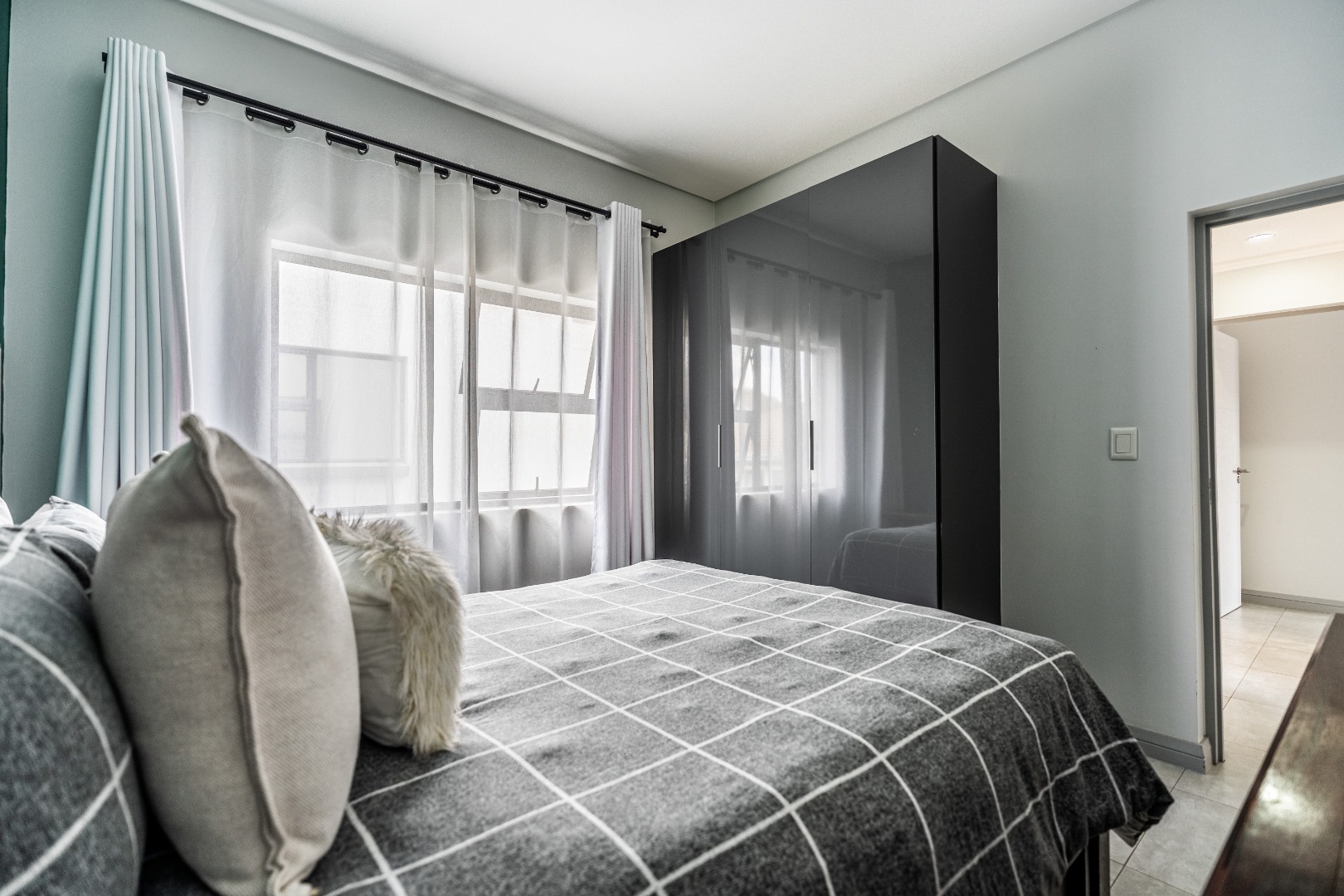Extending from the living area, the enclosed patio with built-in braai offers versatility as a second lounge, recreation room, or entertainment space. Expansive glass stacking doors open out to the wrap-around garden, creating a light-filled flow between the indoors and outdoors.