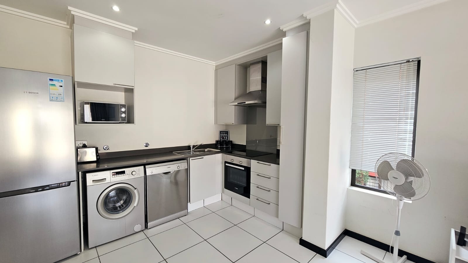 The heart of this home is its open-plan living area, seamlessly integrating a lounge and a modern kitchen. The kitchen boasts sleek light grey cabinetry, dark countertops, and a suite of integrated Bosch stainless steel appliances, including a fridge, oven, hob, extractor fan, microwave, washing machine, and dishwasher. Tiled flooring extends throughout, ensuring a clean and cohesive aesthetic.