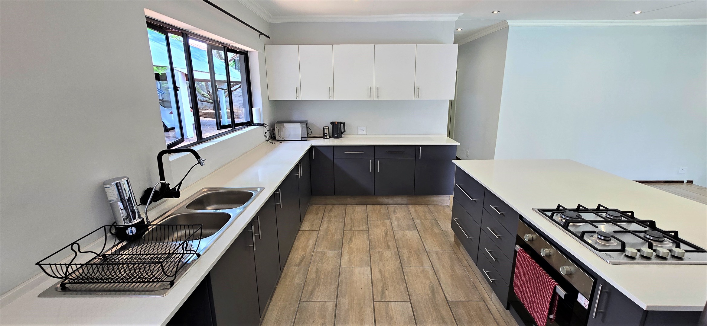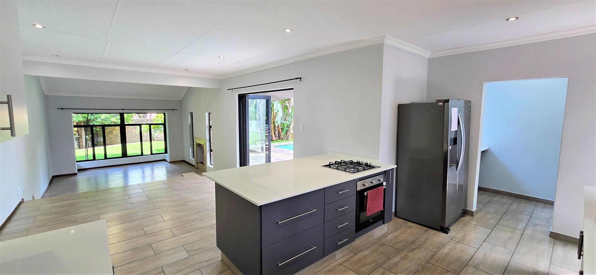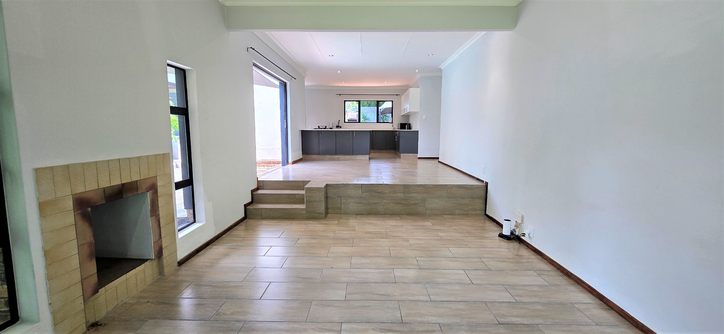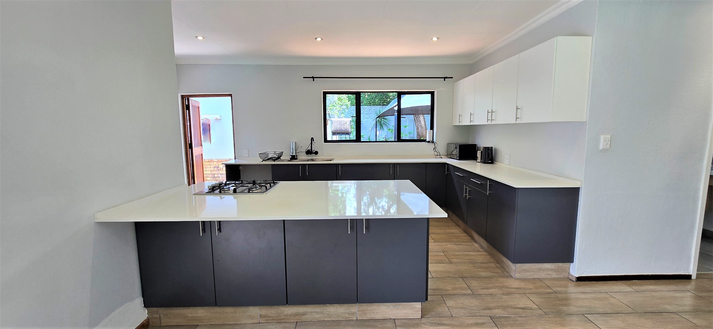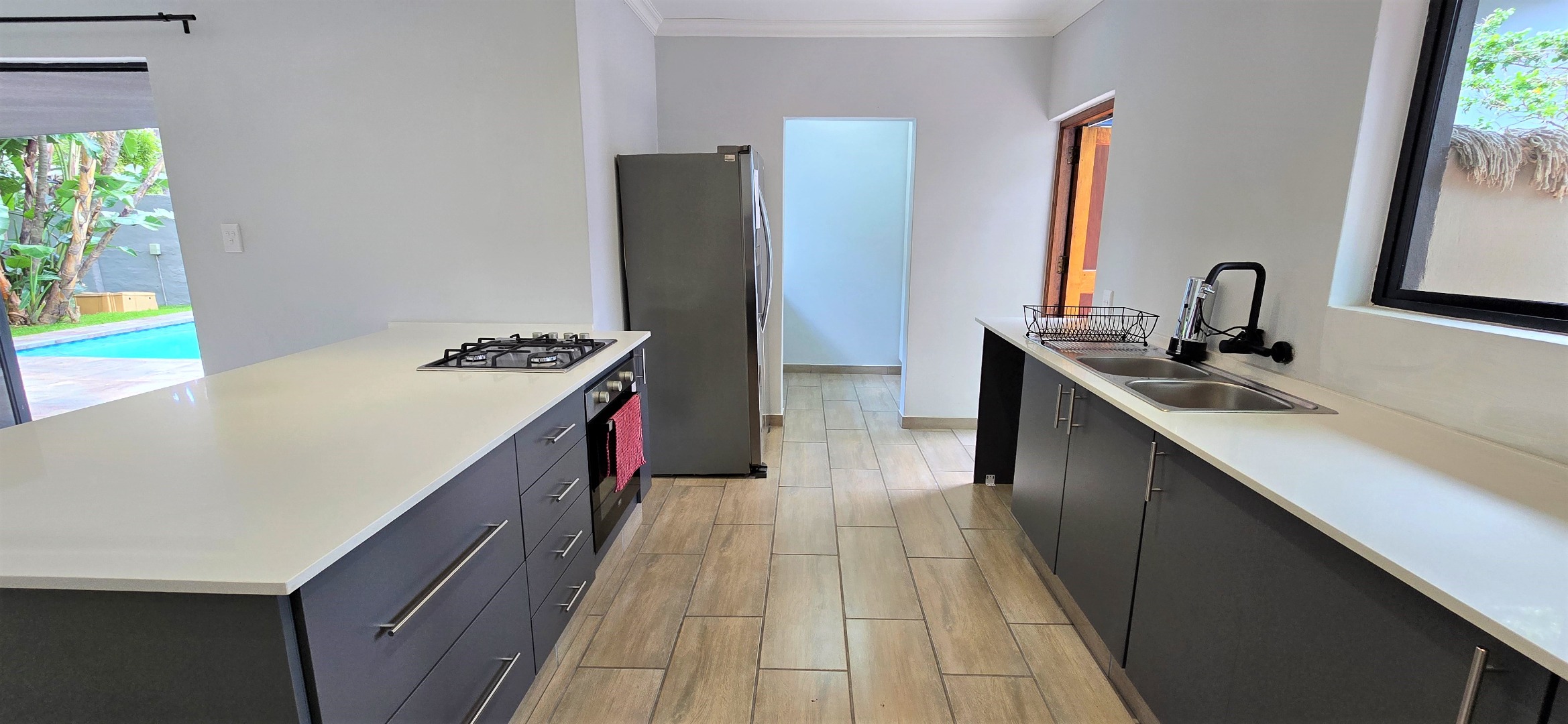 This inviting tropical home offers a spacious and modern living experience in the highly sought-after suburb of Lonehill. The main residence features two well-appointed bedrooms and two bathrooms, complemented by a separate back building that includes a third bedroom and bathroom—ideal for guests, a home office, or a private flatlet. Designed with a stylish open-plan, split-level layout, the home provides distinct yet connected living zones that flow seamlessly between the dining room, and family TV room. The modern kitchen stands out with its two-tone cabinetry, light countertops, large island with a gas hob and built-in oven, and ample storage space. Throughout the living areas, durable tiled flooring and recessed lighting enhance the home’s modern appeal.