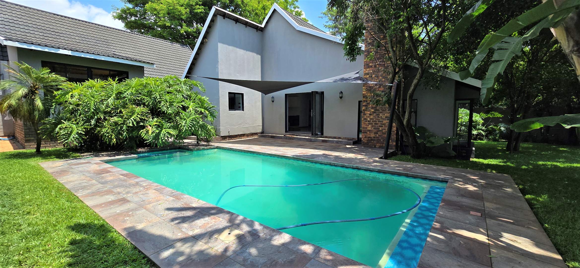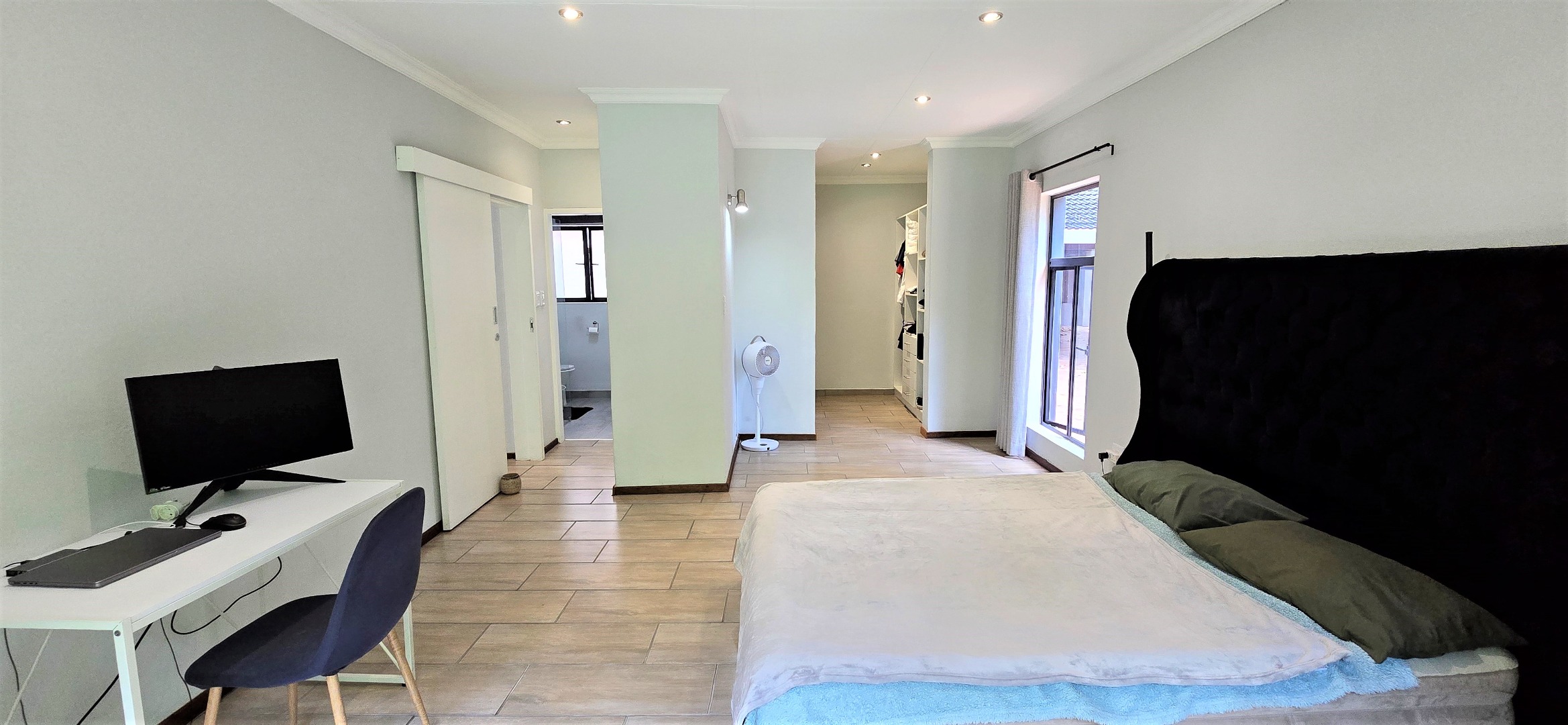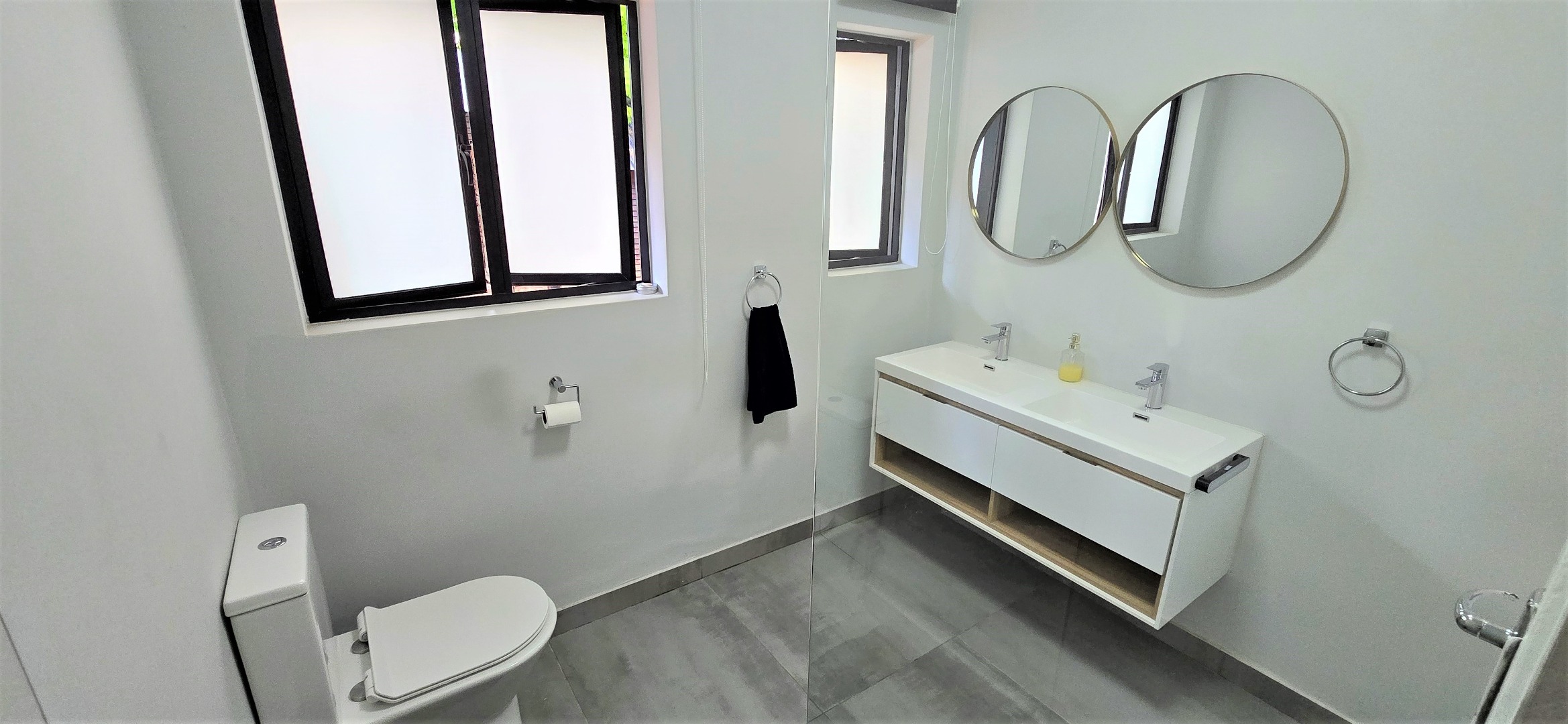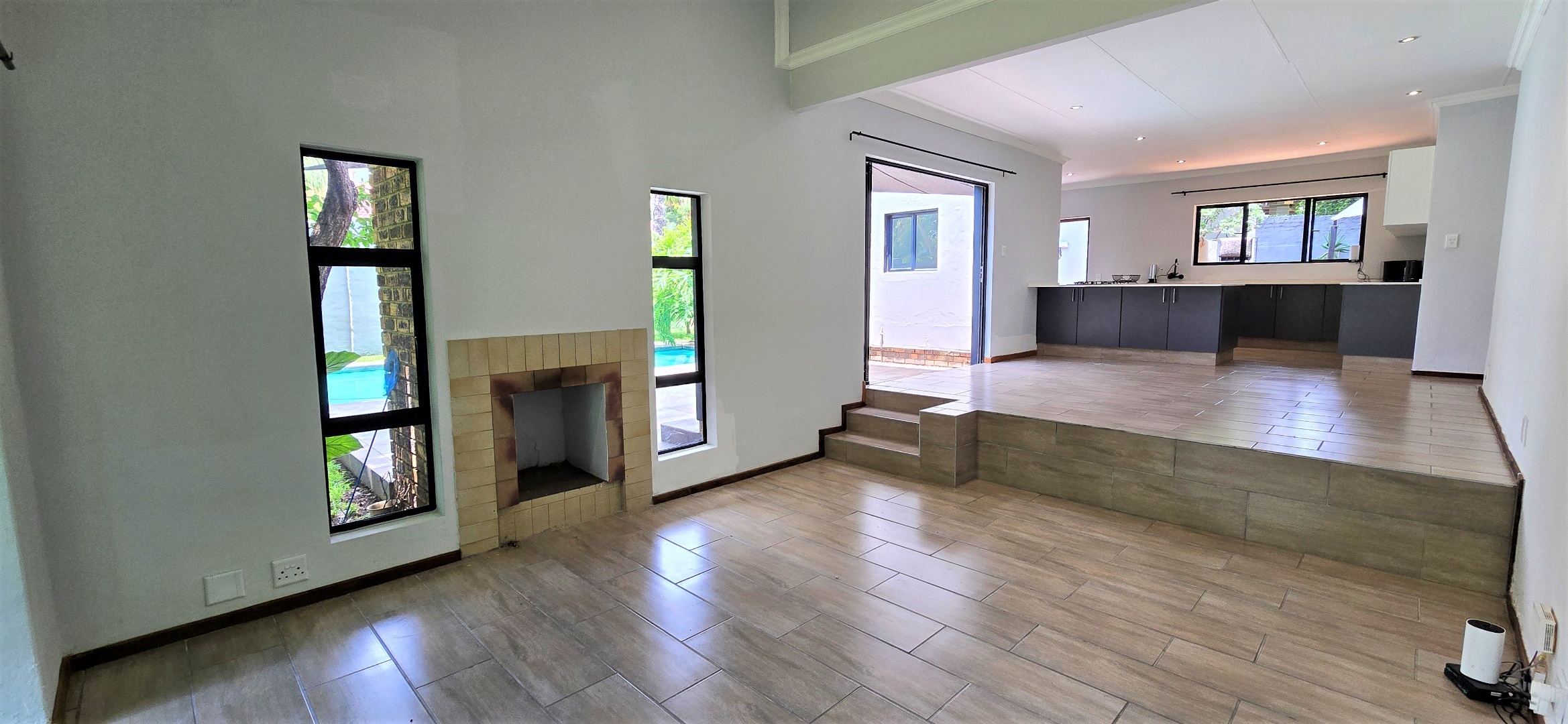 This inviting tropical home offers a spacious and modern living experience in the highly sought-after suburb of Lonehill. The main residence features two well-appointed bedrooms and two bathrooms, complemented by a separate back building that includes a third bedroom and bathroom—ideal for guests, a home office, or a private flatlet. Designed with a stylish open-plan, split-level layout, the home provides distinct yet connected living zones that flow seamlessly between the dining room, and family TV room. The modern kitchen stands out with its two-tone cabinetry, light countertops, large island with a gas hob and built-in oven, and ample storage space. Throughout the living areas, durable tiled flooring and recessed lighting enhance the home’s modern appeal.