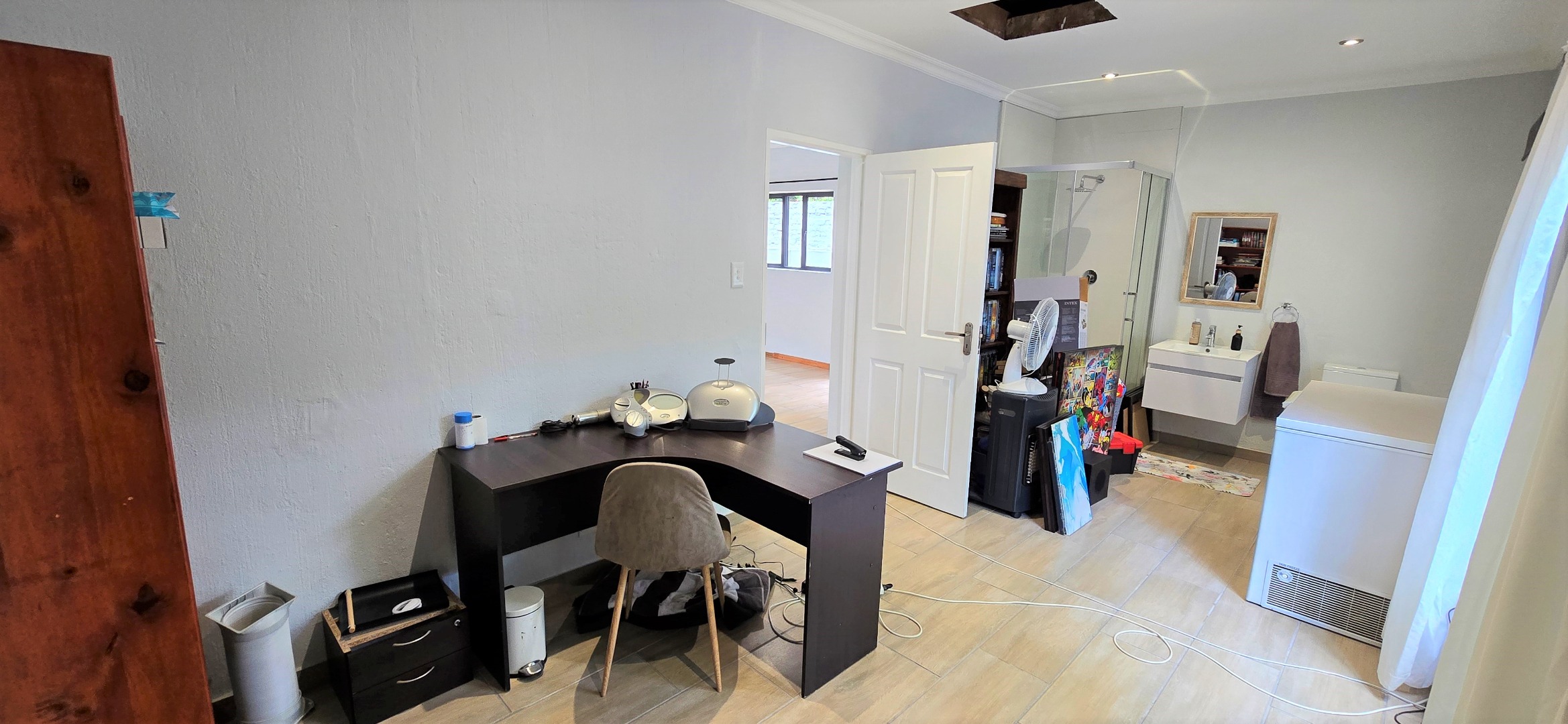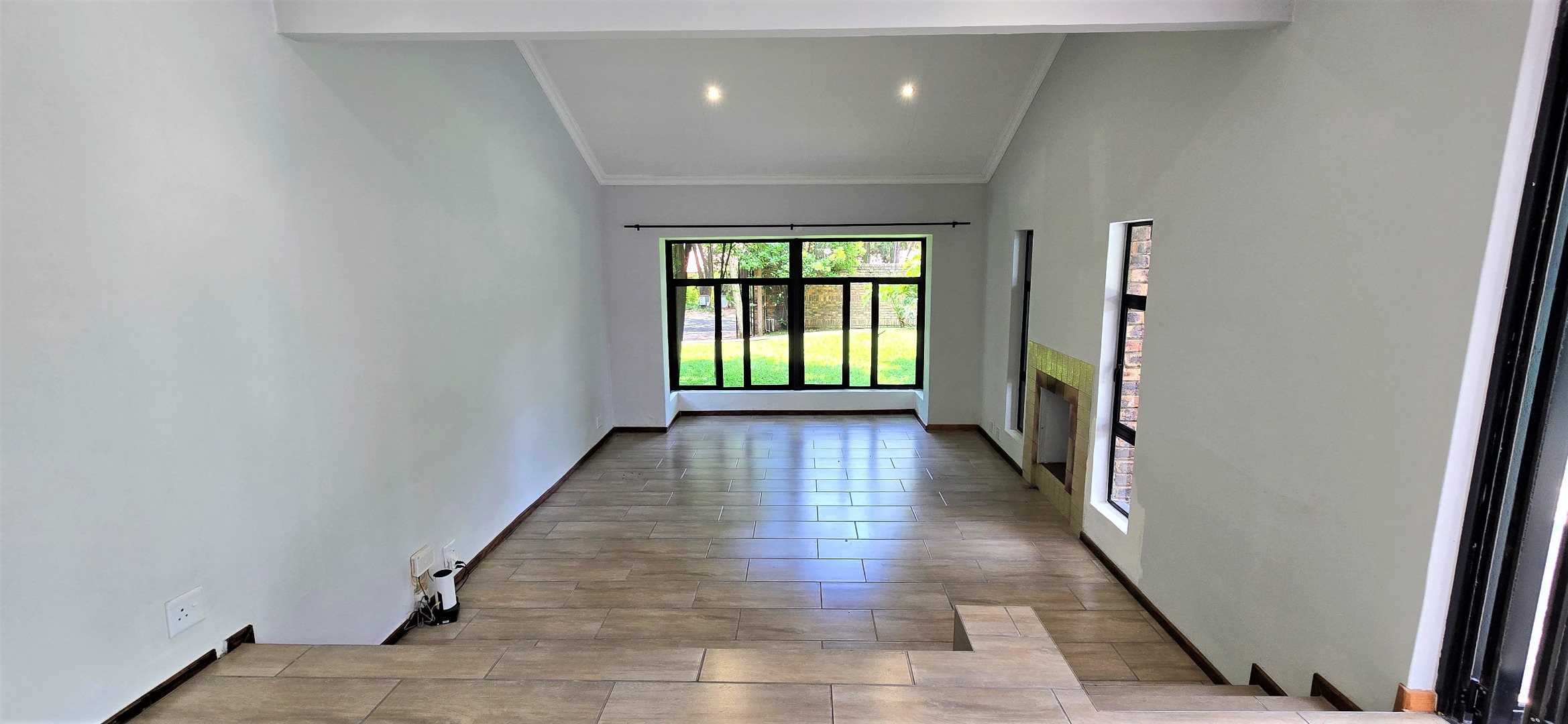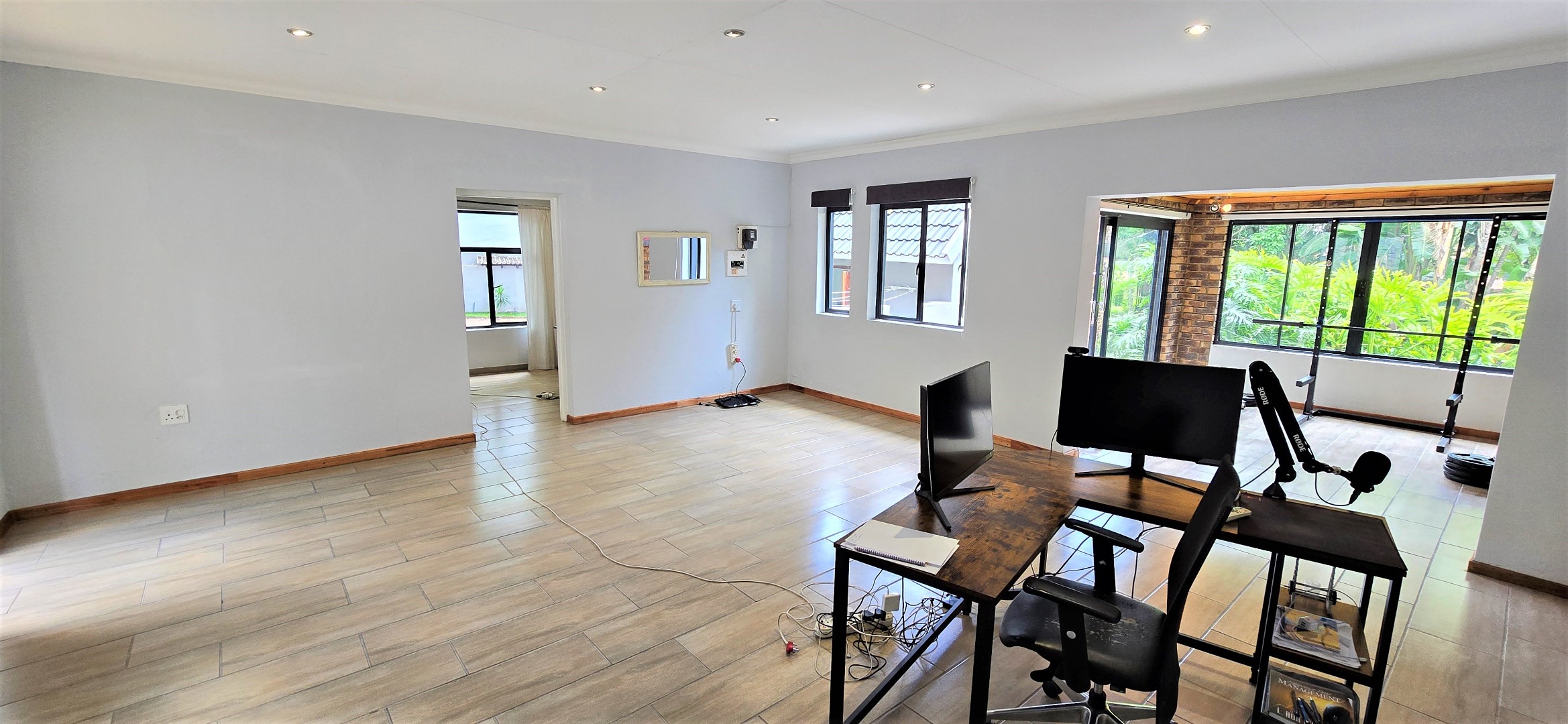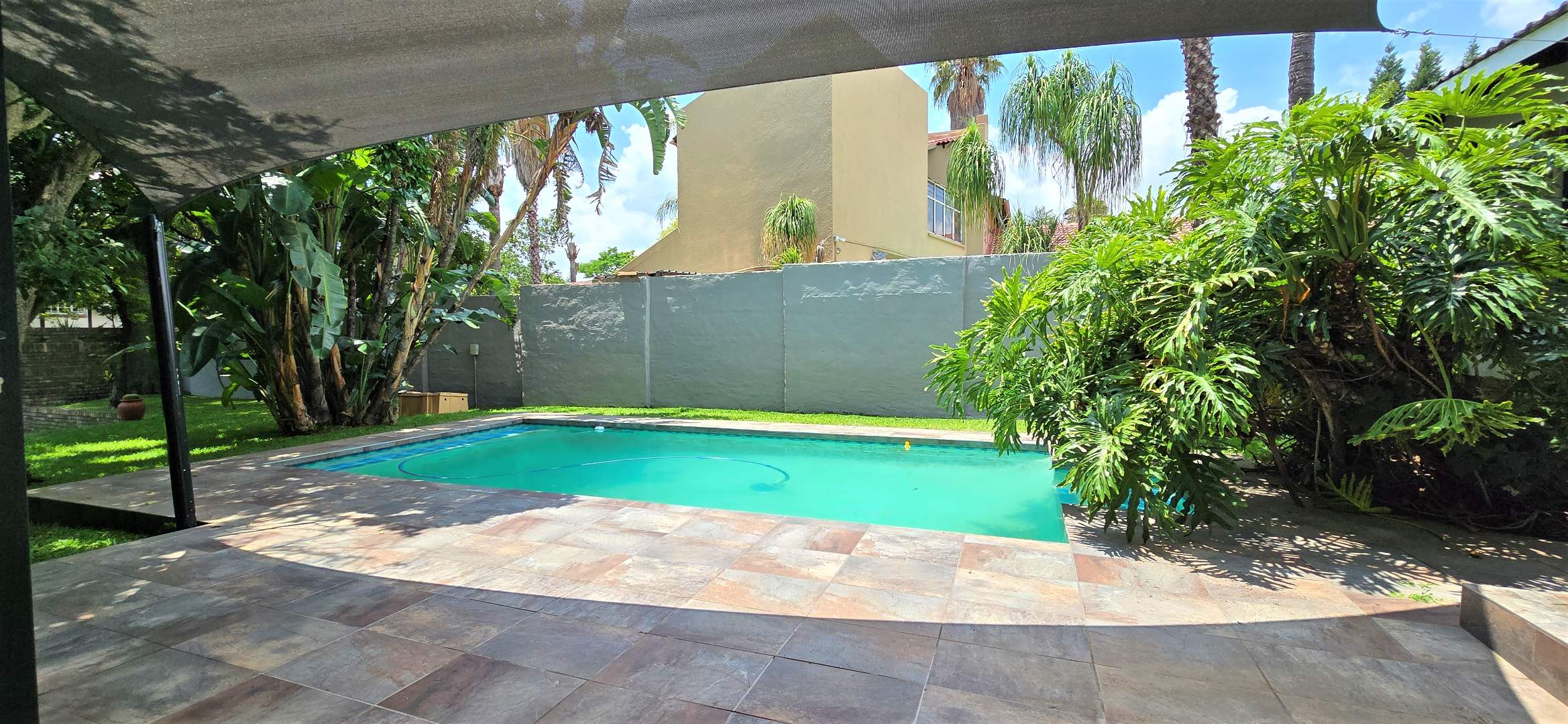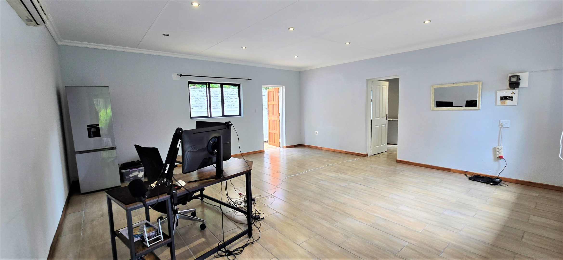 This inviting tropical home offers a spacious and modern living experience in the highly sought-after suburb of Lonehill. The main residence features two well-appointed bedrooms and two bathrooms, complemented by a separate back building that includes a third bedroom and bathroom—ideal for guests, a home office, or a private flatlet. Designed with a stylish open-plan, split-level layout, the home provides distinct yet connected living zones that flow seamlessly between the dining room, and family TV room. The modern kitchen stands out with its two-tone cabinetry, light countertops, large island with a gas hob and built-in oven, and ample storage space. Throughout the living areas, durable tiled flooring and recessed lighting enhance the home’s modern appeal.