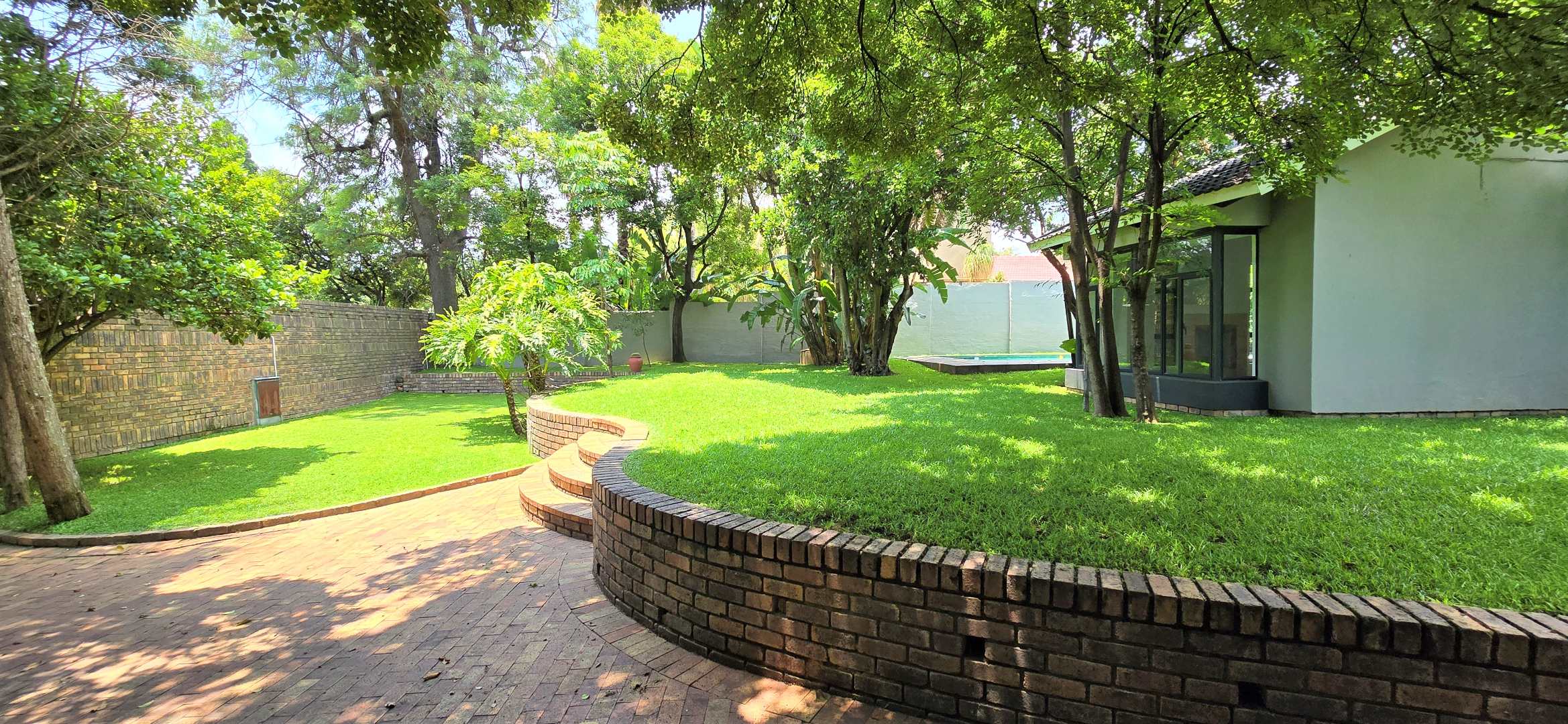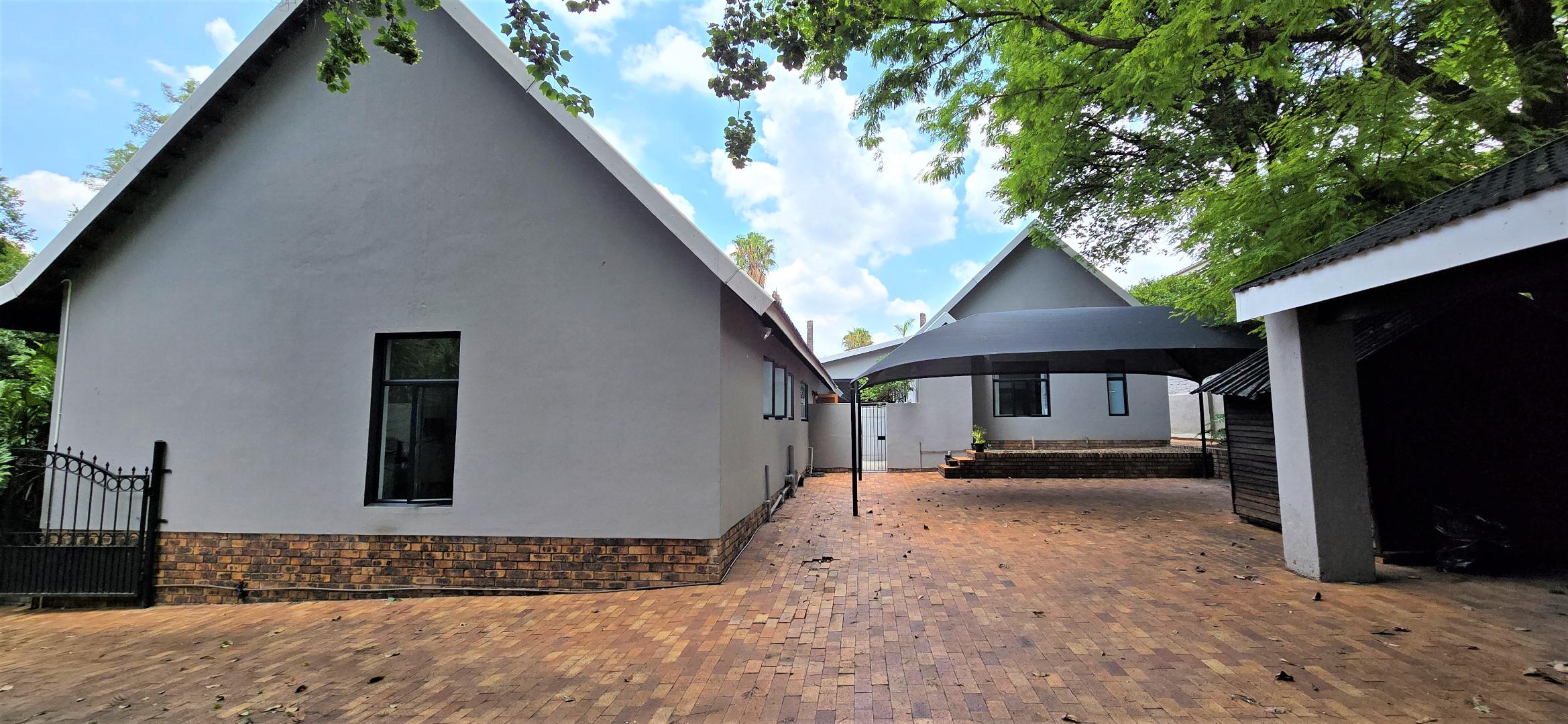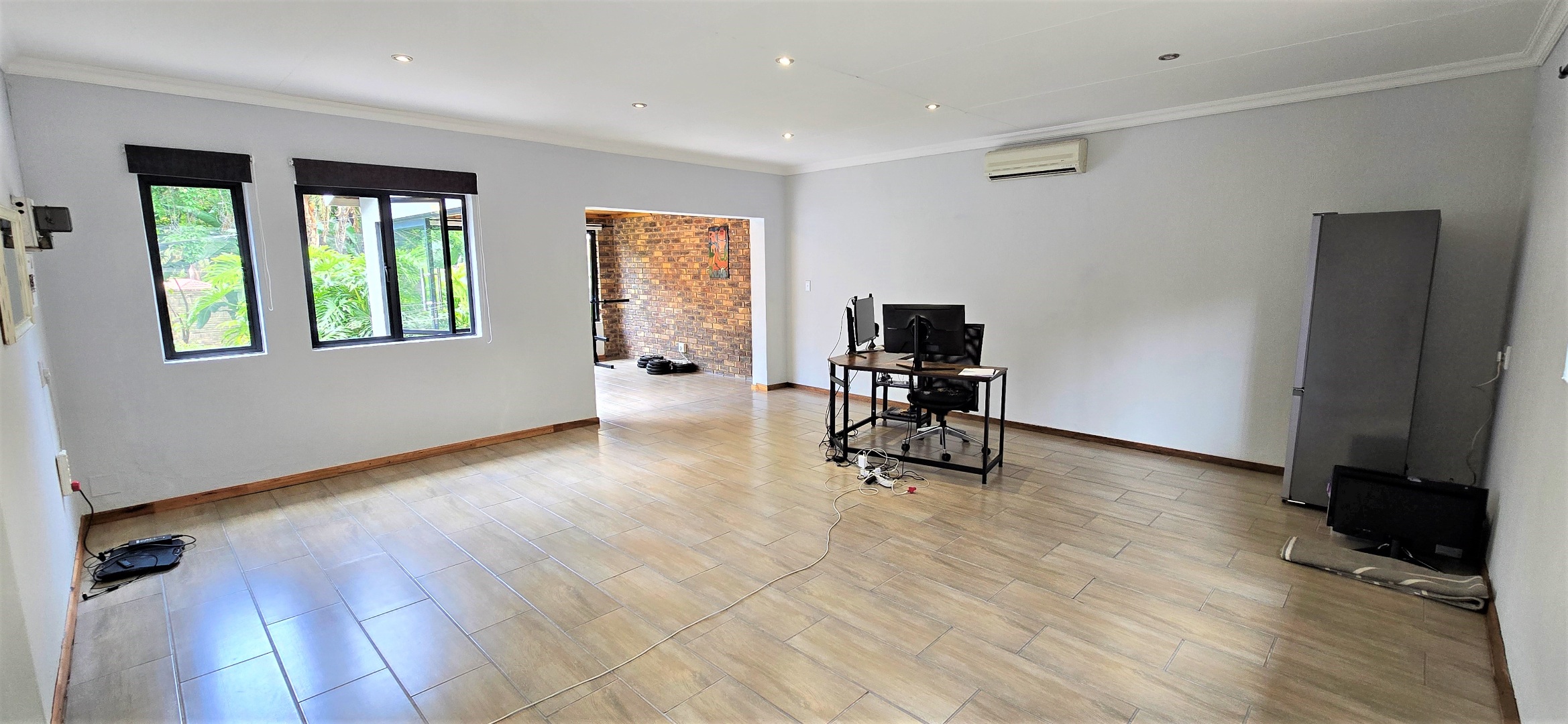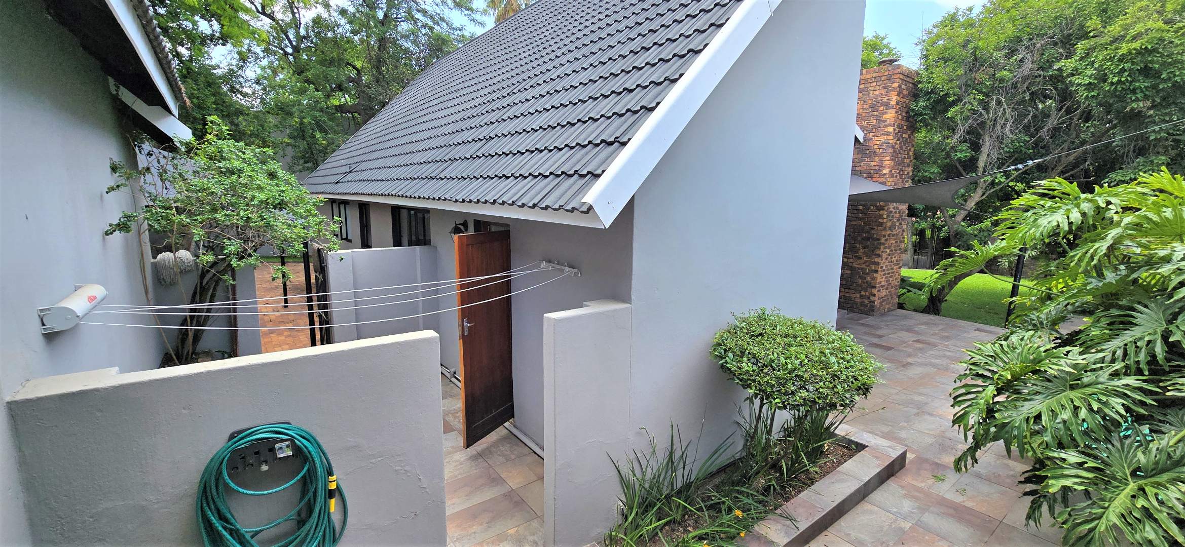 This inviting tropical home offers a spacious and modern living experience in the highly sought-after suburb of Lonehill. The main residence features two well-appointed bedrooms and two bathrooms, complemented by a separate back building that includes a third bedroom and bathroom—ideal for guests, a home office, or a private flatlet. Designed with a stylish open-plan, split-level layout, the home provides distinct yet connected living zones that flow seamlessly between the dining room, and family TV room. The modern kitchen stands out with its two-tone cabinetry, light countertops, large island with a gas hob and built-in oven, and ample storage space. Throughout the living areas, durable tiled flooring and recessed lighting enhance the home’s modern appeal.