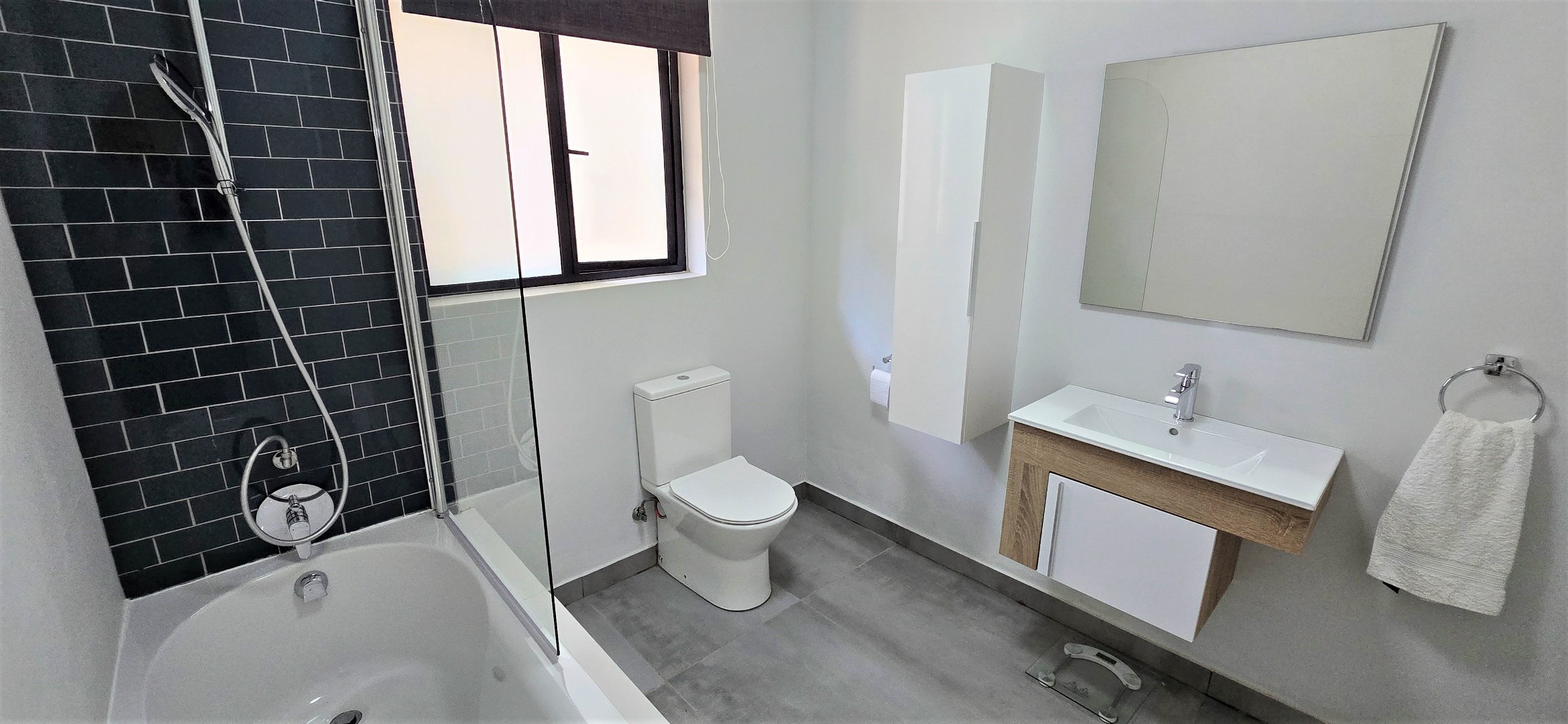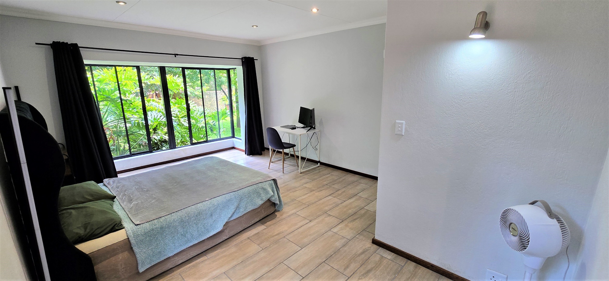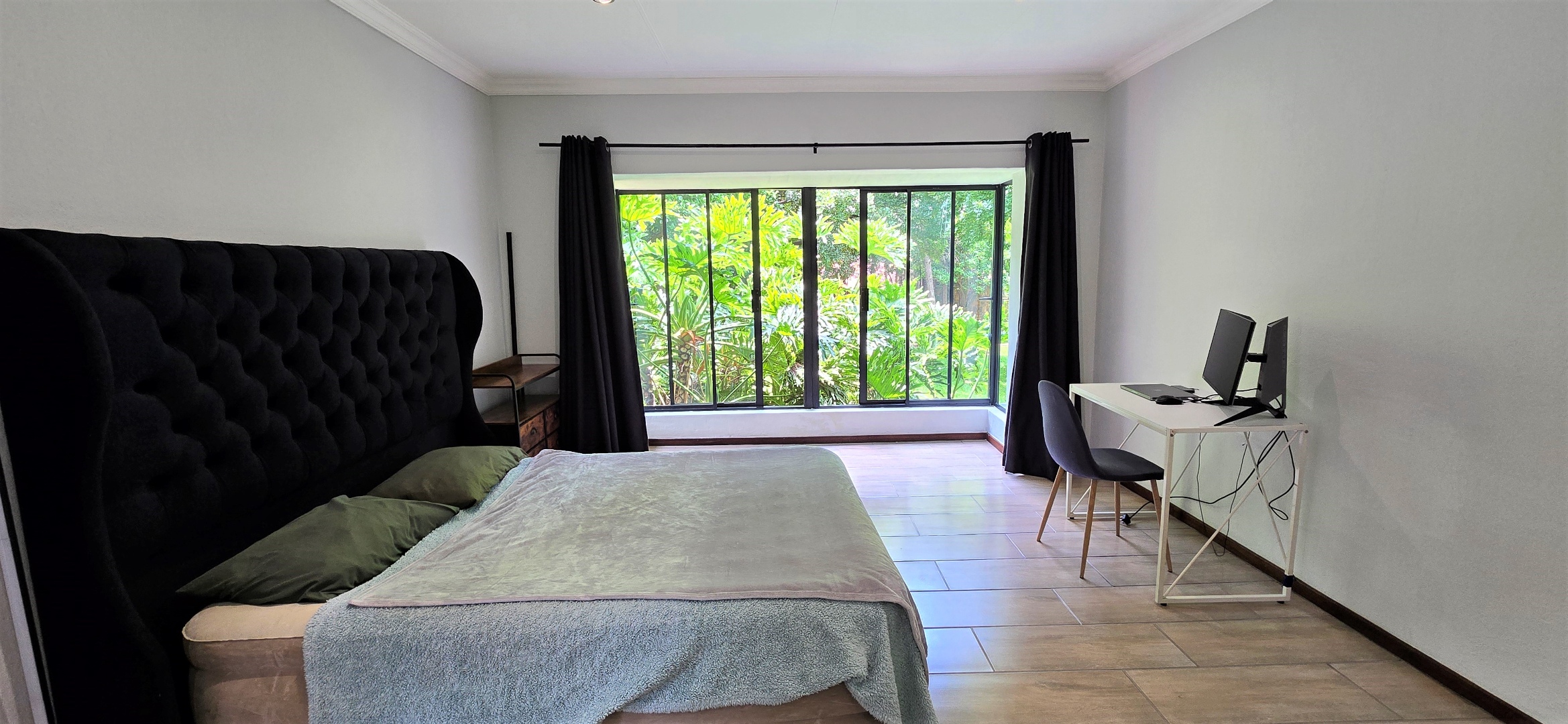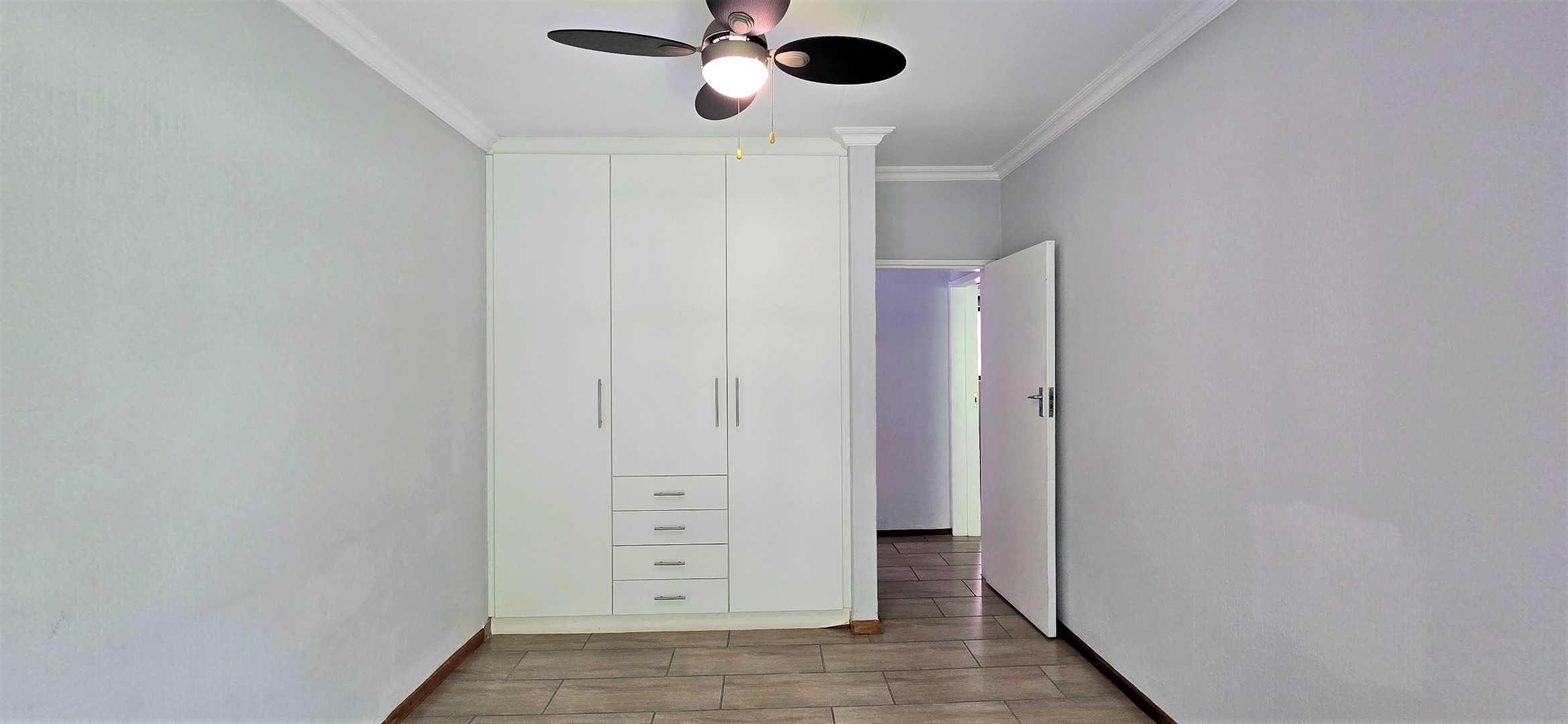 Down the passage, the main bedroom impresses with a walk-in closet, an en-suite bathroom, and large windows that fill the space with natural light while offering a beautiful view of the garden. The second bedroom enjoys easy access to a separate bathroom located along the passage, which also serves conveniently as a guest bathroom.