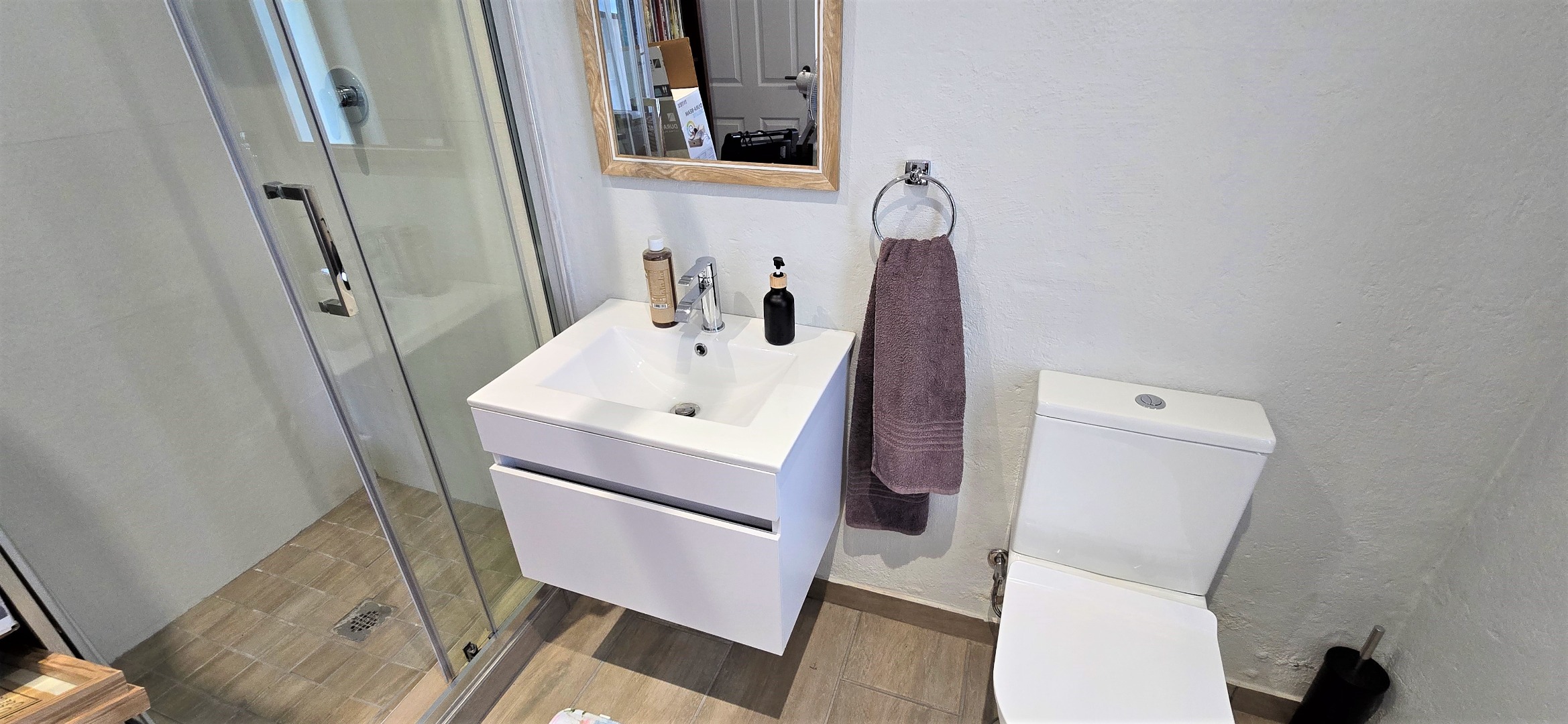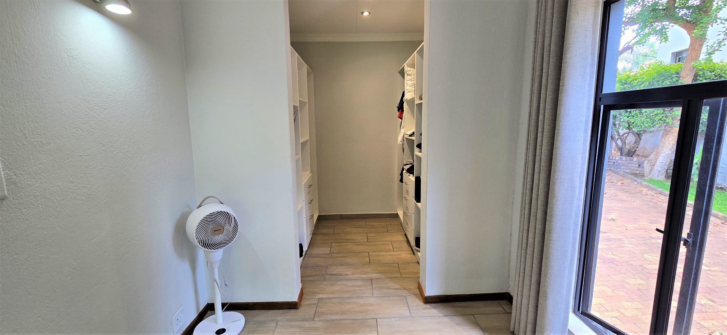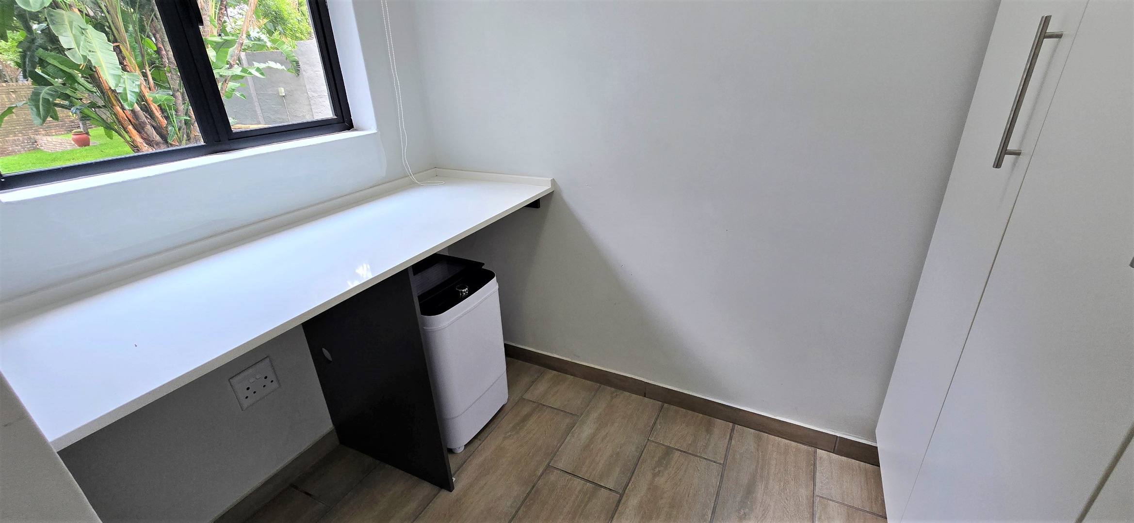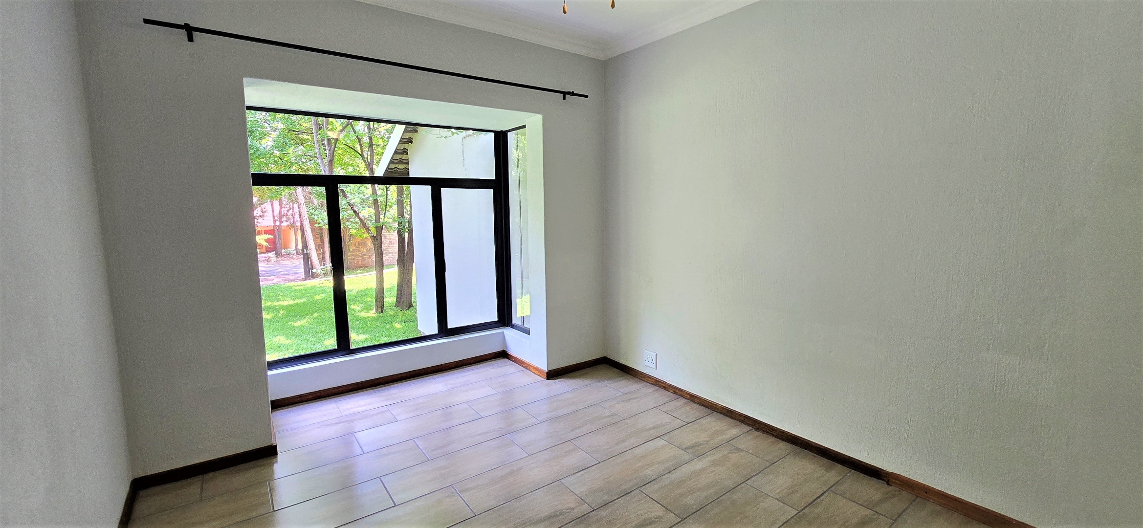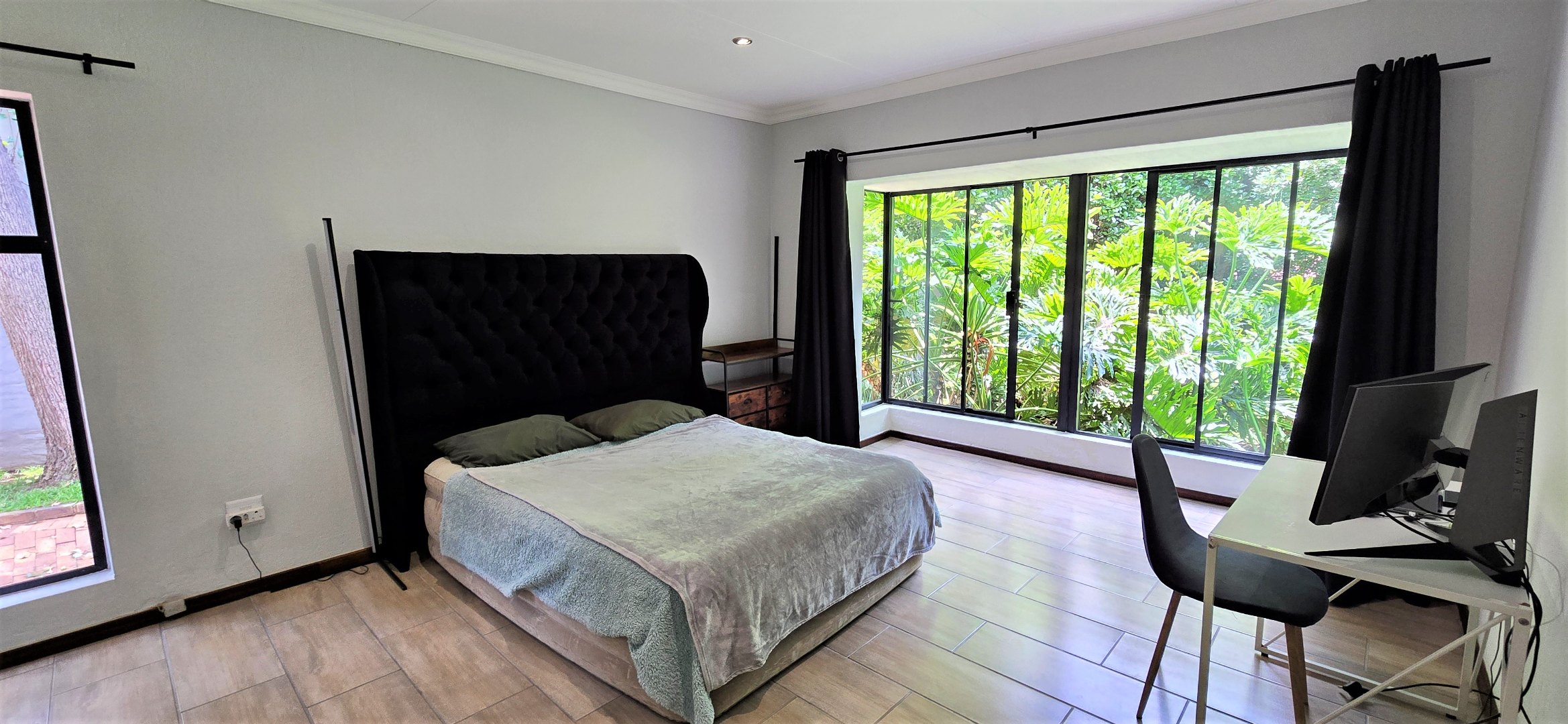 Down the passage, the main bedroom impresses with a walk-in closet, an en-suite bathroom, and large windows that fill the space with natural light while offering a beautiful view of the garden. The second bedroom enjoys easy access to a separate bathroom located along the passage, which also serves conveniently as a guest bathroom.