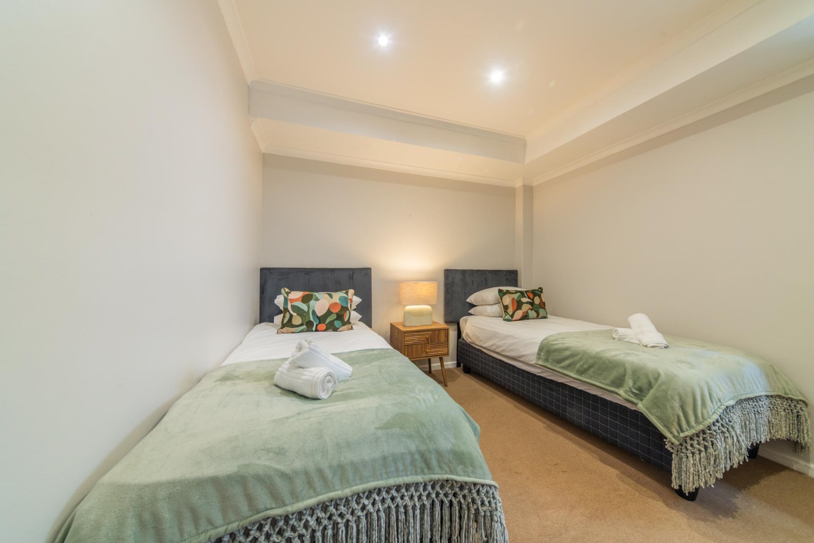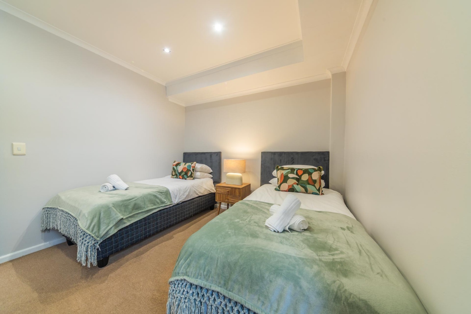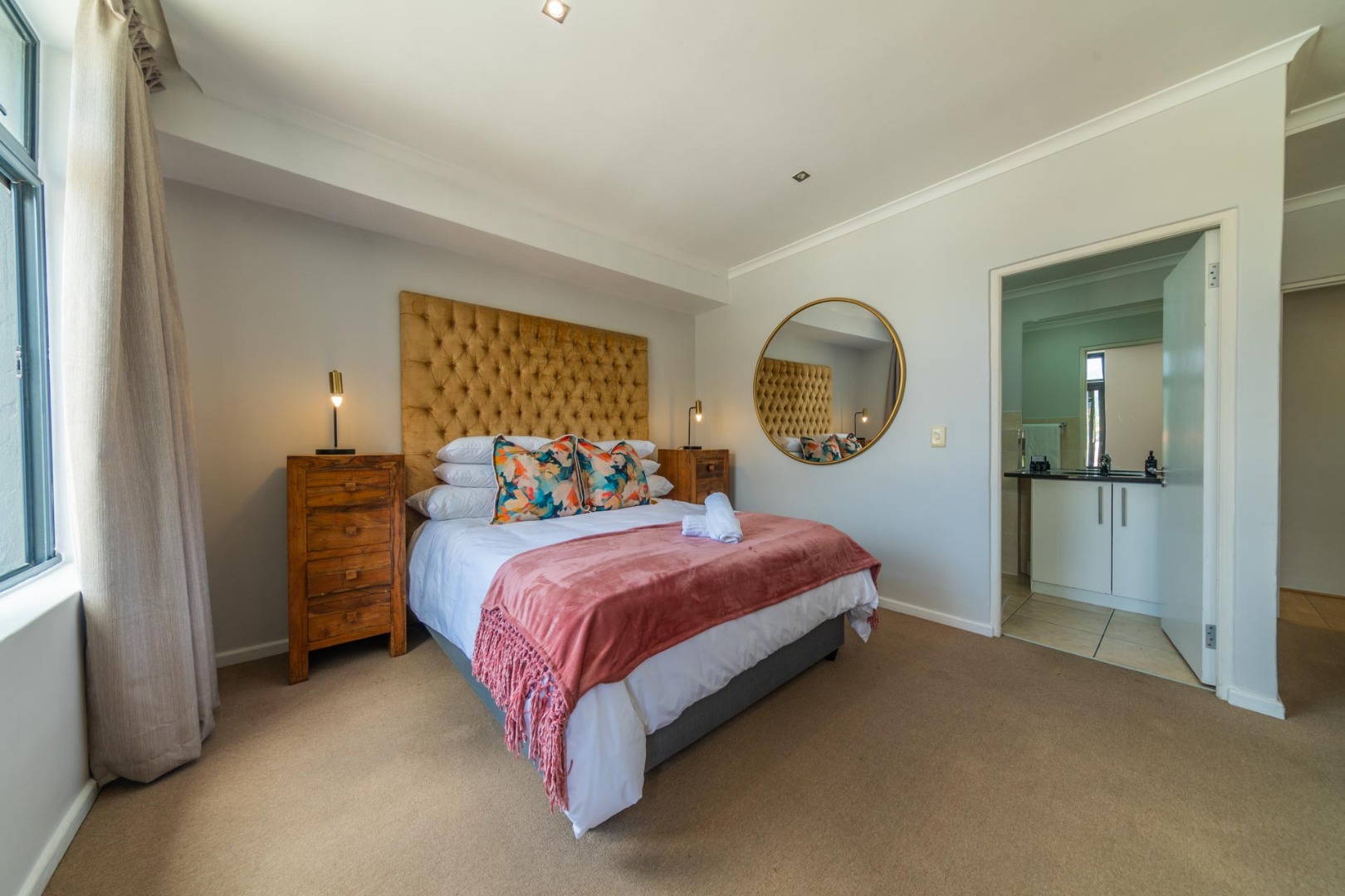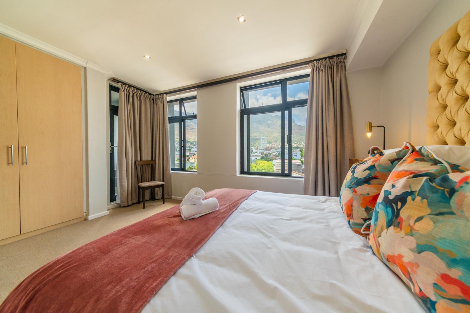 Both bedrooms are thoughtfully designed, offering bright and inviting spaces. The primary bedroom boasts a luxurious queen-sized bed with a plush tufted headboard, complemented by modern lamps and expansive windows that frame stunning mountain and city views. The second bedroom also features a comfortable bed with a striking tufted golden headboard and direct access to an en-suite bathroom, enhancing privacy and convenience. The property includes one en-suite bathroom and an additional bathroom, catering to both residents and guests.