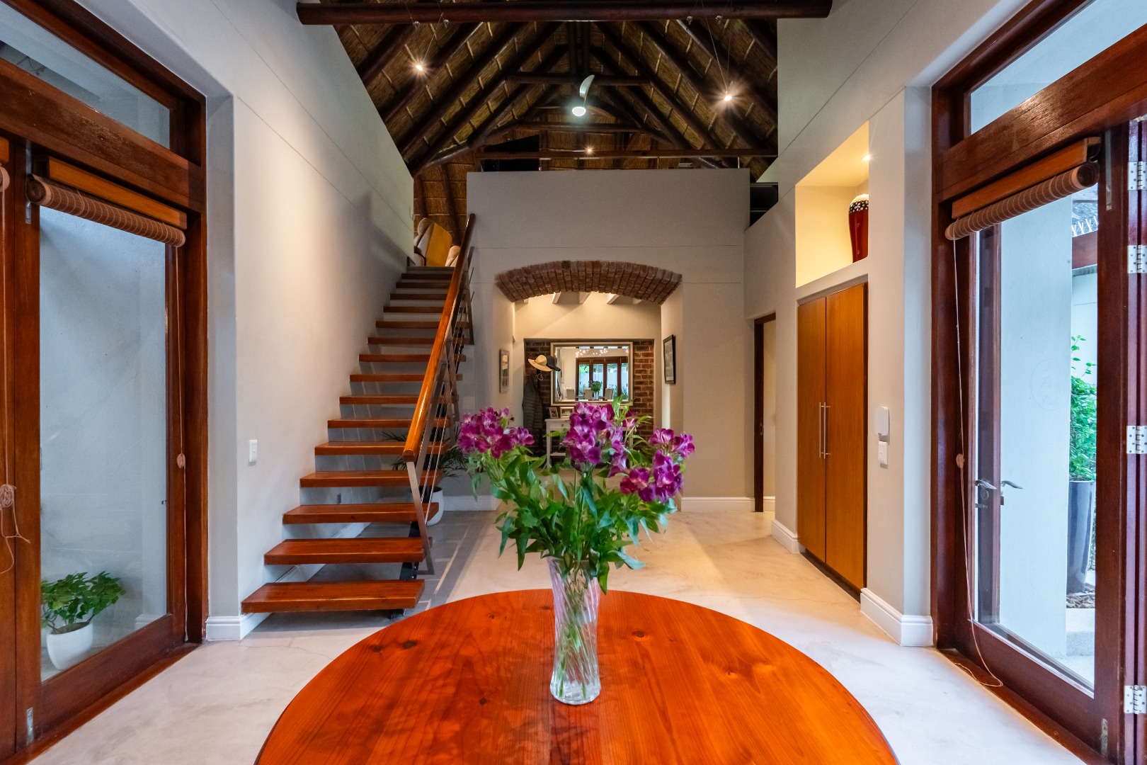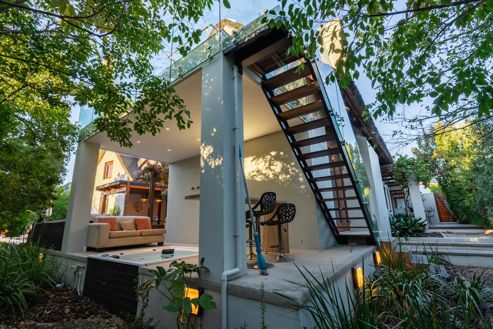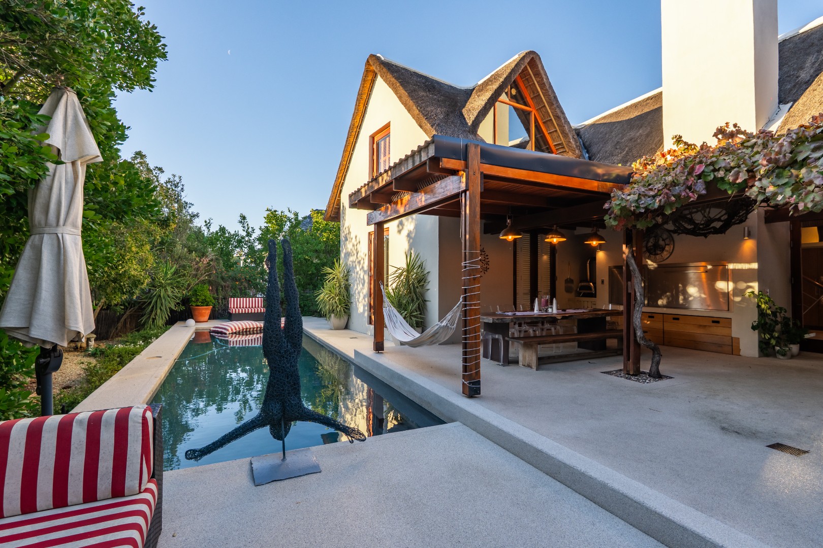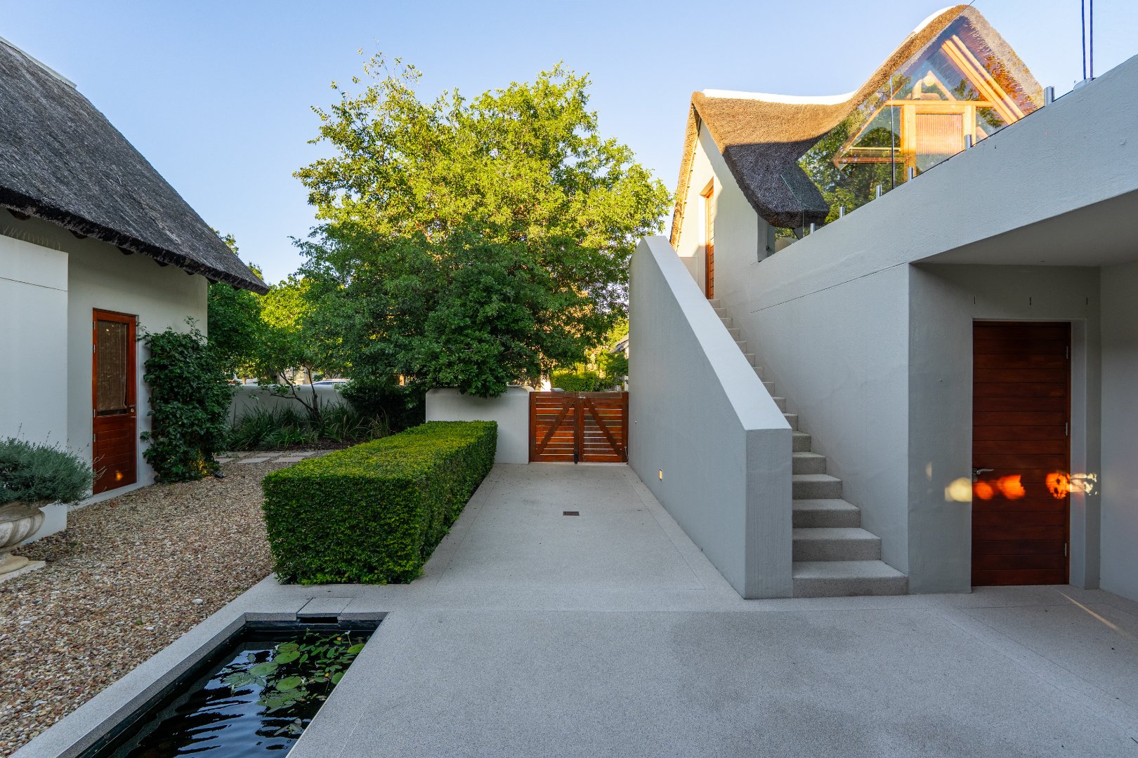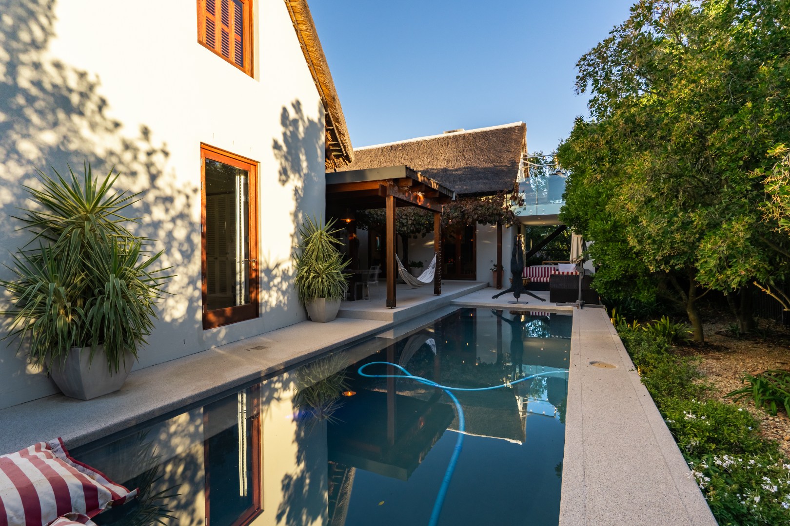 The accommodation is generous and thoughtfully laid out, offering five spacious bedrooms and four bathrooms, including three en-suite. The main suite is a private sanctuary, complete with a walk-in closet, outdoor shower, and its own sauna, creating a true retreat within the home. Additional features such as a separate flatlet and domestic quarters provide flexibility for extended family or guests.