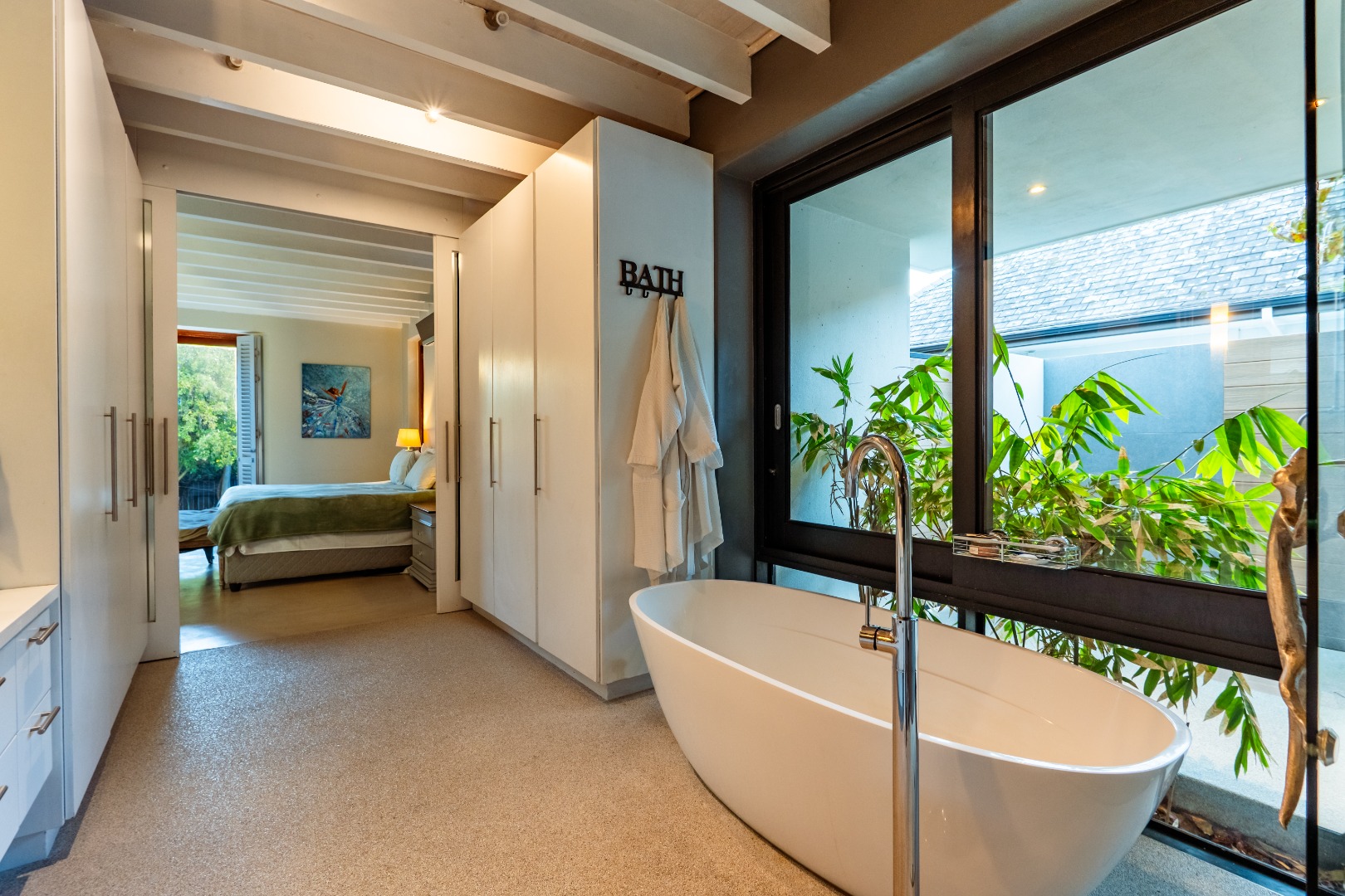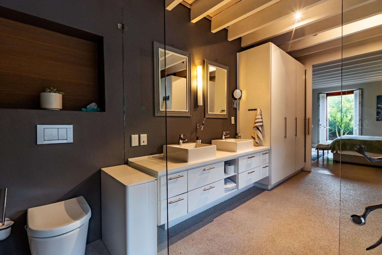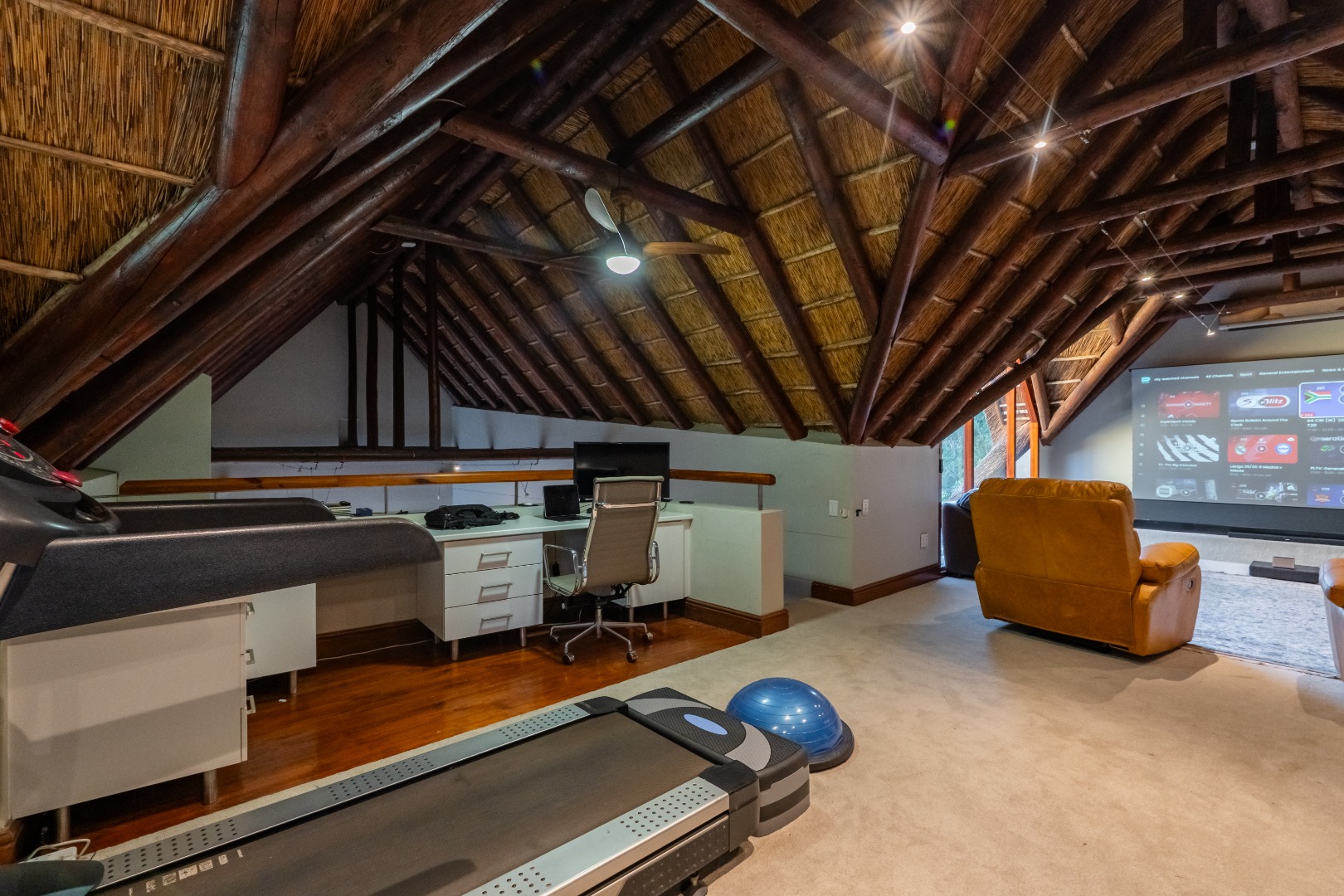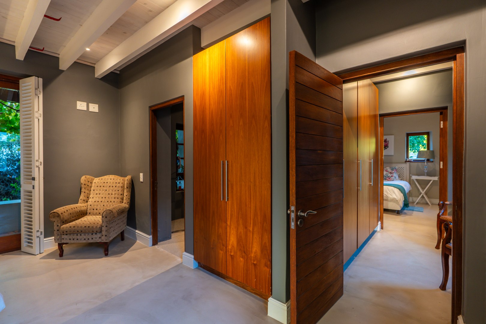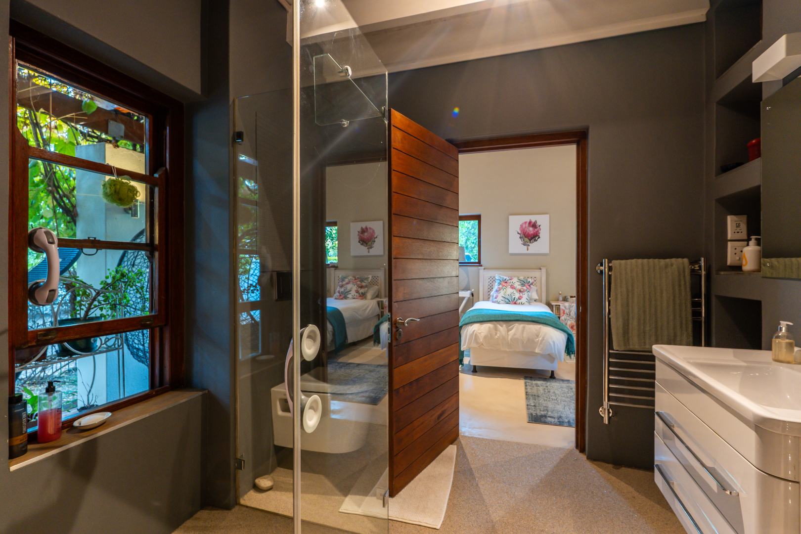 The accommodation is generous and thoughtfully laid out, offering five spacious bedrooms and four bathrooms, including three en-suite. The main suite is a private sanctuary, complete with a walk-in closet, outdoor shower, and its own sauna, creating a true retreat within the home. Additional features such as a separate flatlet and domestic quarters provide flexibility for extended family or guests.