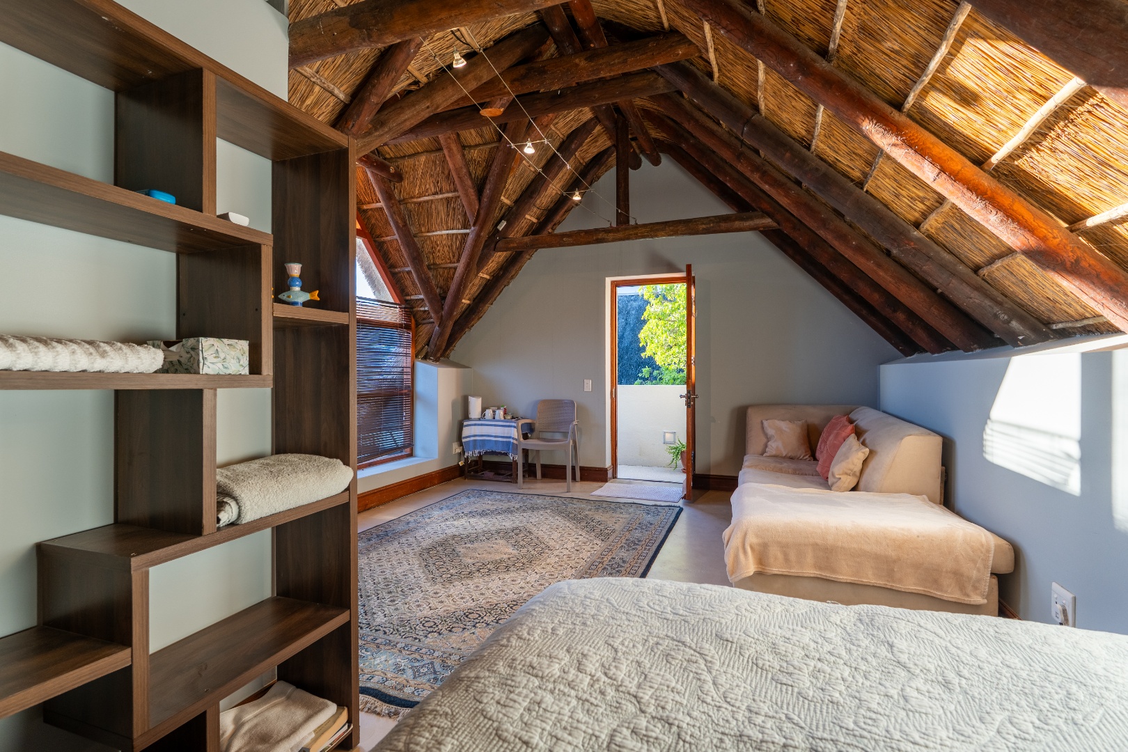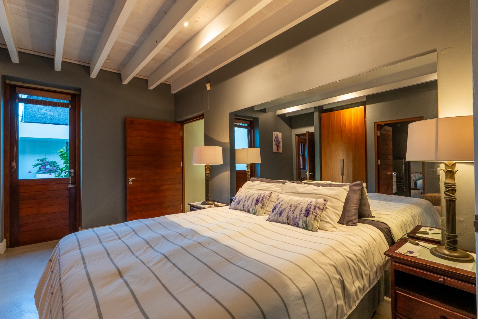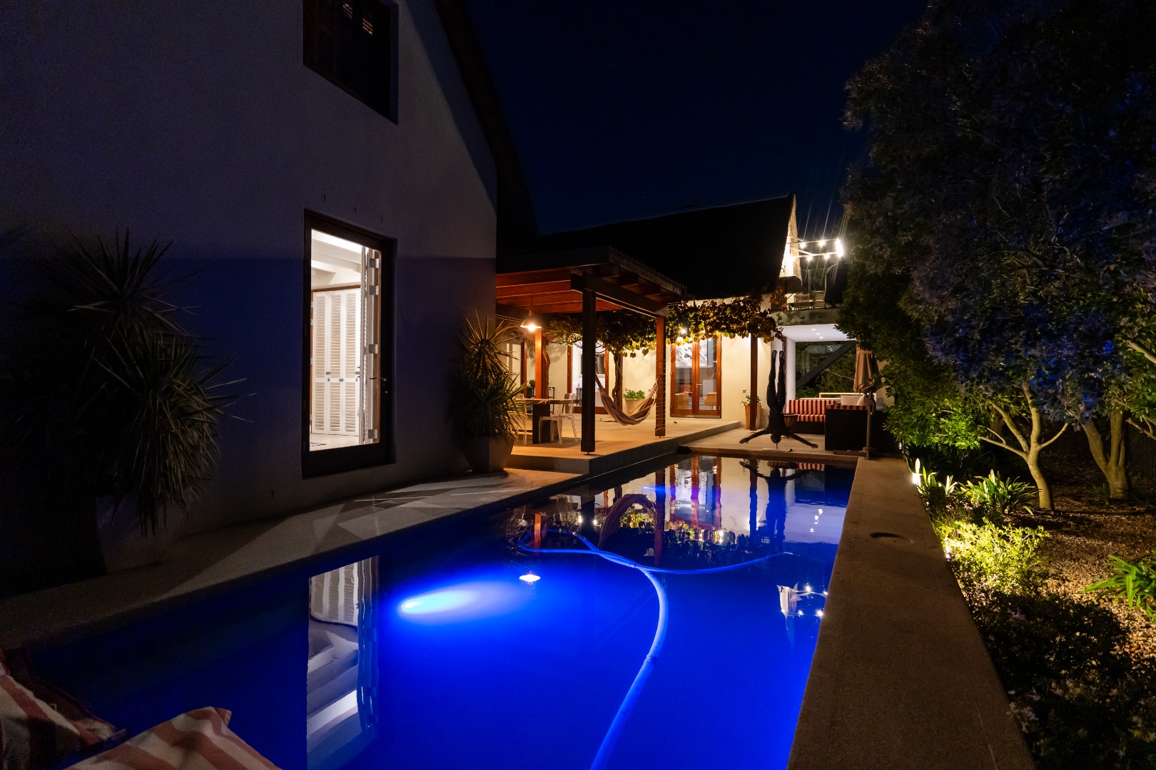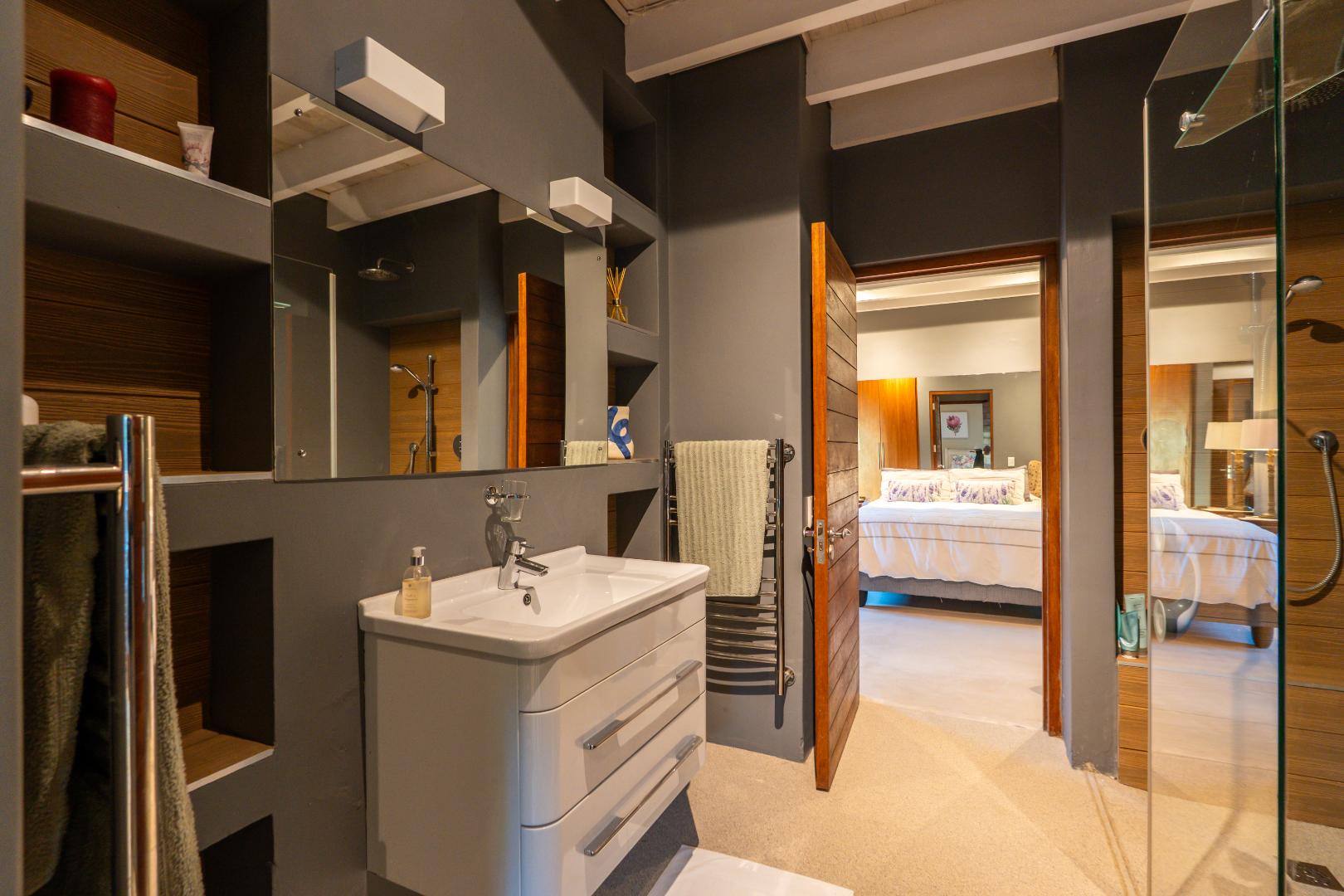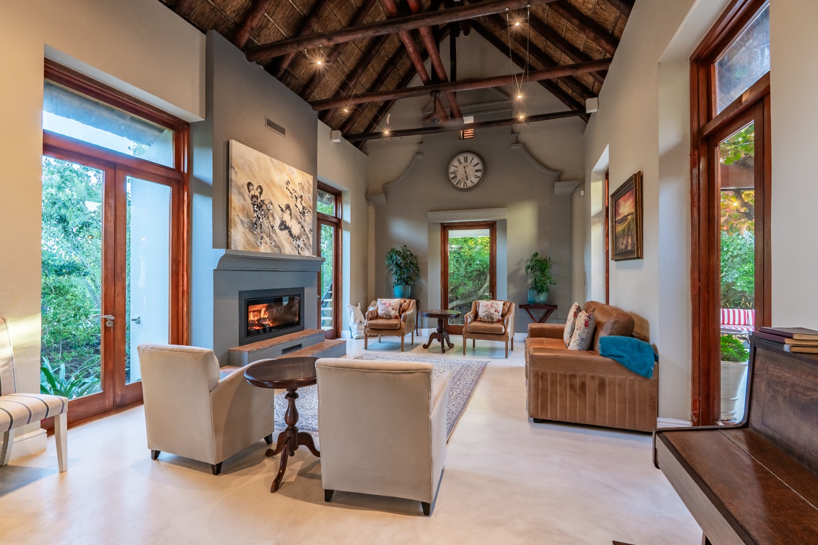 The accommodation is generous and thoughtfully laid out, offering five spacious bedrooms and four bathrooms, including three en-suite. The main suite is a private sanctuary, complete with a walk-in closet, outdoor shower, and its own sauna, creating a true retreat within the home. Additional features such as a separate flatlet and domestic quarters provide flexibility for extended family or guests.