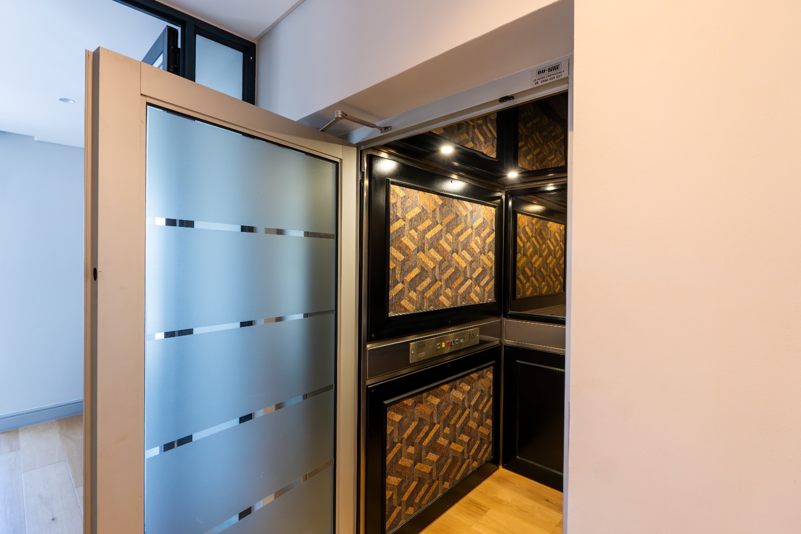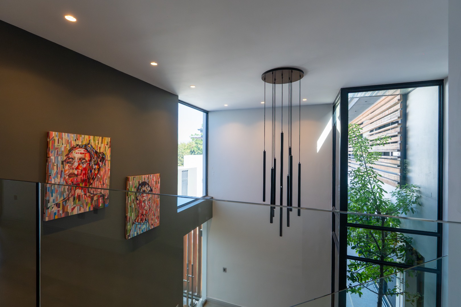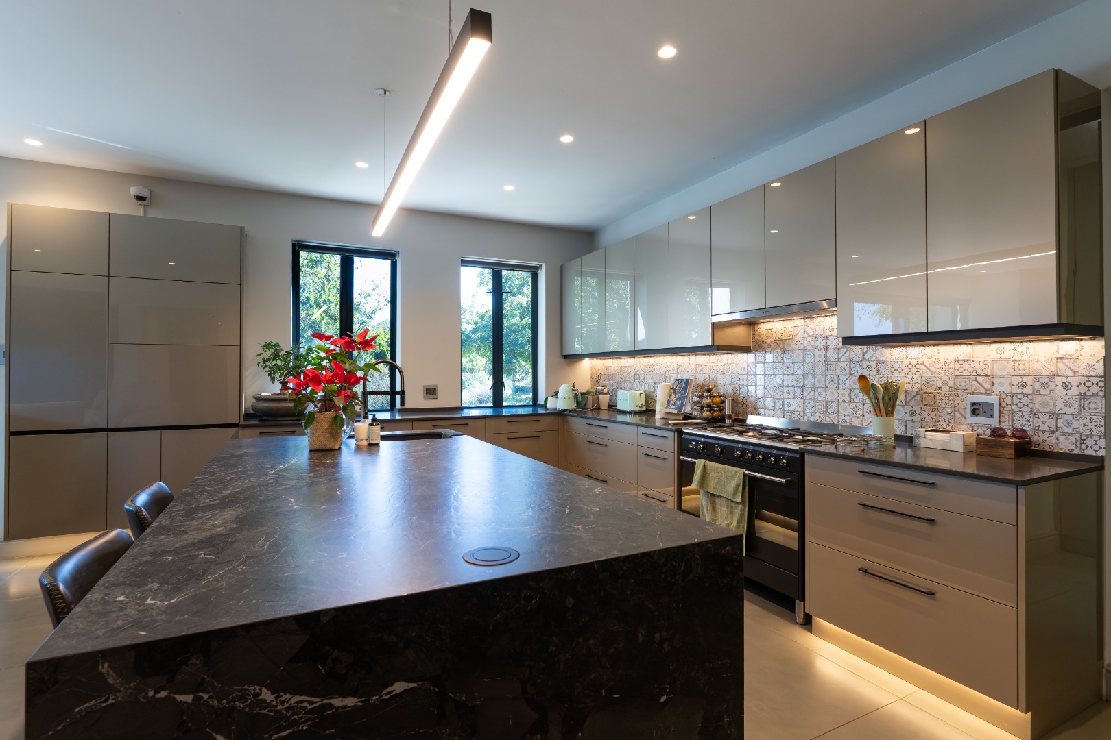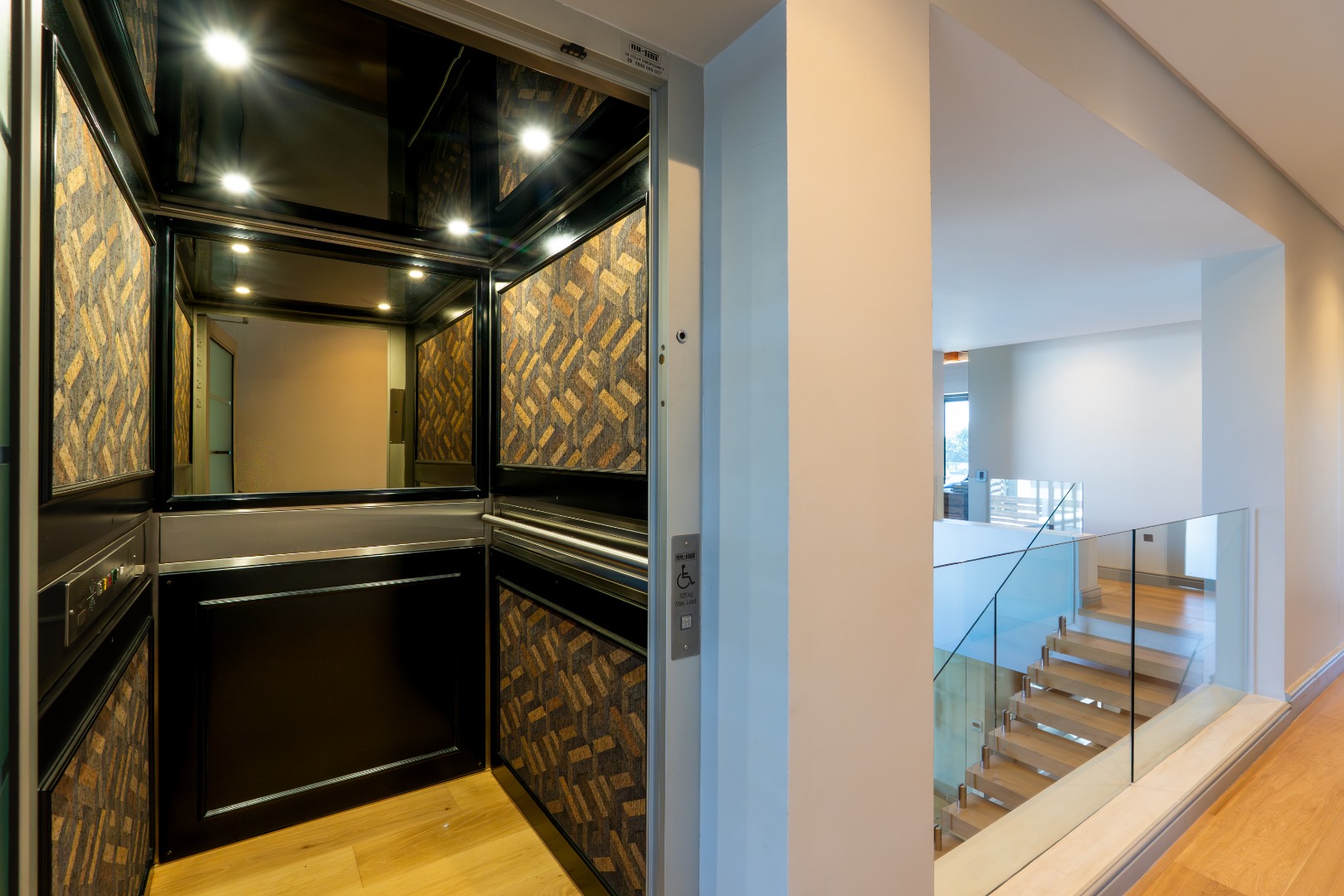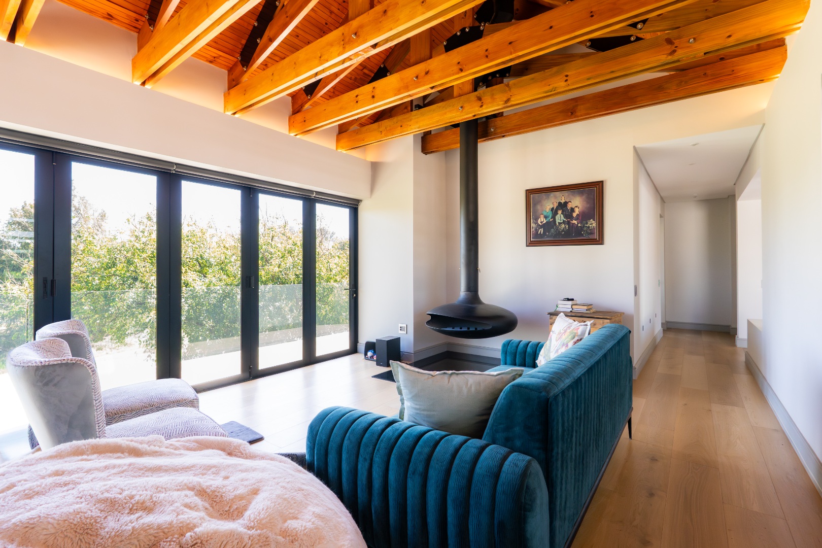 Upstairs, five generously sized en-suite bedrooms each open onto private balconies, offering peaceful personal retreats. The upper level is easily accessed via a built-in elevator or an elegant floating oak staircase. A spacious pyjama lounge with a kitchenette overlooks the golf course and features a wood-burning fireplace, creating a warm and inviting family space. A dedicated study is positioned alongside this area.