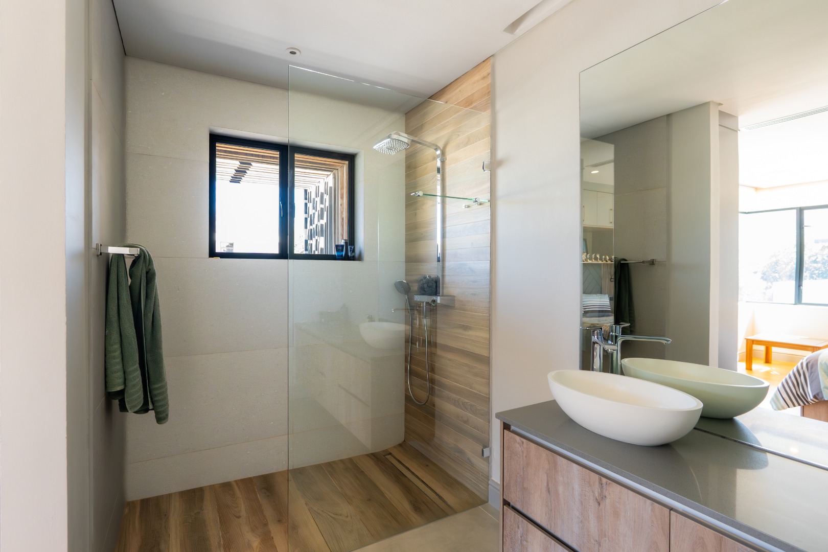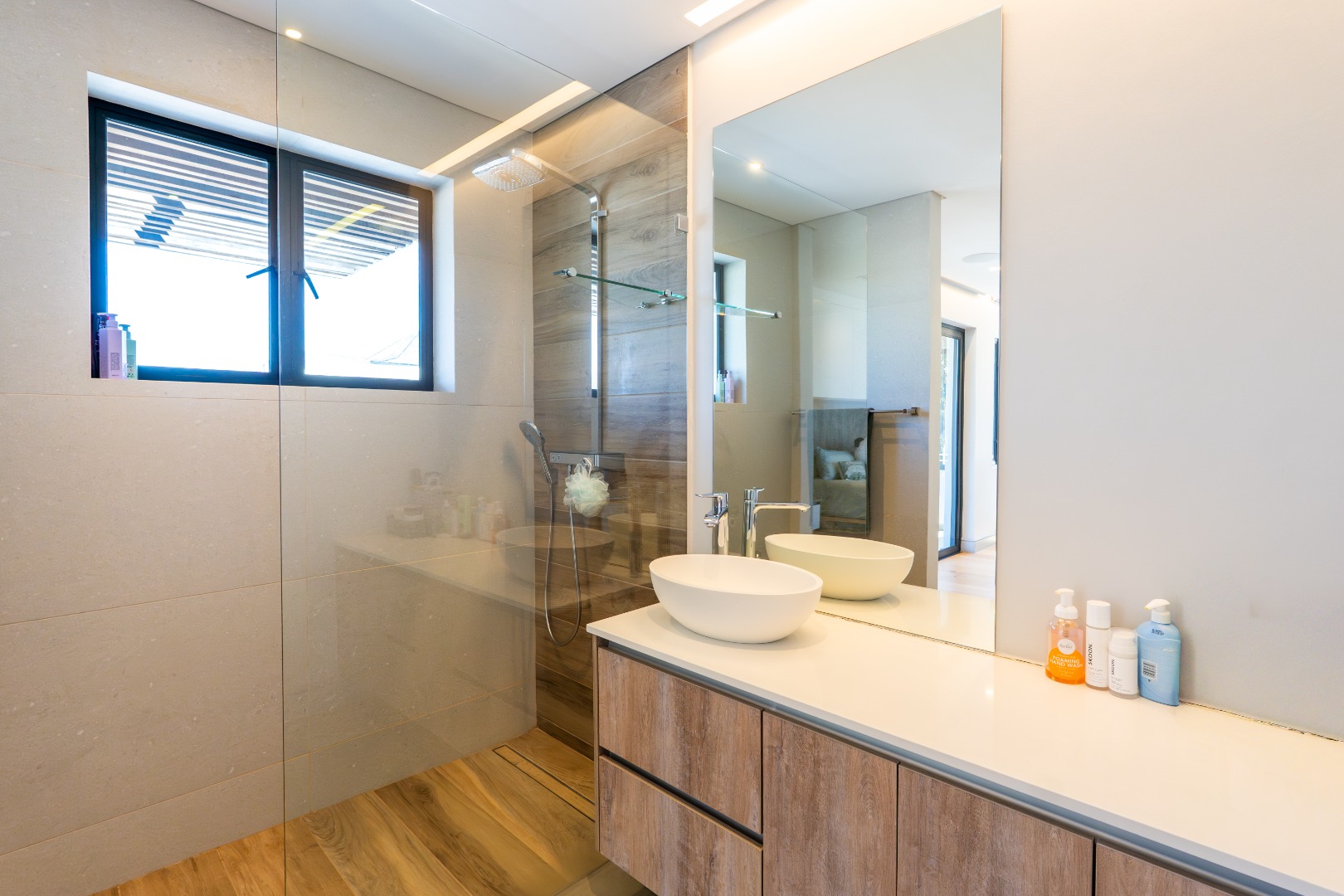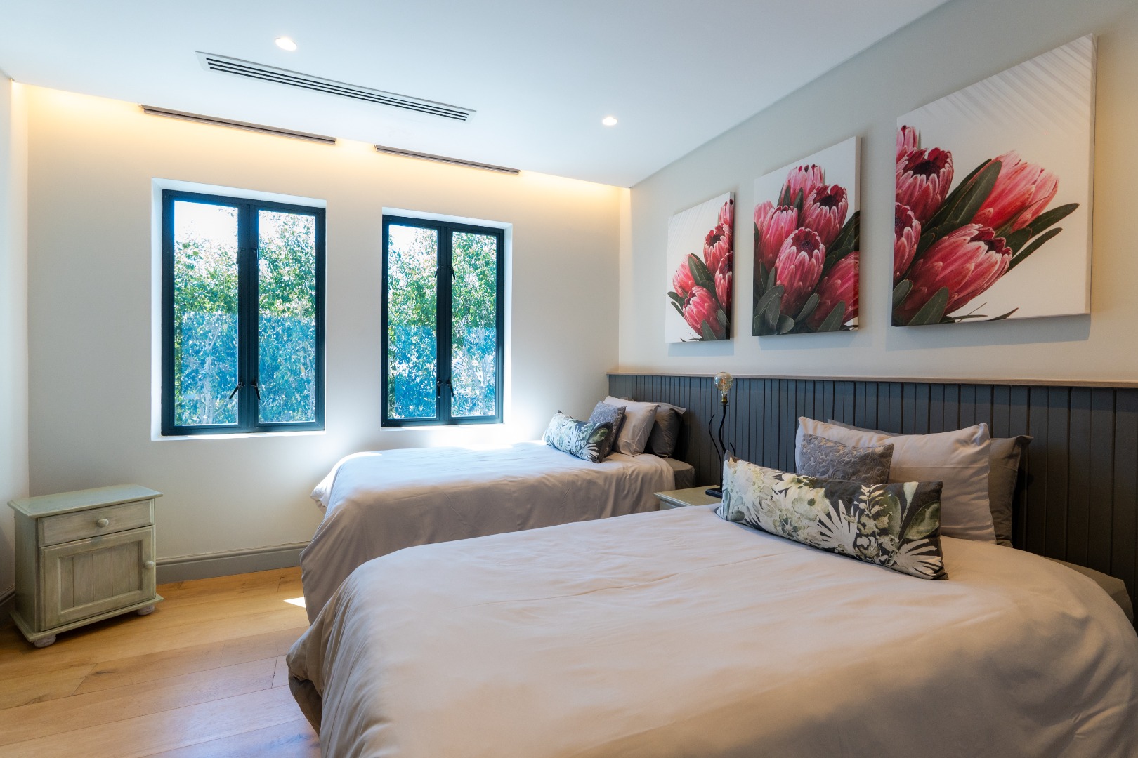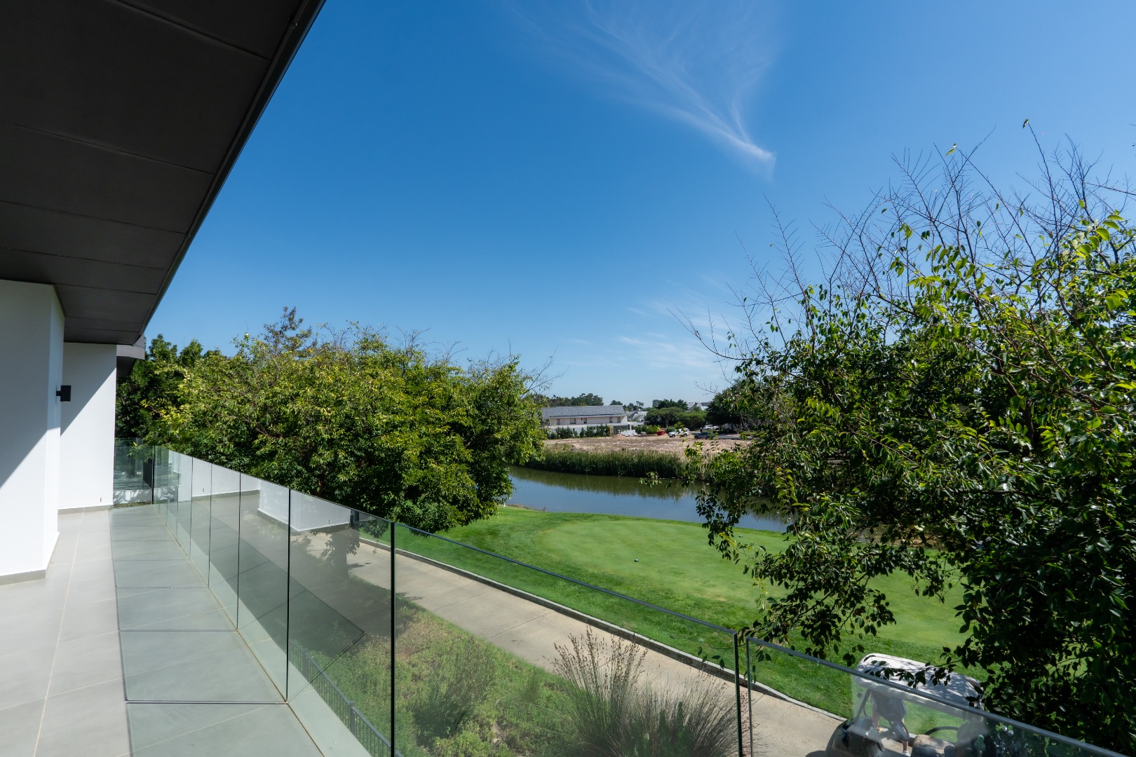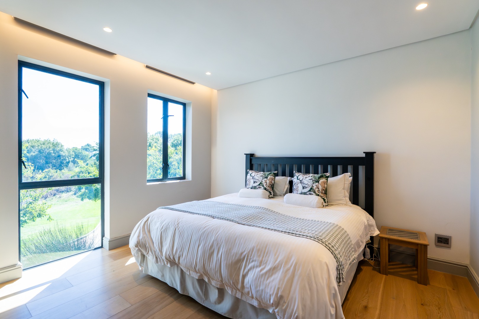The main suite is a true sanctuary, capturing sweeping golf course views and offering ample cupboard space, along with a distinctive outdoor shower that enhances the sense of luxury and privacy.