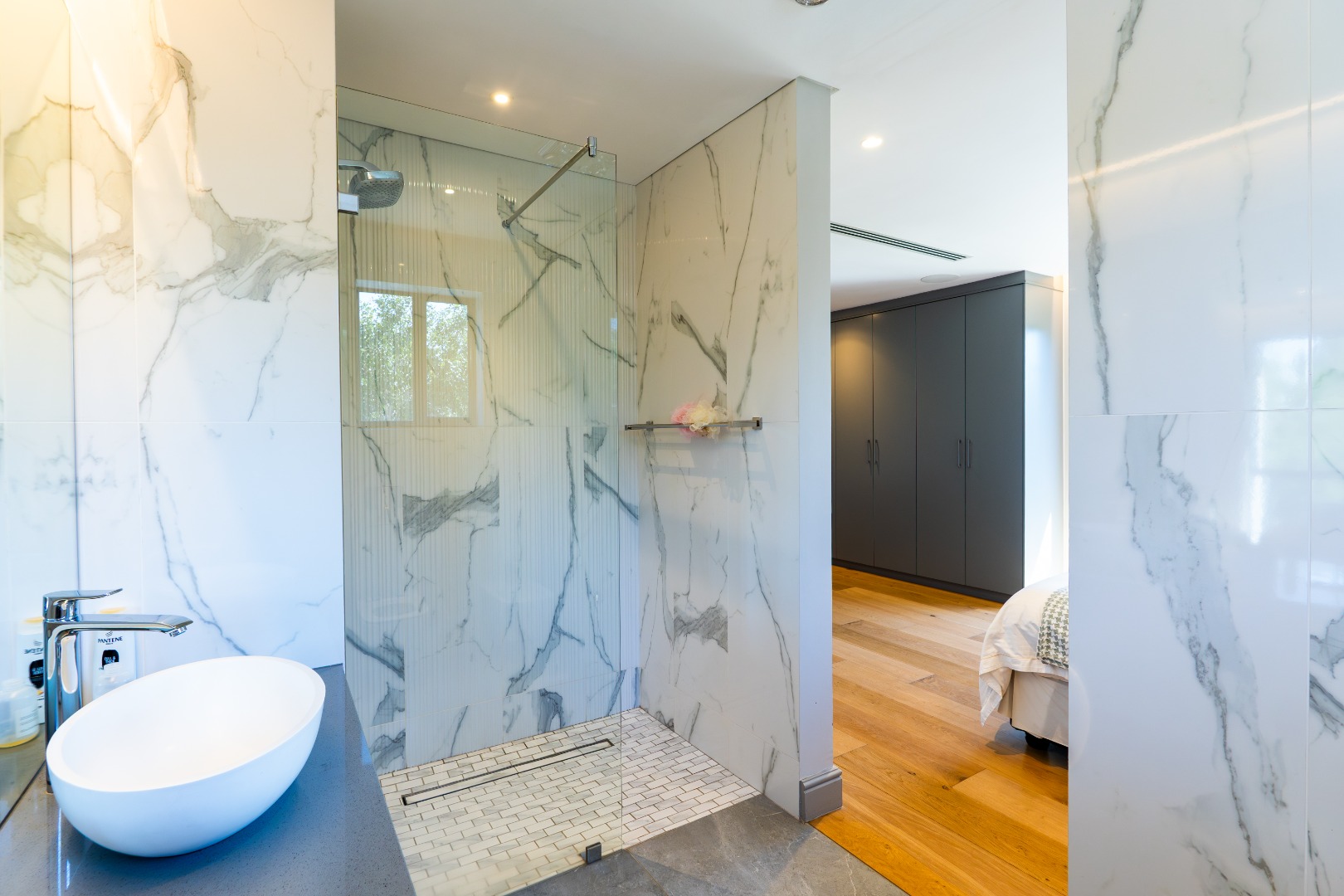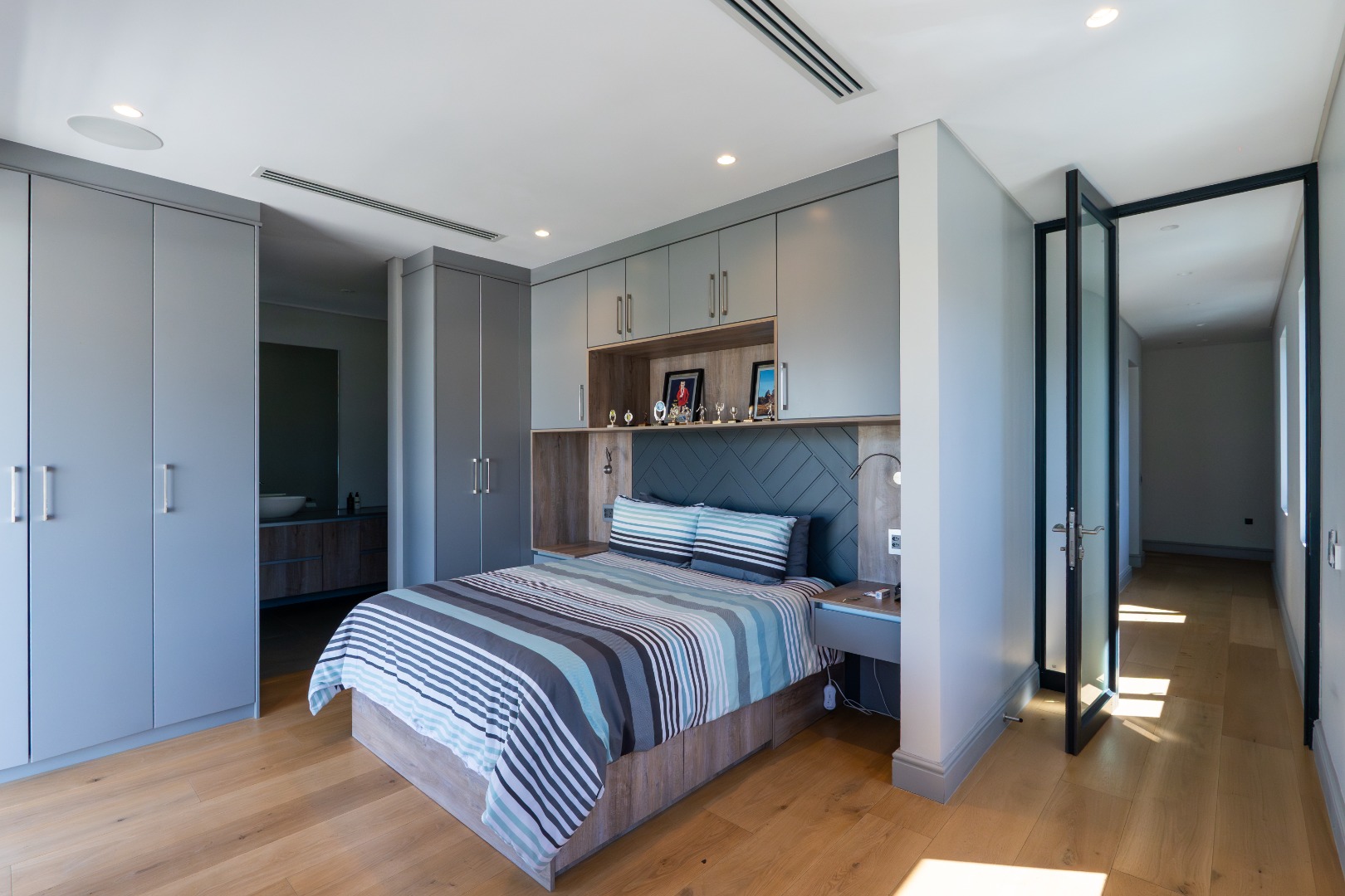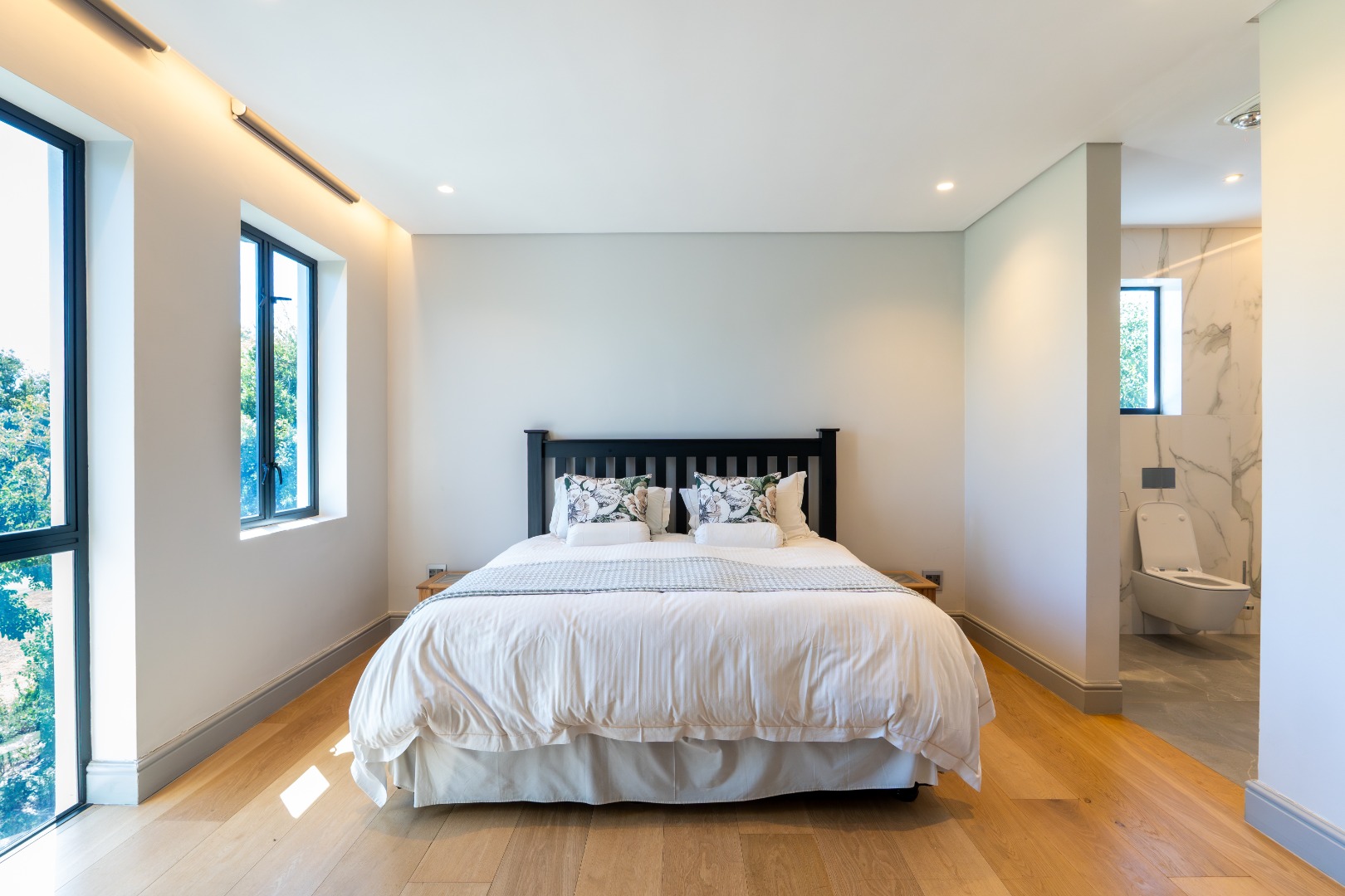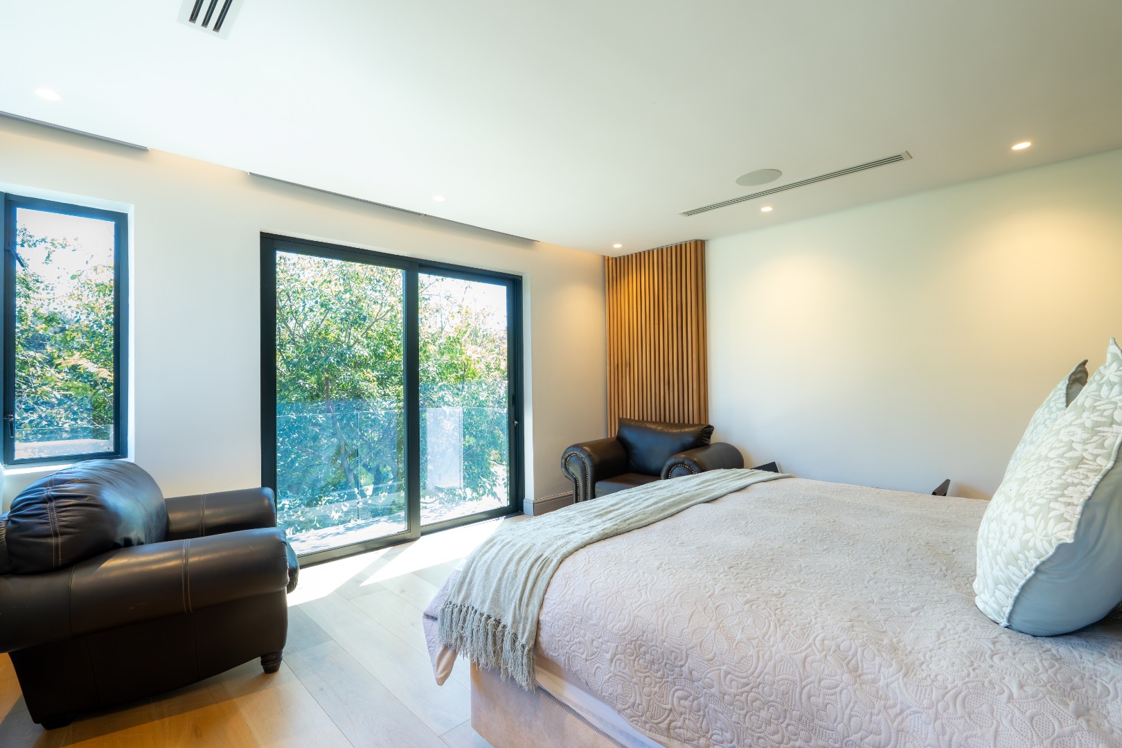The main suite is a true sanctuary, capturing sweeping golf course views and offering ample cupboard space, along with a distinctive outdoor shower that enhances the sense of luxury and privacy.