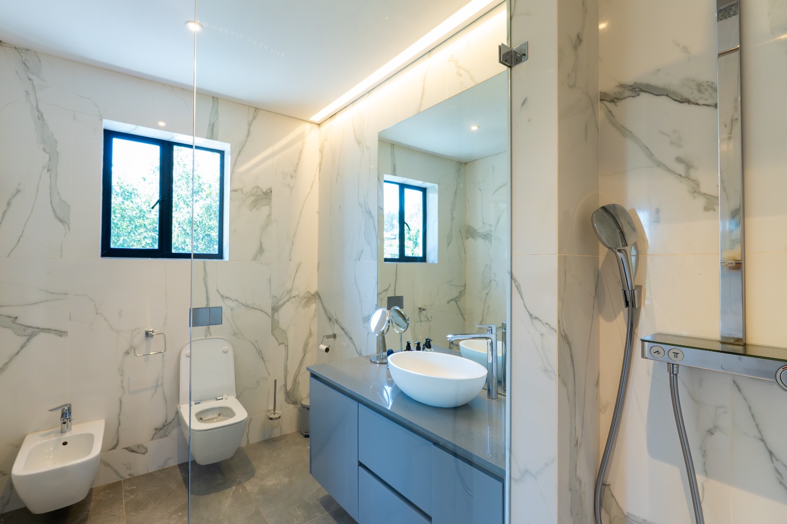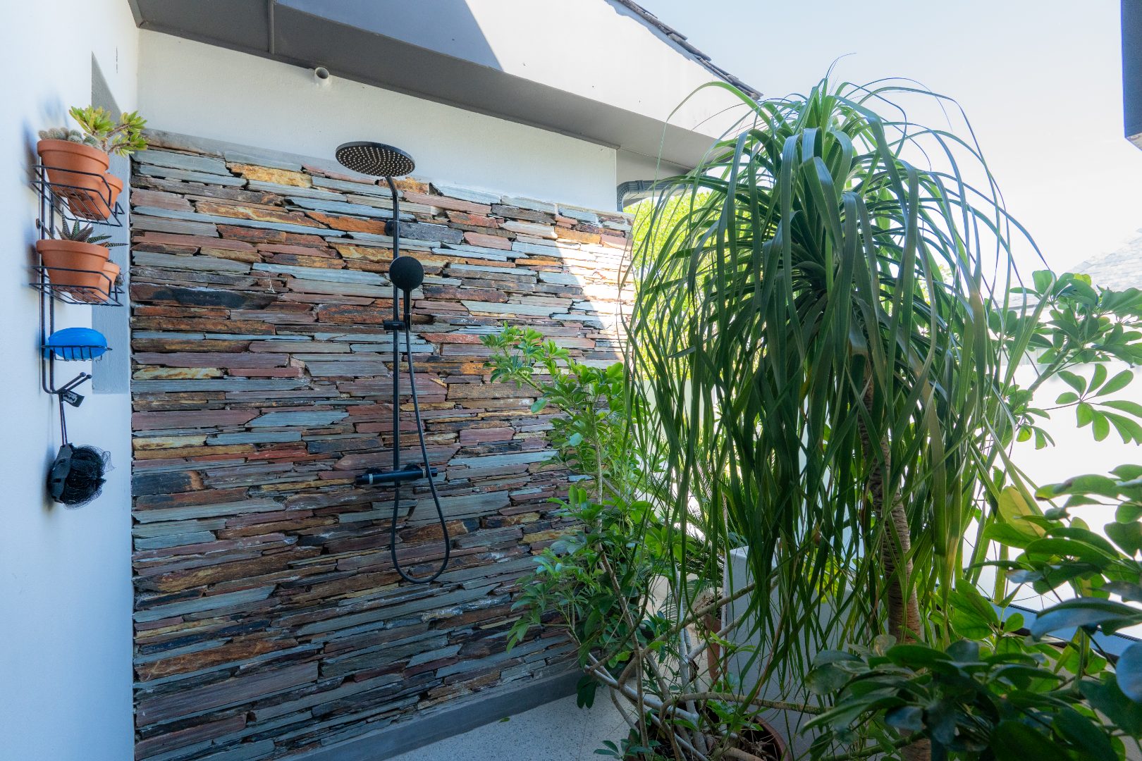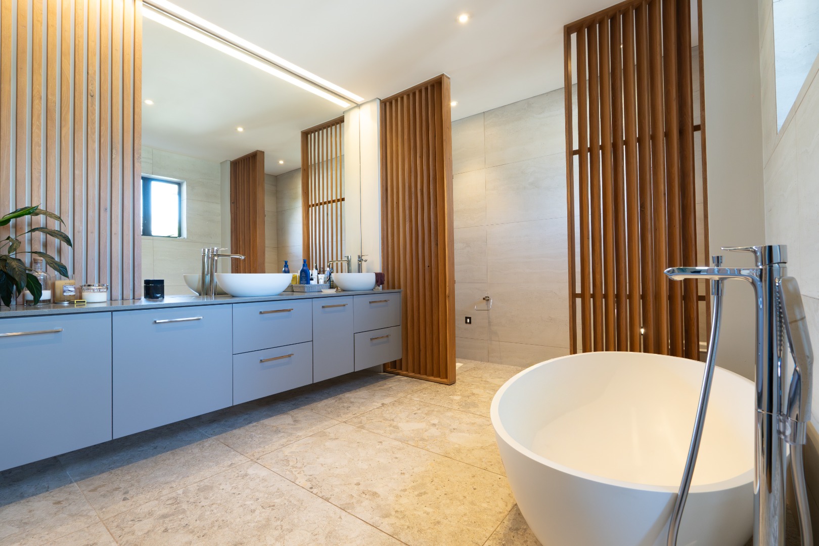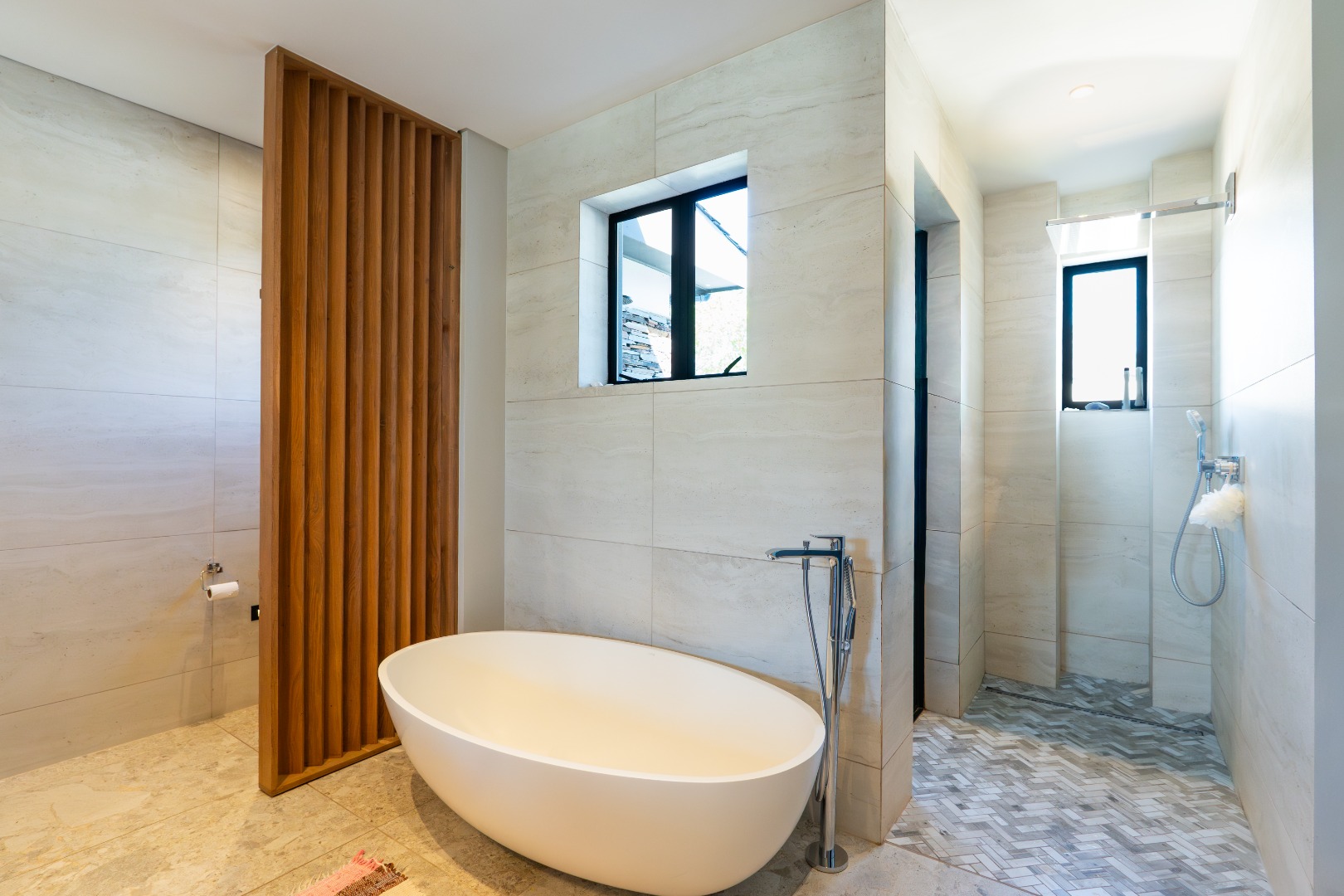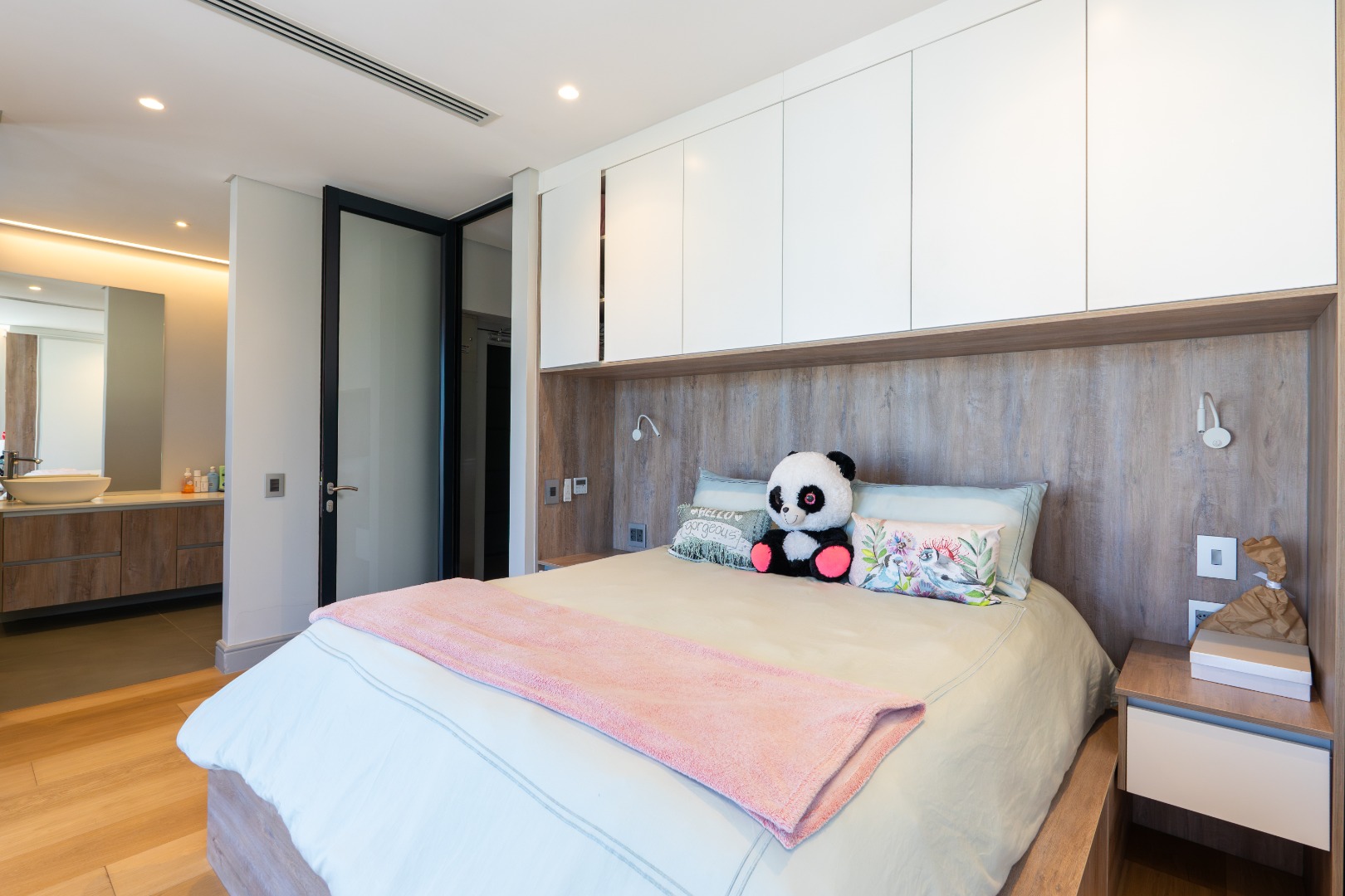 The main suite is a true sanctuary, capturing sweeping golf course views and offering ample cupboard space, along with a distinctive outdoor shower that enhances the sense of luxury and privacy.