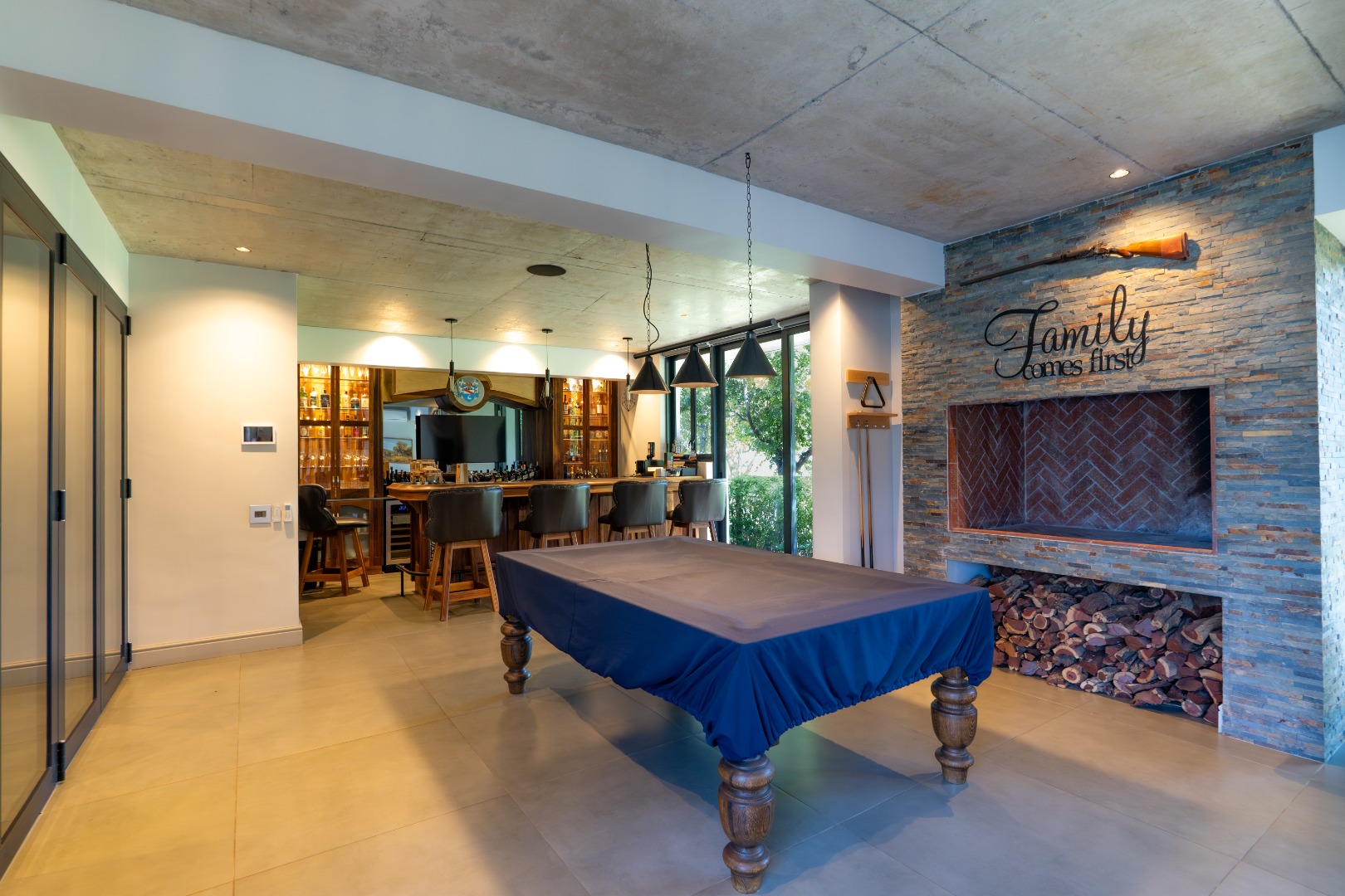 Inside, the ground floor unfolds into expansive living spaces where comfort meets elegance. A spacious family lounge and dining area, anchored by a fireplace, flows seamlessly into a beautifully appointed open-plan kitchen with a separate scullery. An additional dining room provides the perfect setting for formal entertaining, while a dedicated bar and braai area—complete with a pool table—sets the stage for relaxed social gatherings. A state-of-the-art cinema room completes the entertainment offering.