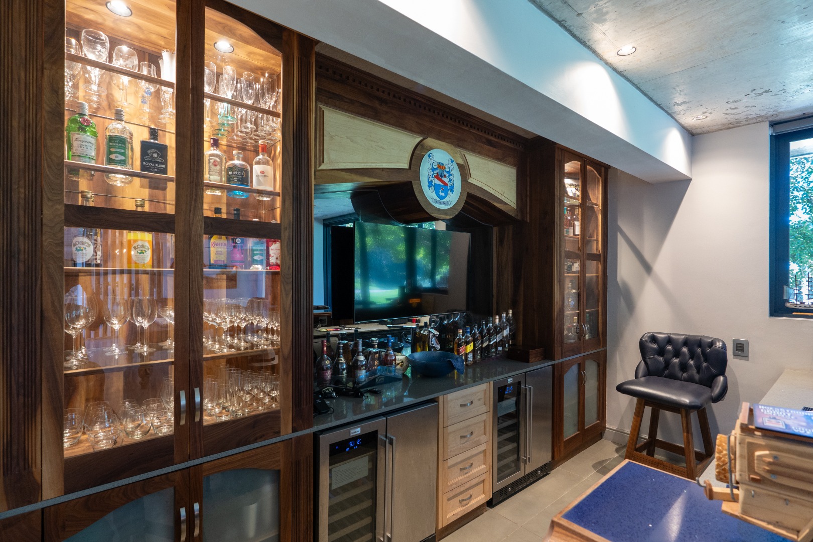 Practicality is equally well considered, with six garages and four additional off-street parking spaces. Outdoors, the landscaped garden and private courtyard create a tranquil retreat, featuring a swimming pool, hot tub, outdoor kitchen, and fire pit—ideal for year-round entertaining. A conveniently located guest bathroom services these spaces.