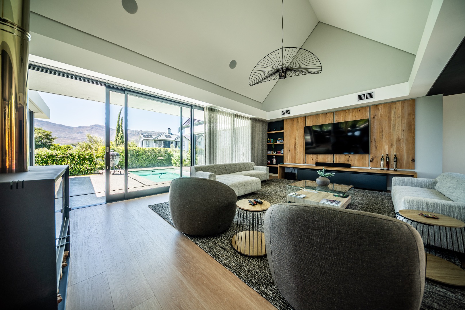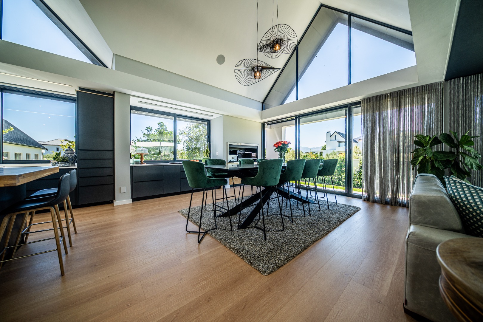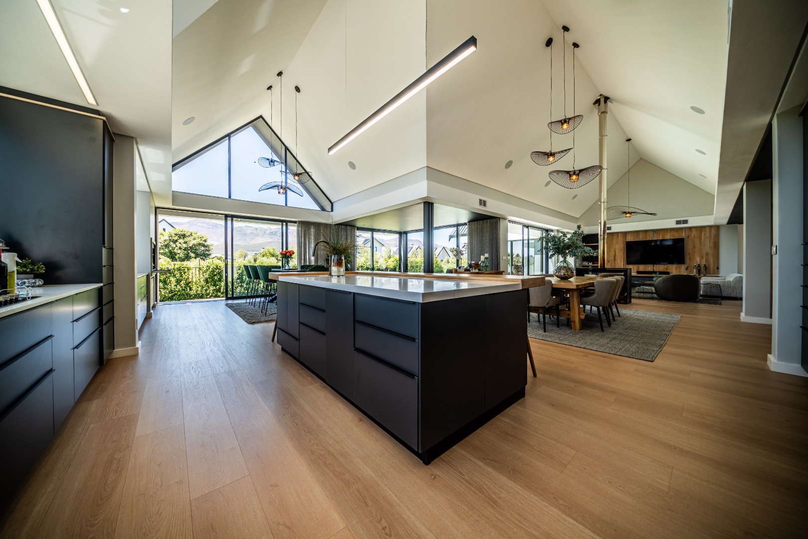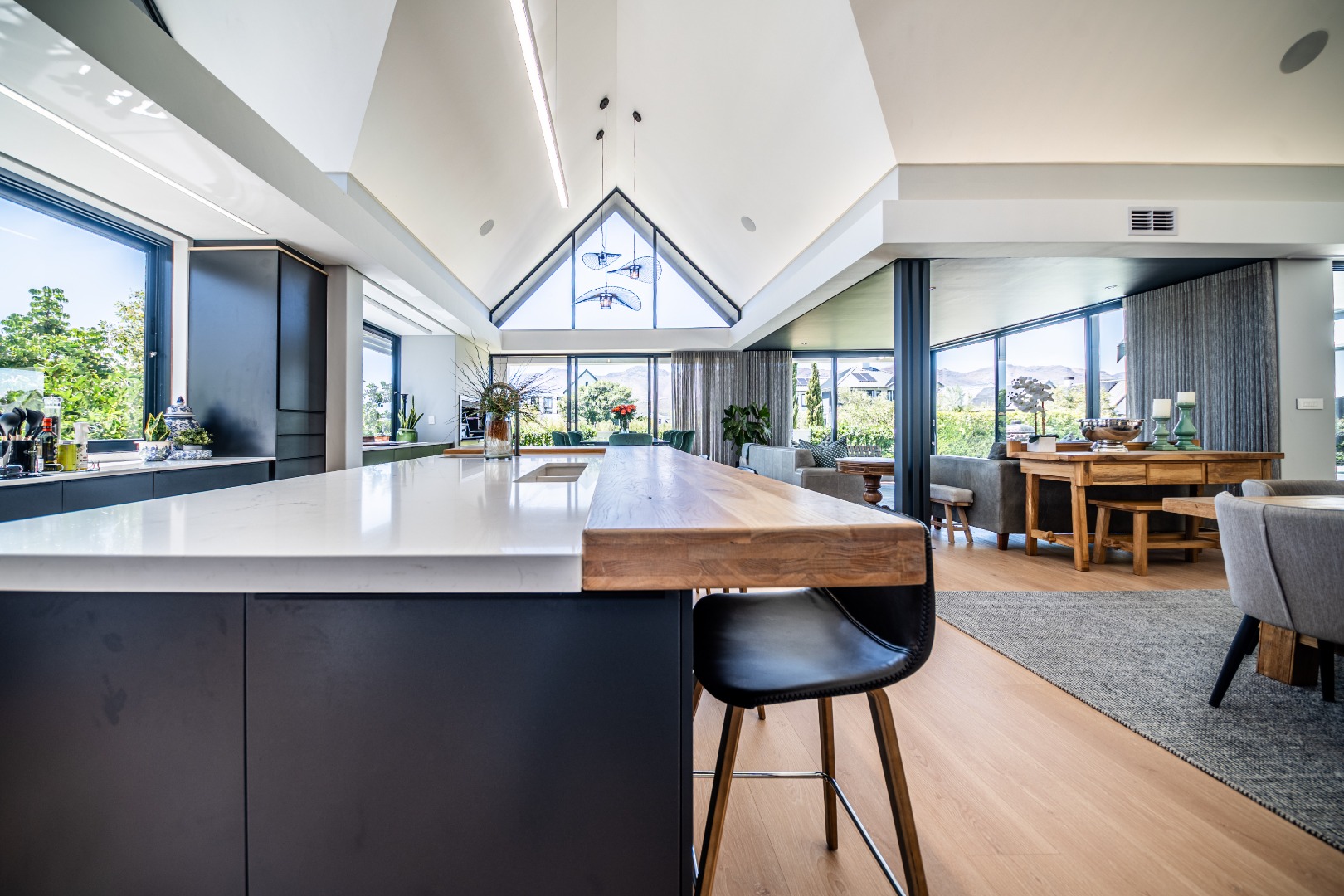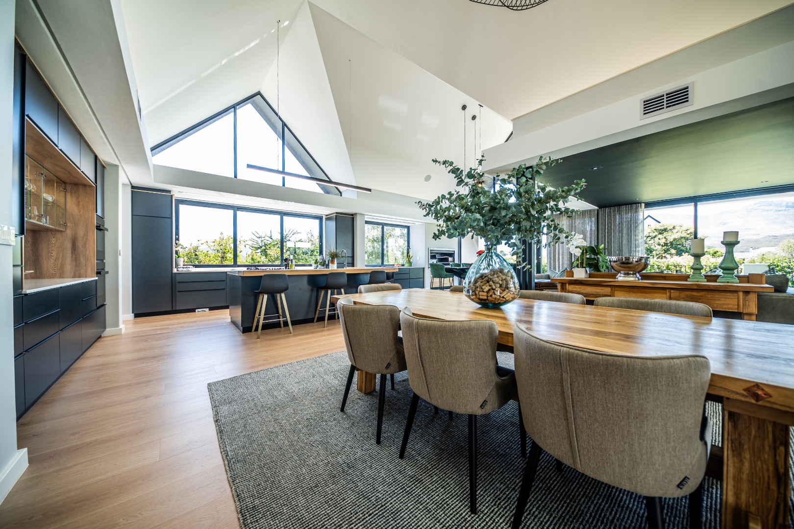 The beautifully designed kitchen combines functionality with elegant style. It features expansive preparation areas, a gas cooktop, and a striking granite centre island with warm wood detailing that naturally becomes the social hub of the home. A stylish wine display and bar area adds character and sophistication for hosting guests, while a separate scullery provides ample storage, space for appliances, and direct access to the outdoor service area. Large windows and stacking doors frame the surrounding mountain landscape, allowing natural light to fill the interiors and enhance the sense of space.