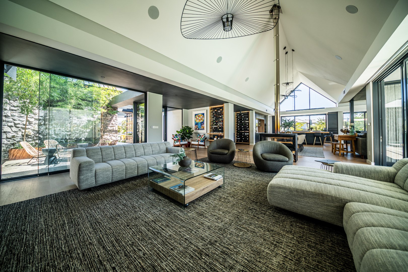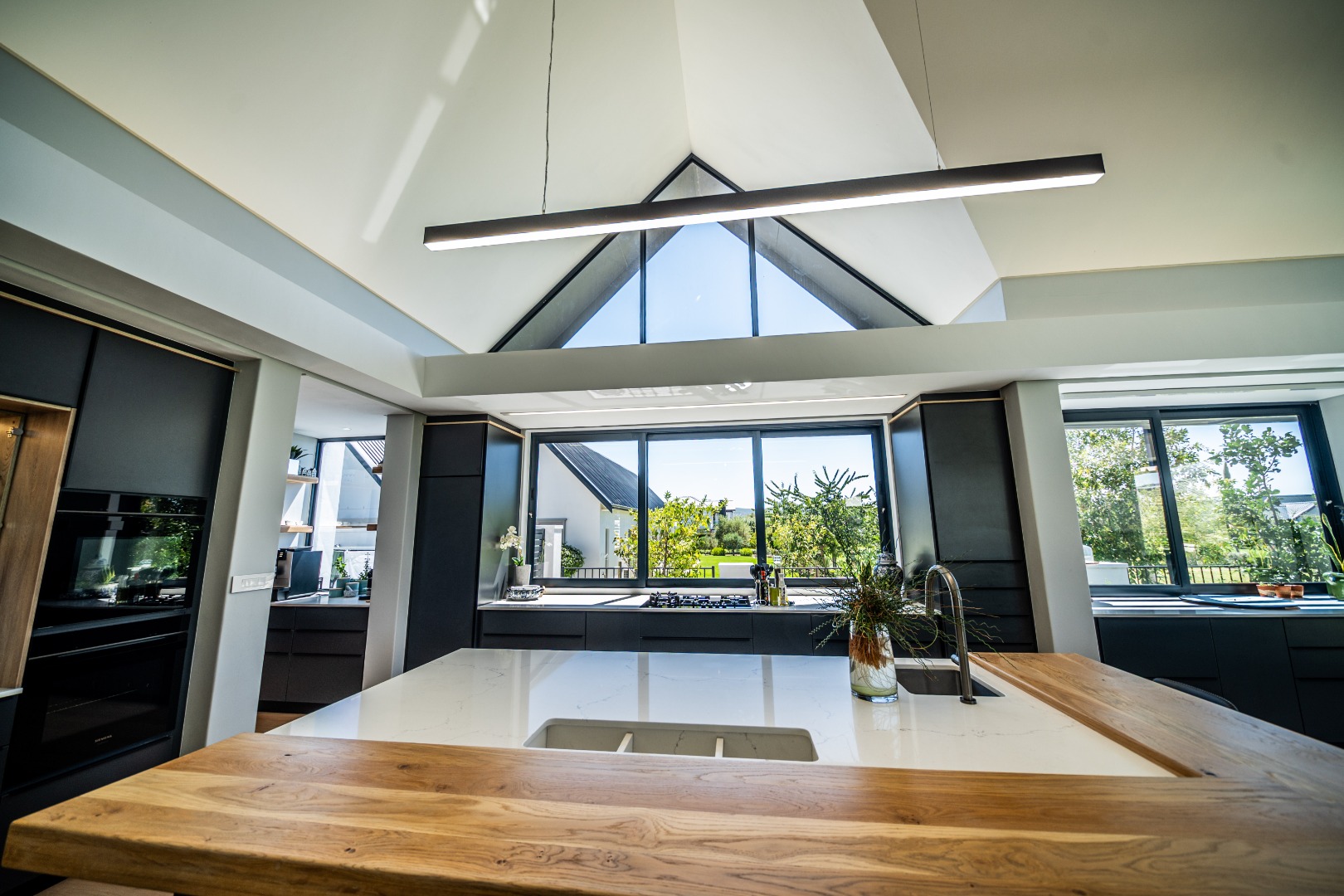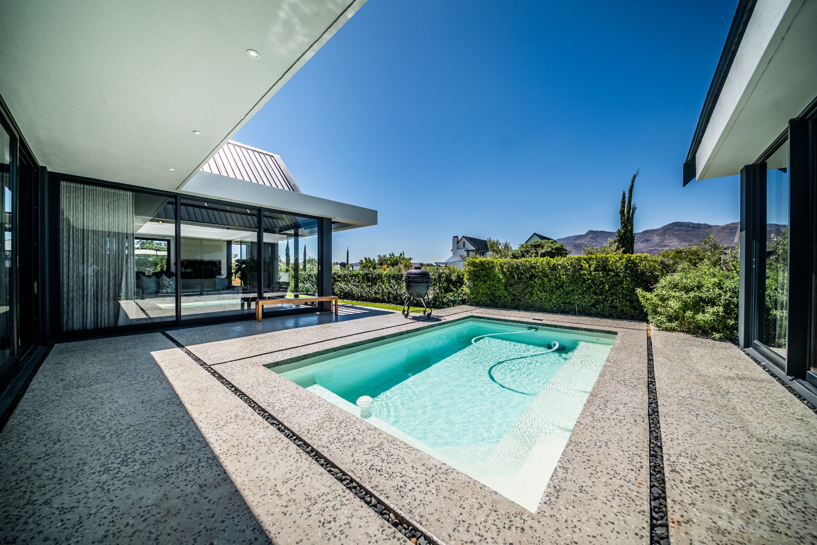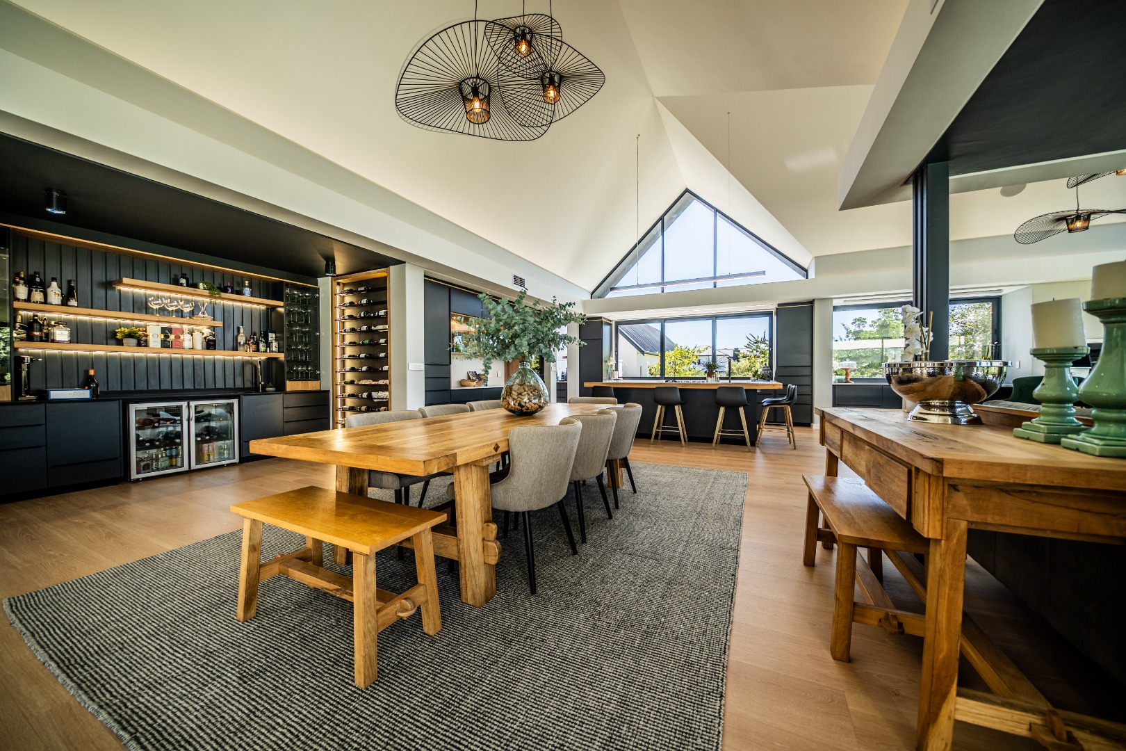 The beautifully designed kitchen combines functionality with elegant style. It features expansive preparation areas, a gas cooktop, and a striking granite centre island with warm wood detailing that naturally becomes the social hub of the home. A stylish wine display and bar area adds character and sophistication for hosting guests, while a separate scullery provides ample storage, space for appliances, and direct access to the outdoor service area. Large windows and stacking doors frame the surrounding mountain landscape, allowing natural light to fill the interiors and enhance the sense of space.