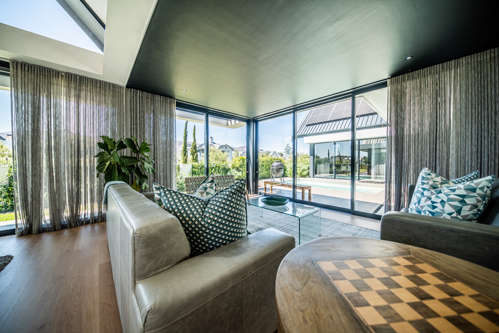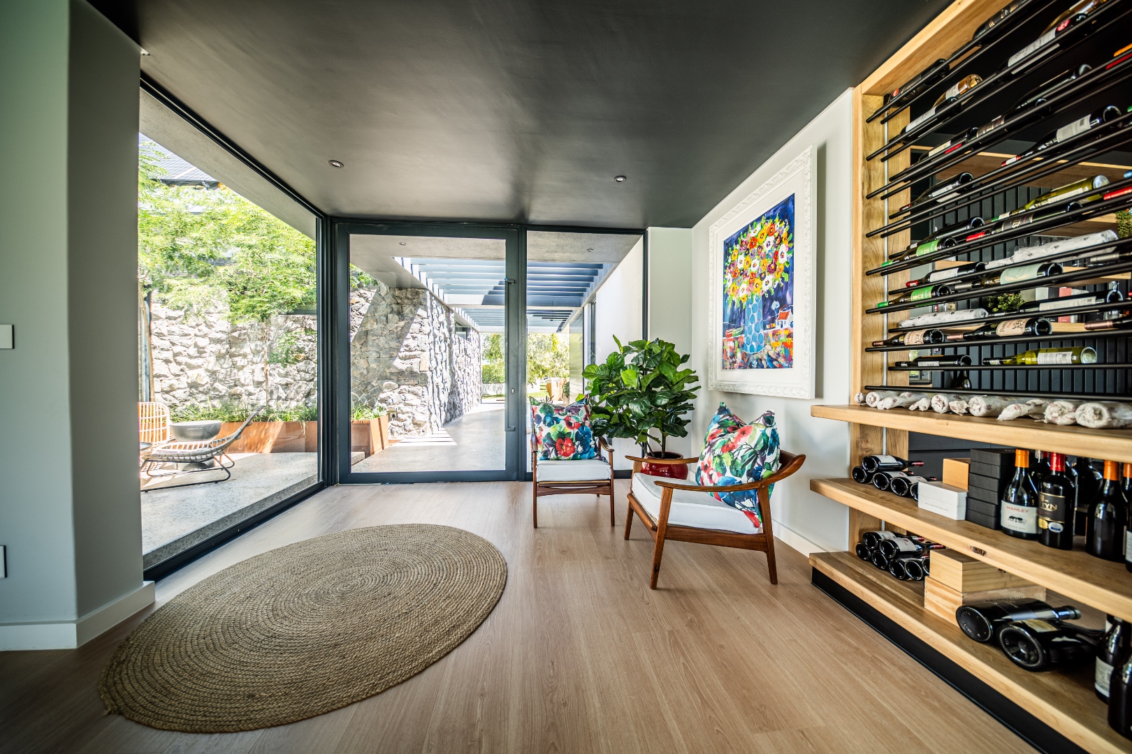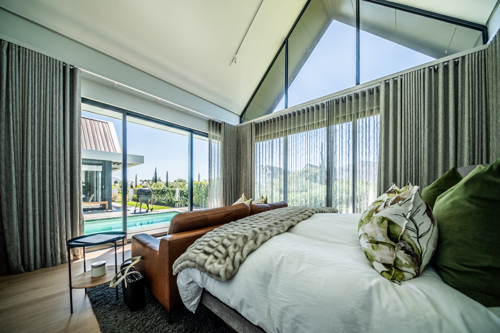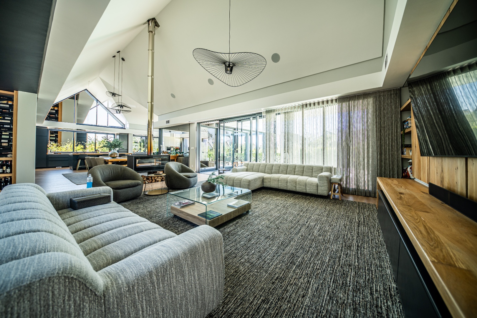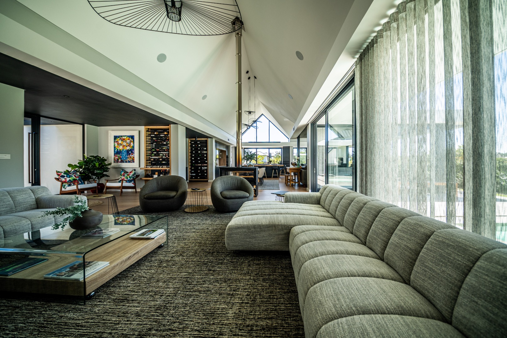 The beautifully designed kitchen combines functionality with elegant style. It features expansive preparation areas, a gas cooktop, and a striking granite centre island with warm wood detailing that naturally becomes the social hub of the home. A stylish wine display and bar area adds character and sophistication for hosting guests, while a separate scullery provides ample storage, space for appliances, and direct access to the outdoor service area. Large windows and stacking doors frame the surrounding mountain landscape, allowing natural light to fill the interiors and enhance the sense of space.