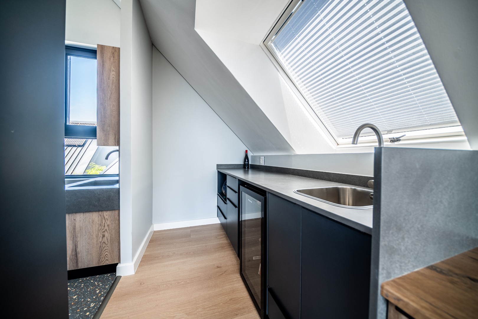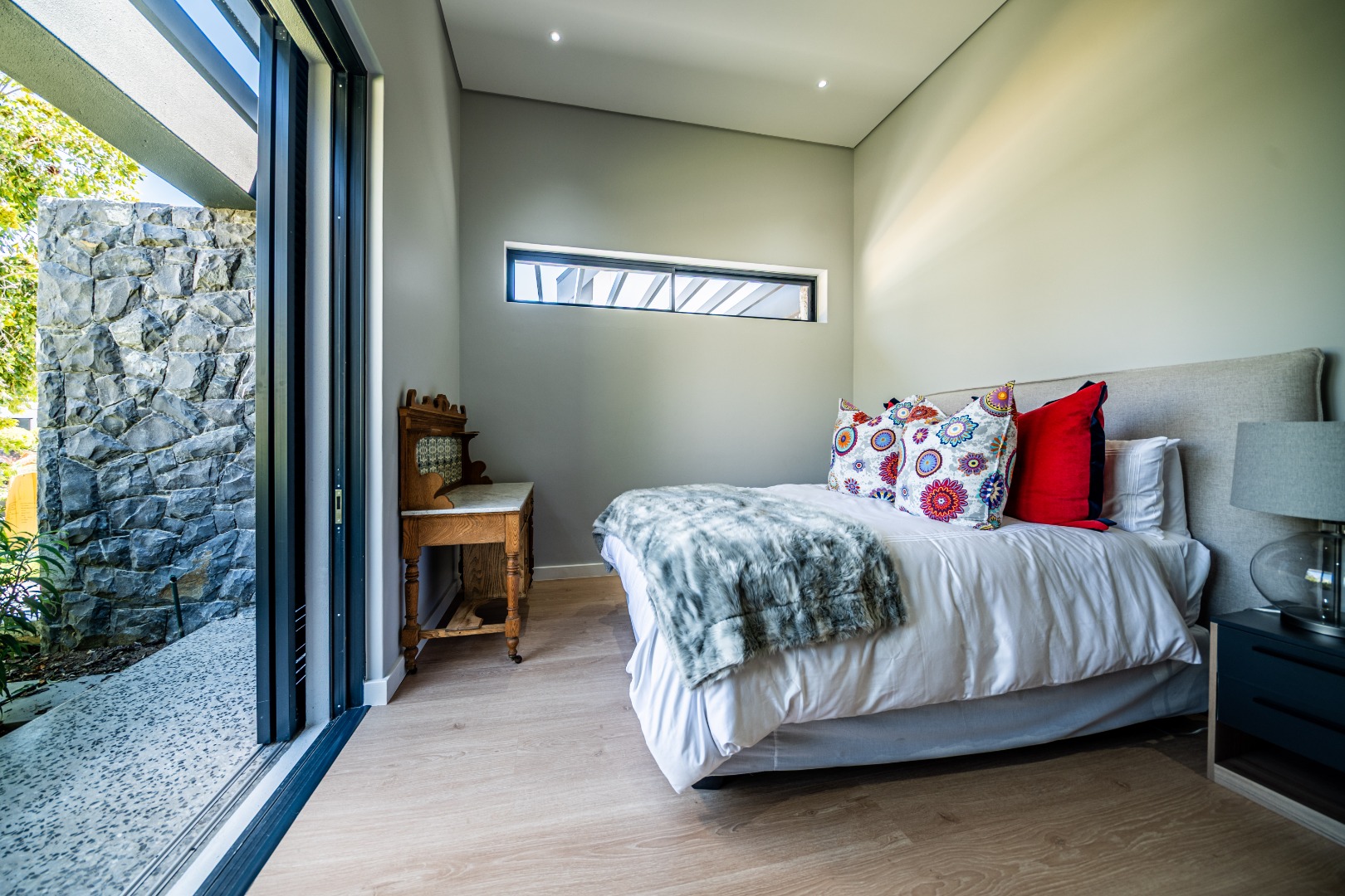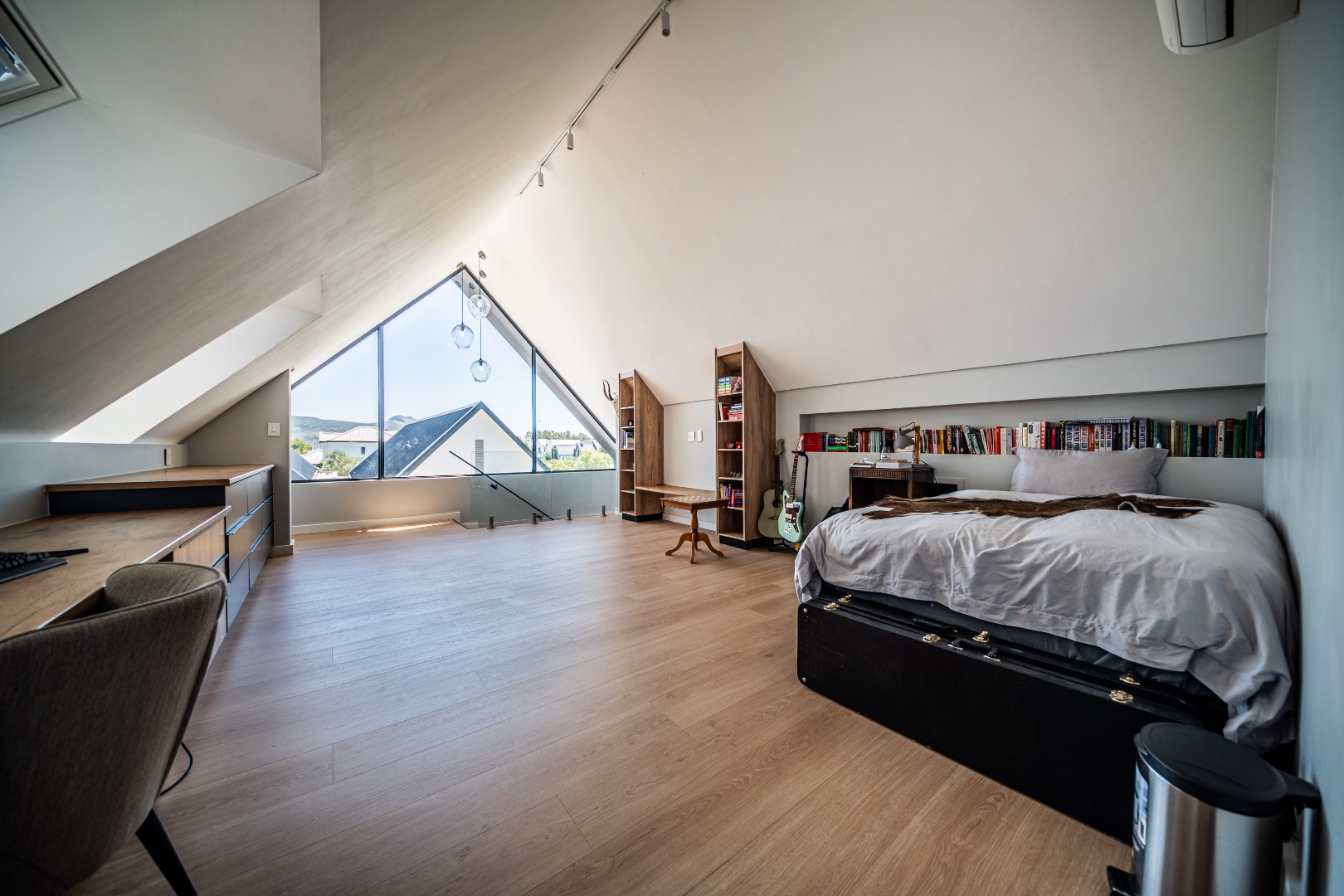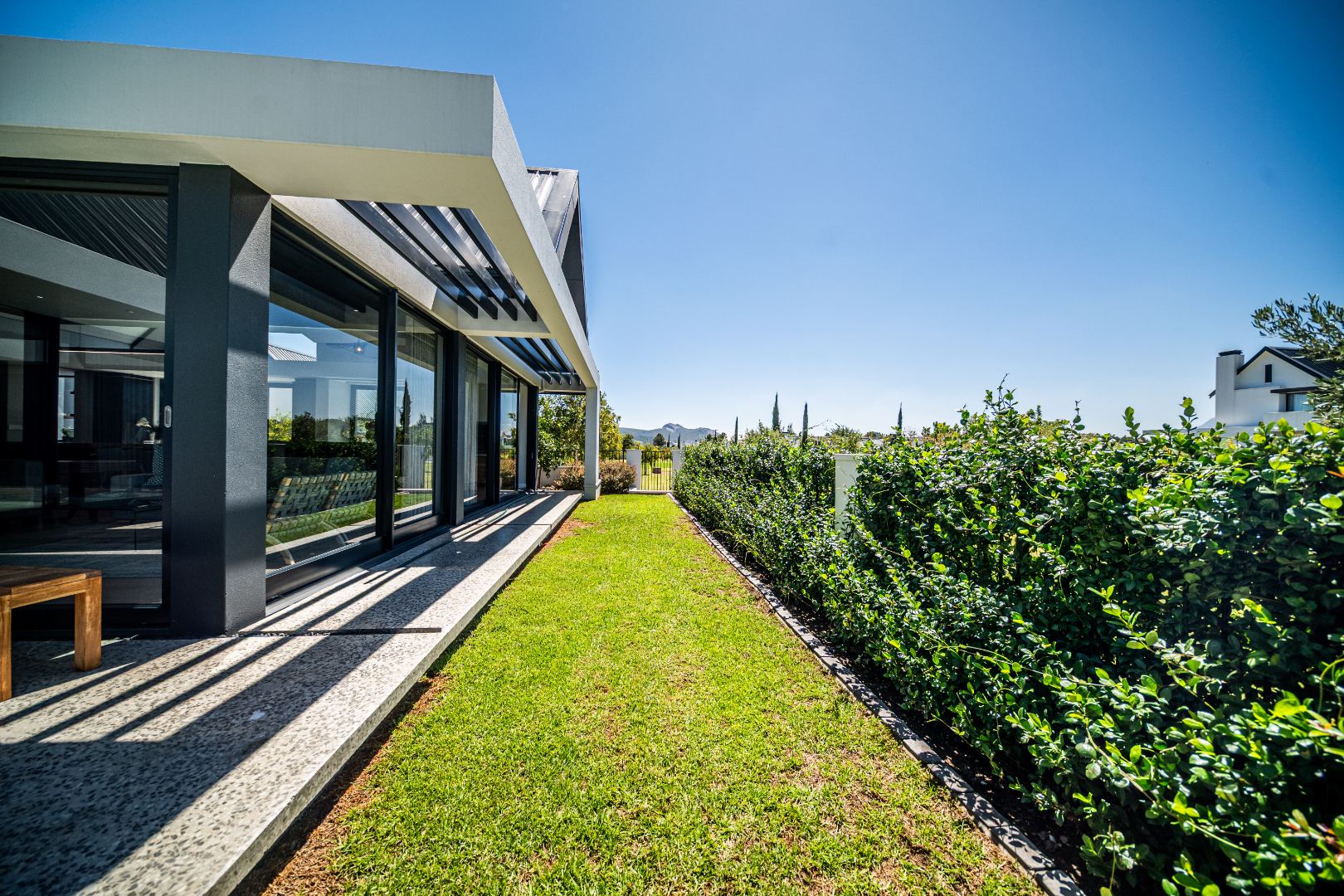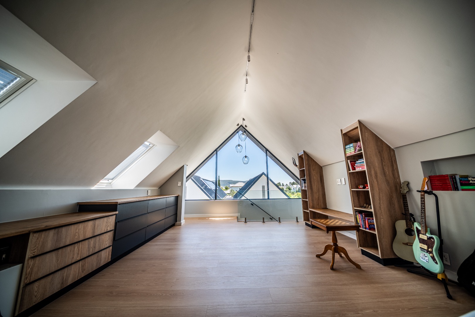The beautifully designed kitchen combines functionality with elegant style. It features expansive preparation areas, a gas cooktop, and a striking granite centre island with warm wood detailing that naturally becomes the social hub of the home. A stylish wine display and bar area adds character and sophistication for hosting guests, while a separate scullery provides ample storage, space for appliances, and direct access to the outdoor service area. Large windows and stacking doors frame the surrounding mountain landscape, allowing natural light to fill the interiors and enhance the sense of space.
