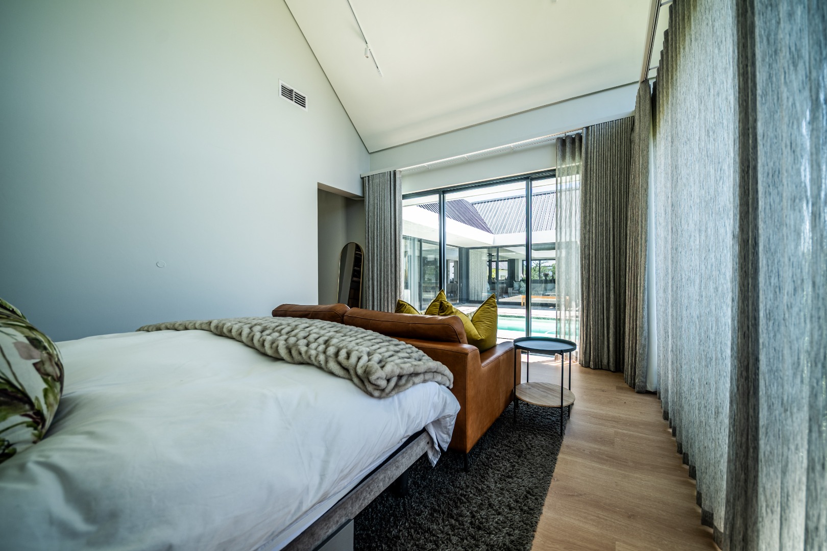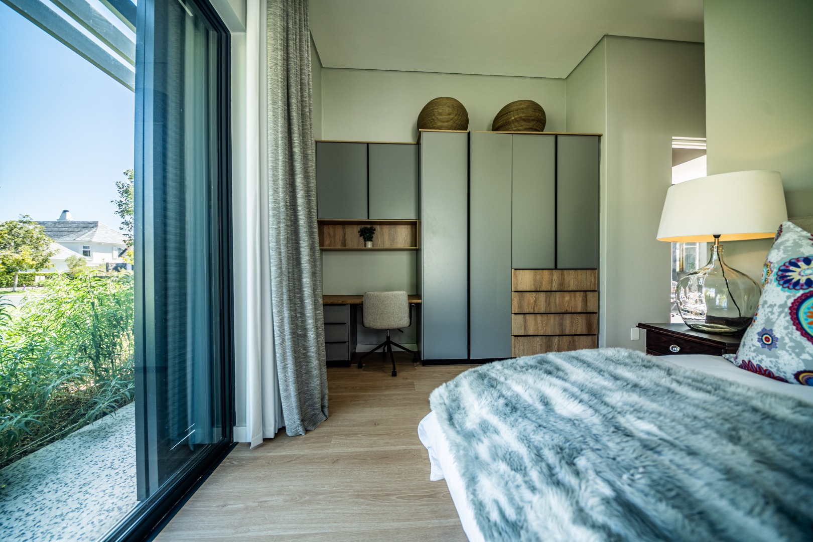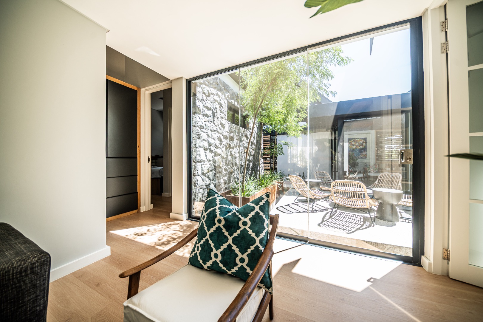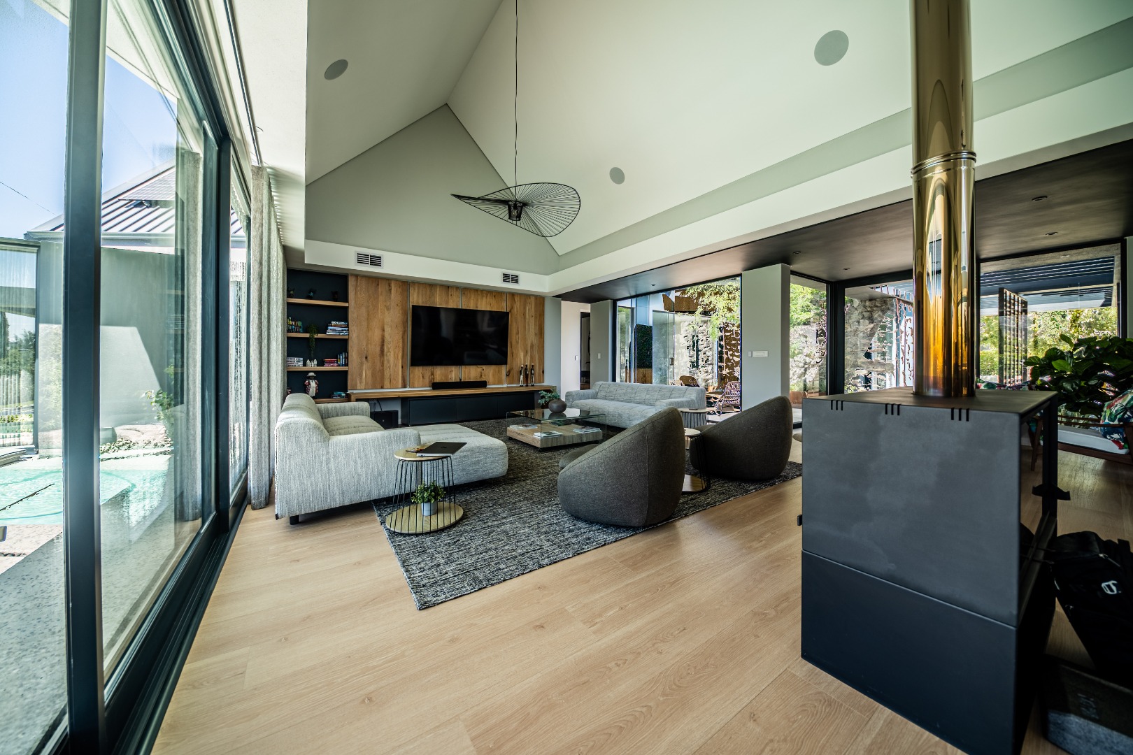 The beautifully designed kitchen combines functionality with elegant style. It features expansive preparation areas, a gas cooktop, and a striking granite centre island with warm wood detailing that naturally becomes the social hub of the home. A stylish wine display and bar area adds character and sophistication for hosting guests, while a separate scullery provides ample storage, space for appliances, and direct access to the outdoor service area. Large windows and stacking doors frame the surrounding mountain landscape, allowing natural light to fill the interiors and enhance the sense of space.