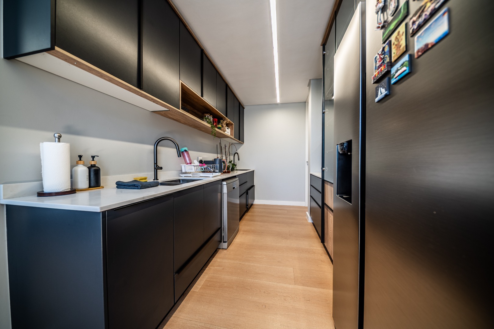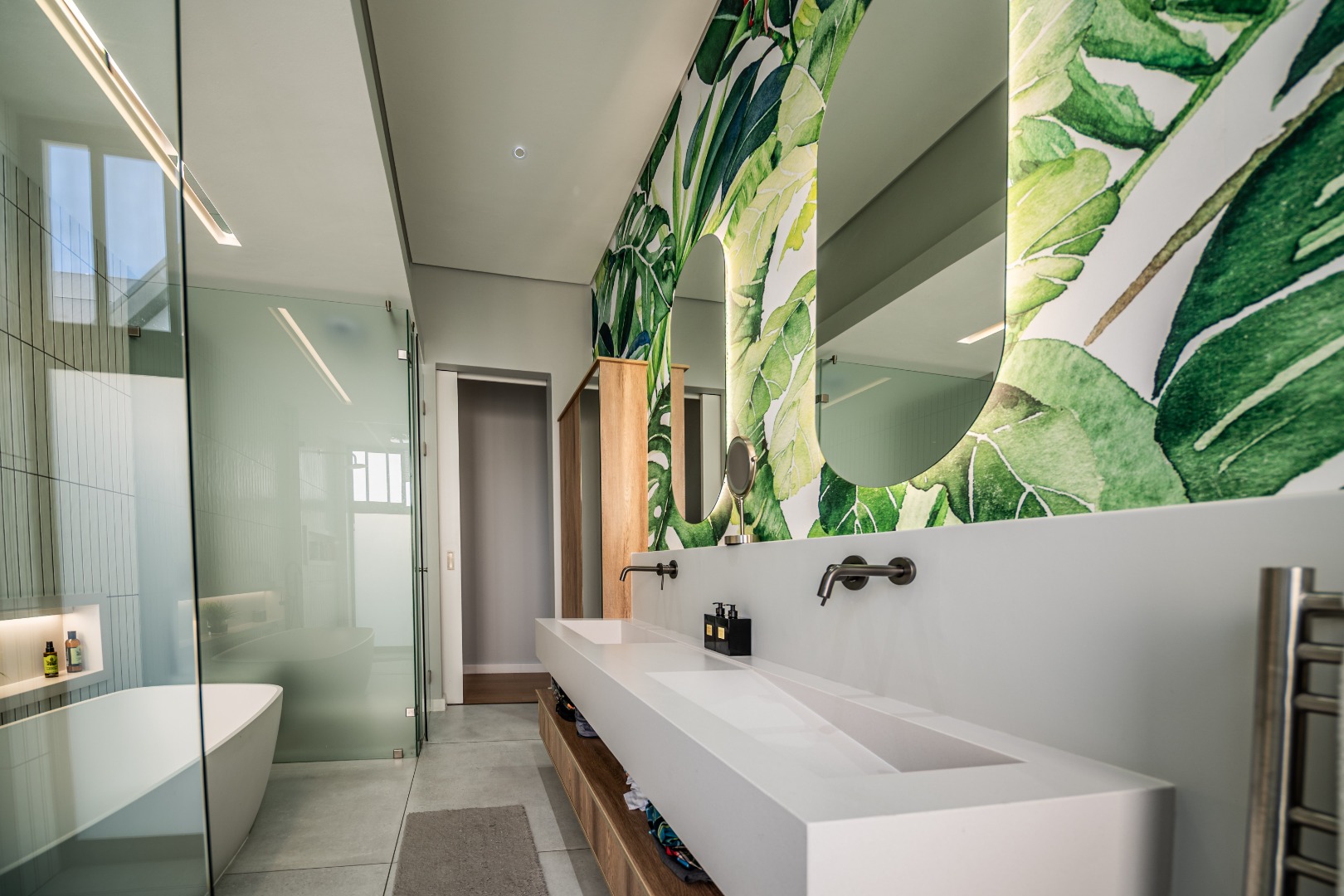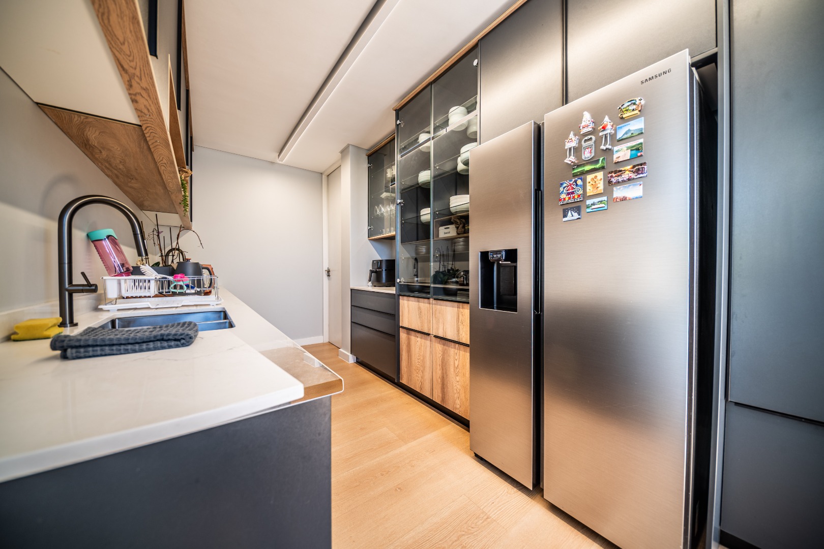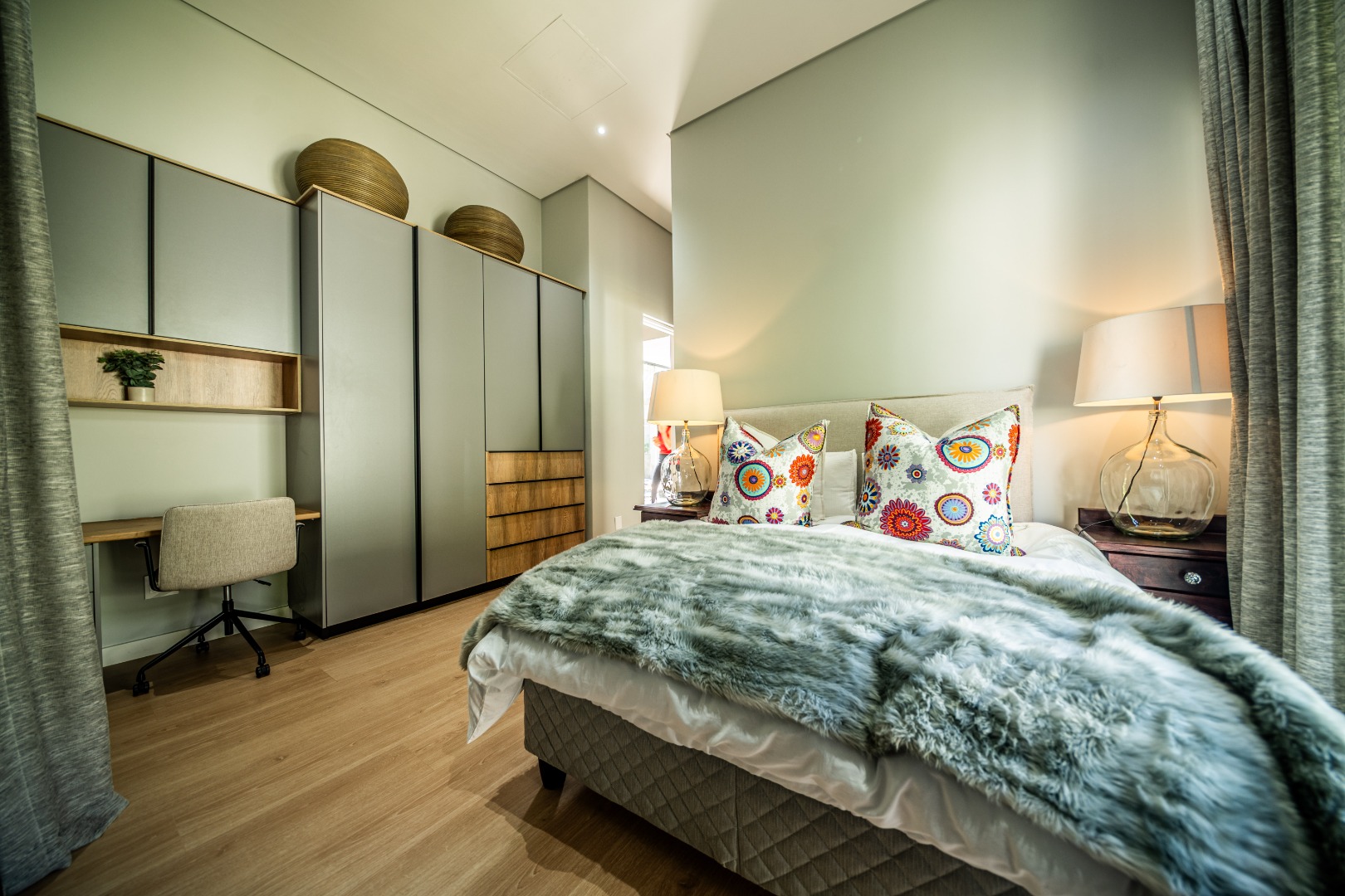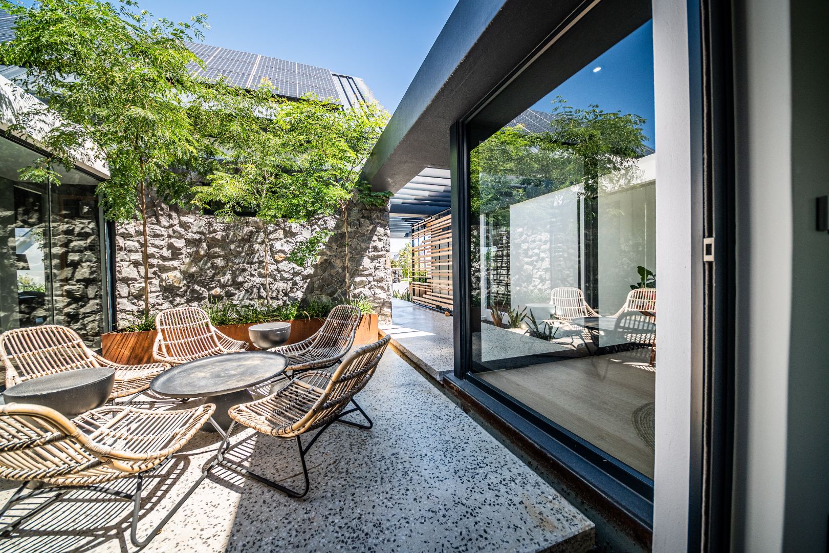 The beautifully designed kitchen combines functionality with elegant style. It features expansive preparation areas, a gas cooktop, and a striking granite centre island with warm wood detailing that naturally becomes the social hub of the home. A stylish wine display and bar area adds character and sophistication for hosting guests, while a separate scullery provides ample storage, space for appliances, and direct access to the outdoor service area. Large windows and stacking doors frame the surrounding mountain landscape, allowing natural light to fill the interiors and enhance the sense of space.