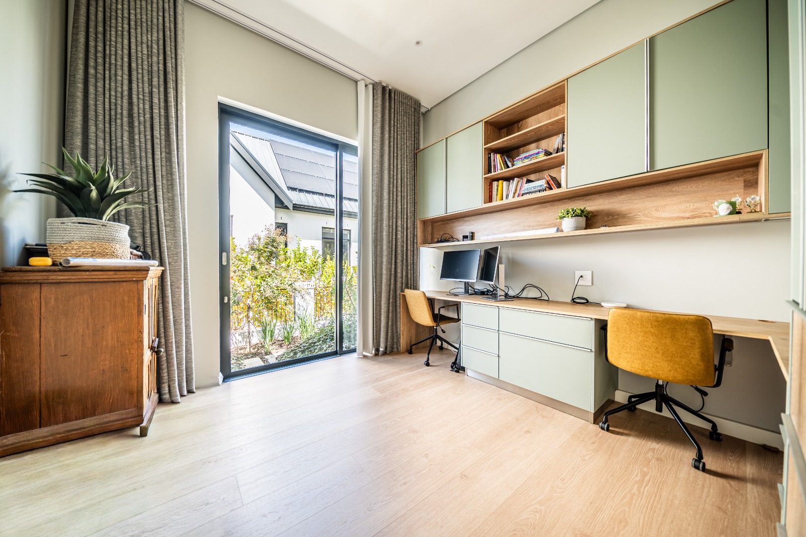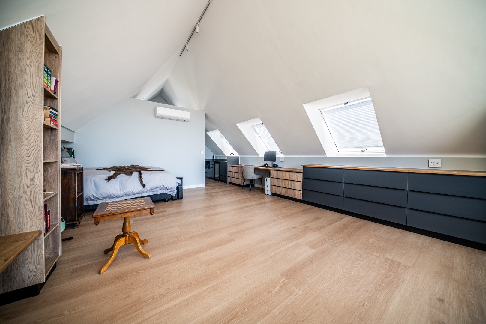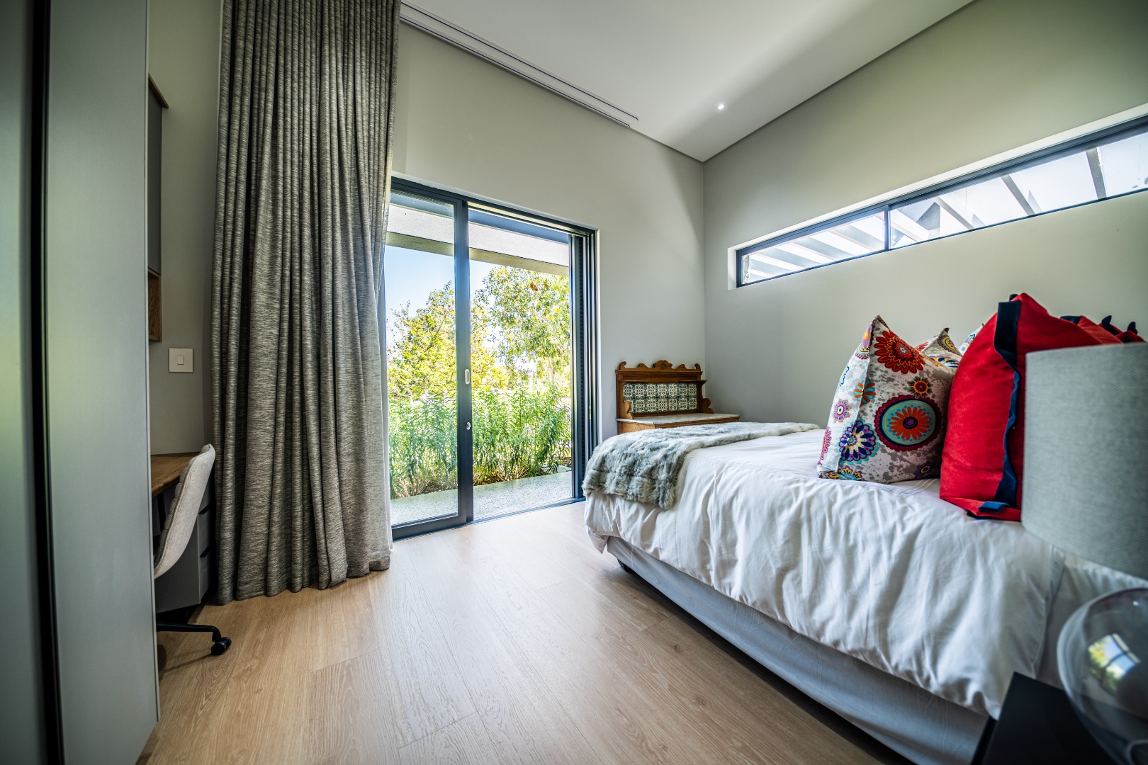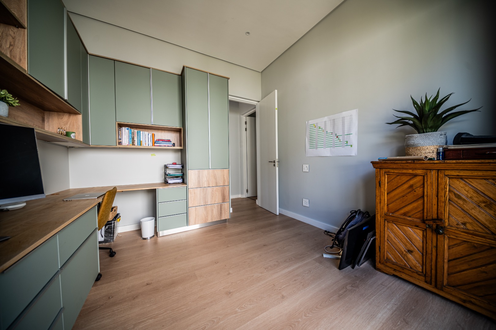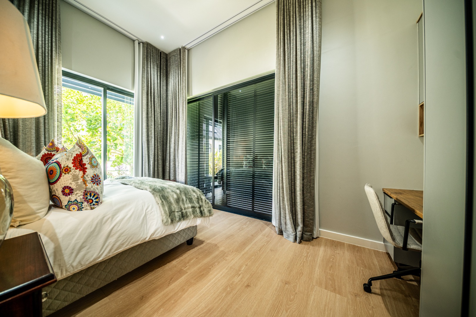 The private bedroom wing offers a peaceful retreat from the living areas. The luxurious main suite opens onto the garden through glass doors and includes a spacious walk-in dressing room and full en-suite bathroom. Two additional bedrooms feature built-in cupboards, study desks, aluminium shutters, and en-suite bathrooms, connected by a comfortable pajama lounge. Upstairs, a versatile en-suite room can serve as a guest suite, studio, games room, or additional office. Completing this remarkable home is a heated swimming pool, triple garage with built-in storage and laundry facilities, central heating, and a solar power system with 20kVA backup and 30 panels, ensuring comfort and convenience year-round.