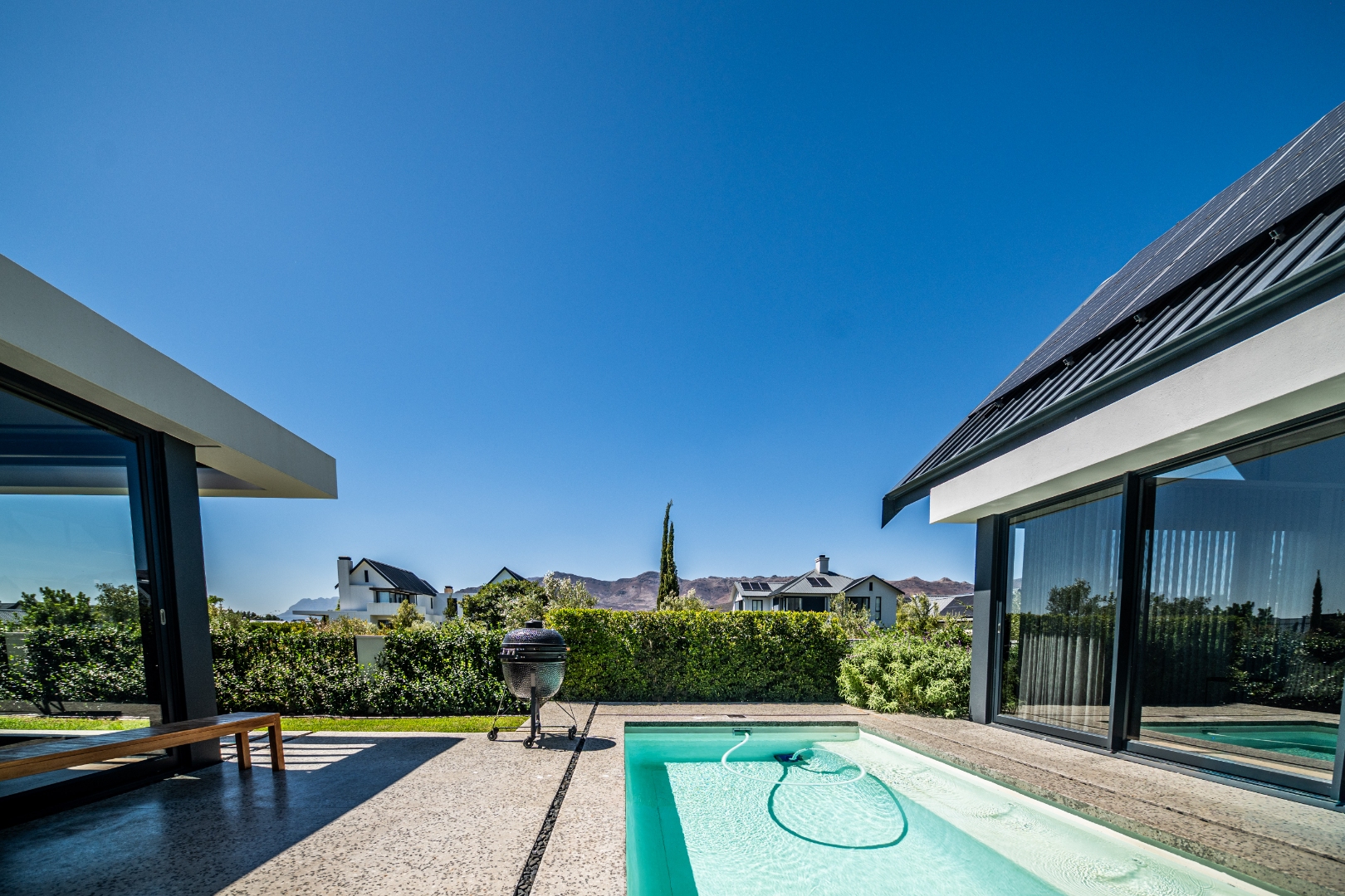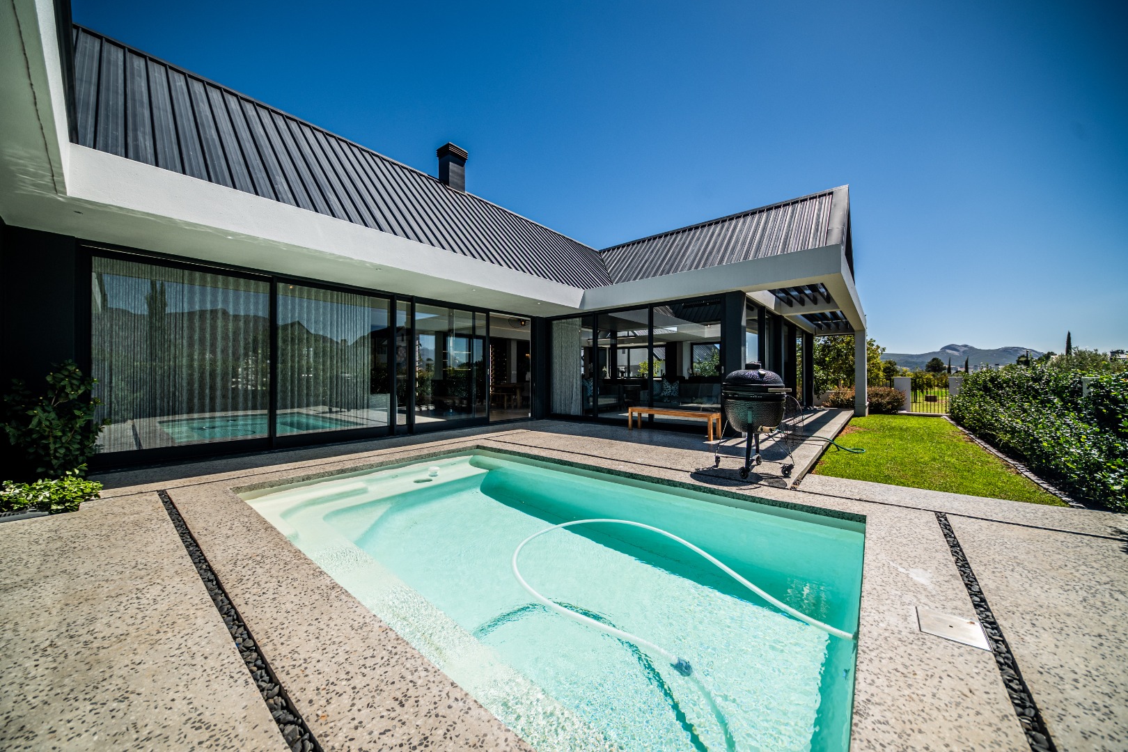 Set within the prestigious Val de Vie Estate, this exceptional contemporary home offers breathtaking mountain views, generous living spaces, and refined modern finishes. Designed with clean architectural lines, soaring ceilings, and warm timber accents, the residence creates a sophisticated yet welcoming atmosphere. The expansive open-plan living area forms the heart of the home, where the kitchen, dining, and lounge flow seamlessly together. Large sliding glass doors open onto the poolside patio and garden, creating effortless indoor-outdoor living, while a separate braai lounge and multiple dining areas provide the perfect setting for entertaining family and friends.