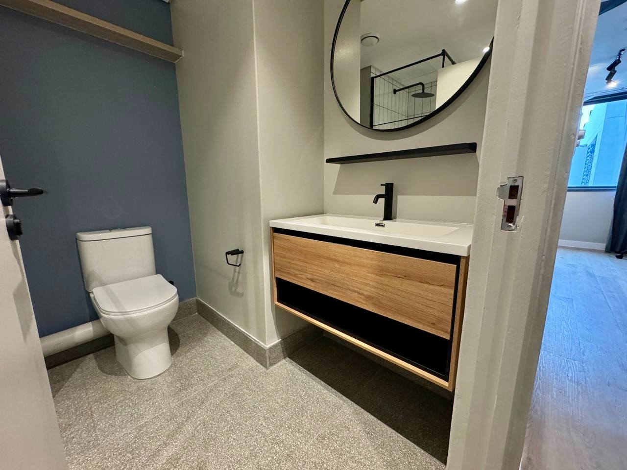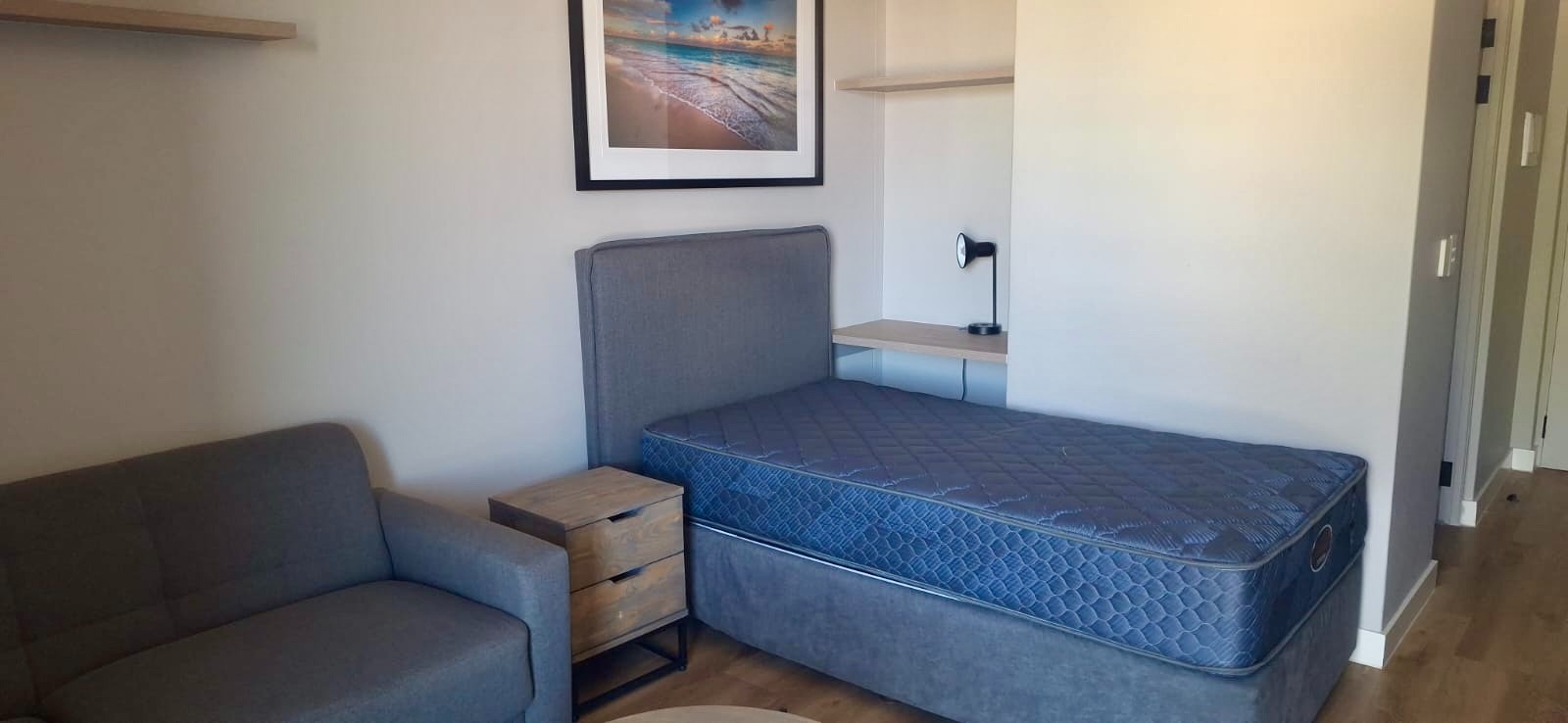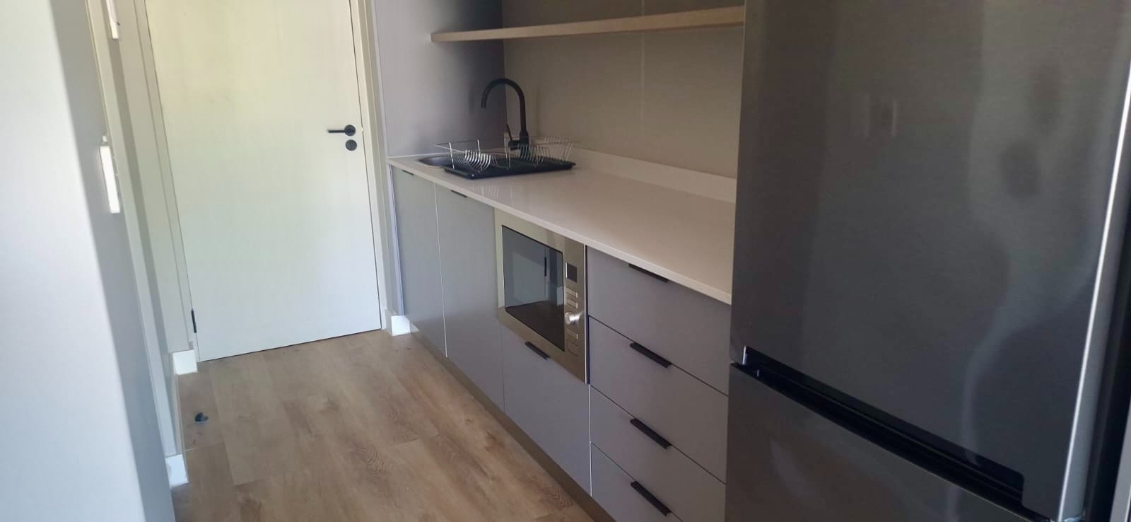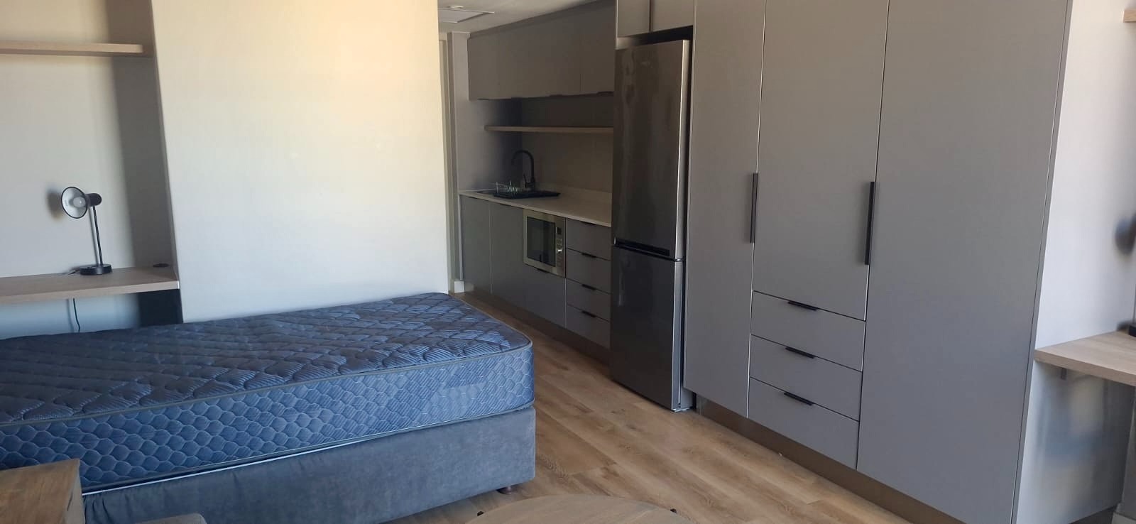 This modern, furnished studio apartment is situated within 'THE ONE' building in Dennesig, Stellenbosch. Designed for efficient living, the unit features a compact yet stylish kitchenette equipped with light grey cabinetry, white countertops, and integrated appliances including a microwave and refrigerator. The interior boasts contemporary wood-look laminate flooring and extensive built-in storage solutions, complemented by a dedicated desk area, ideal for students or professionals.