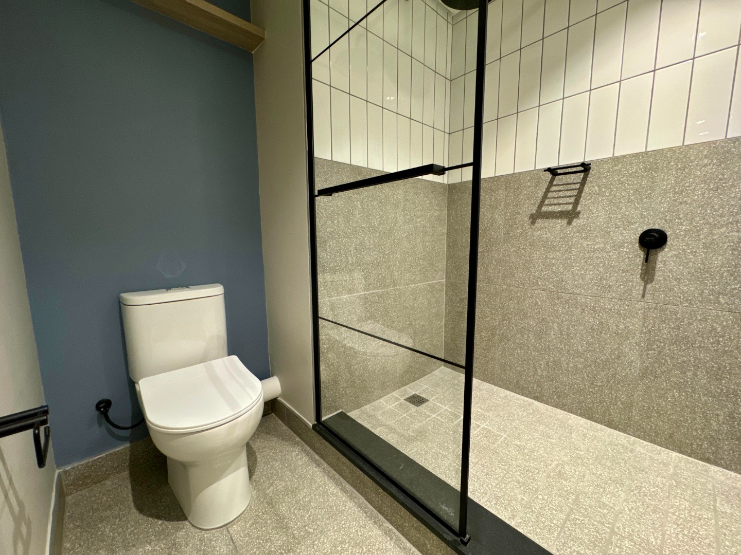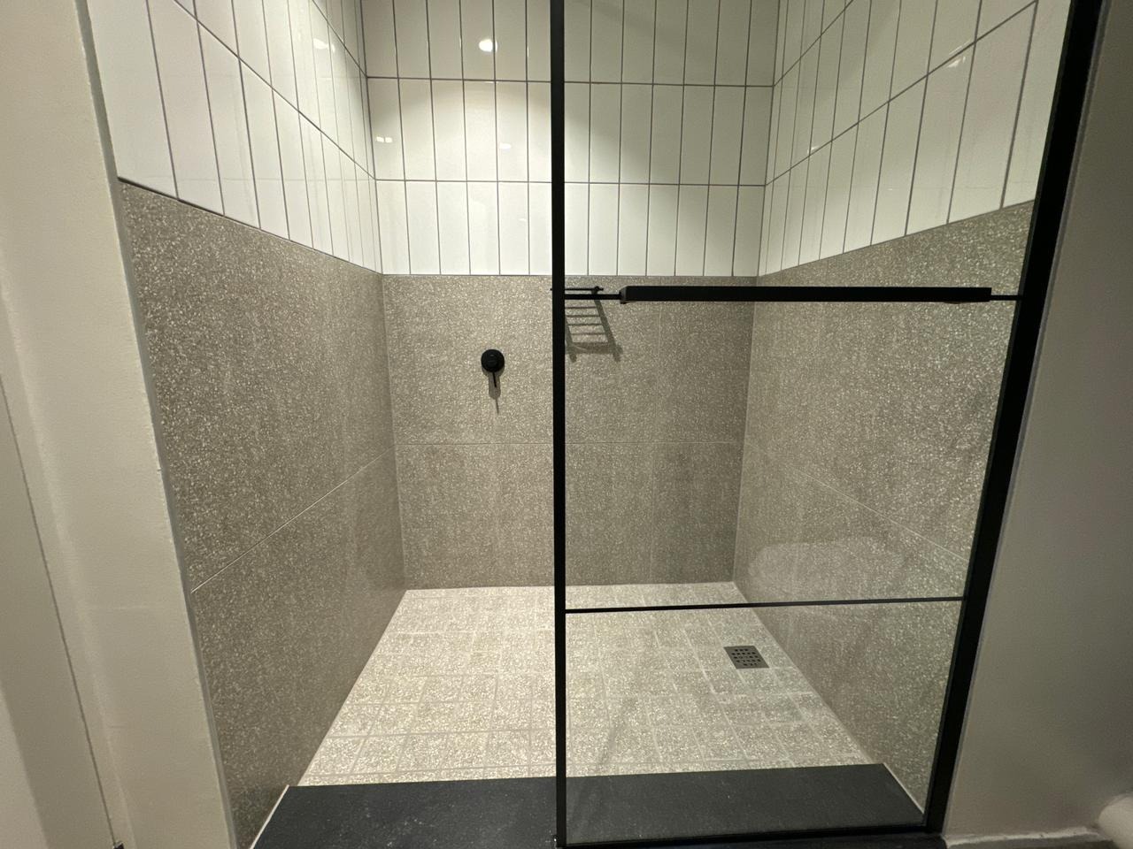 The sleek bathroom offers a modern aesthetic with a floating wood-finish vanity, a round mirror, and a spacious walk-in shower featuring a stylish black-framed glass screen and contemporary tiling. Step out onto your private balcony to enjoy panoramic mountain views, providing a serene backdrop for relaxation or study.