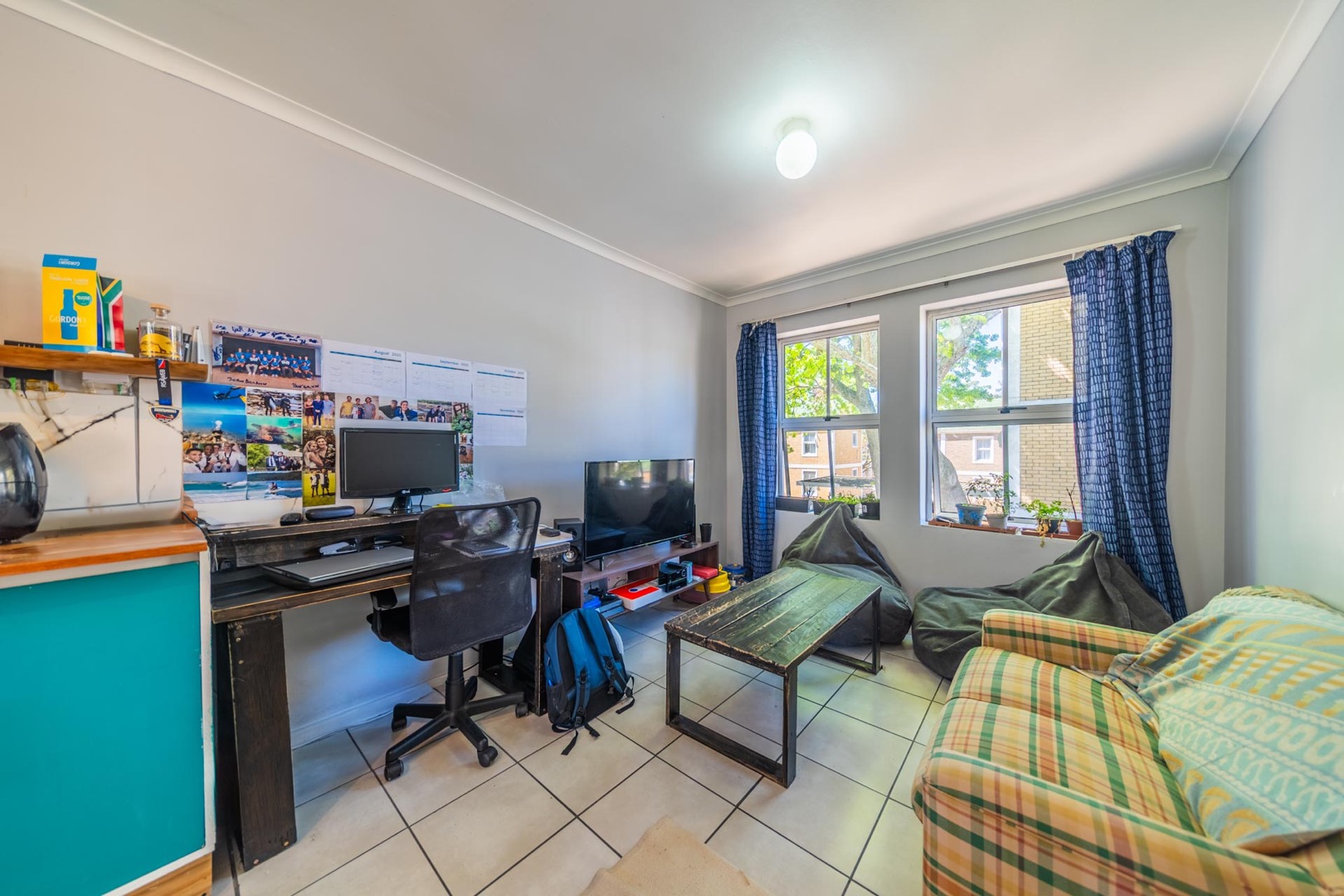 The living area is designed for ease, with durable tiled flooring and large windows that invite abundant natural light, creating a bright and welcoming atmosphere. The bedroom, also with tiled flooring, offers a built-in wardrobe for storage and is a comfortable retreat after a day of studies.