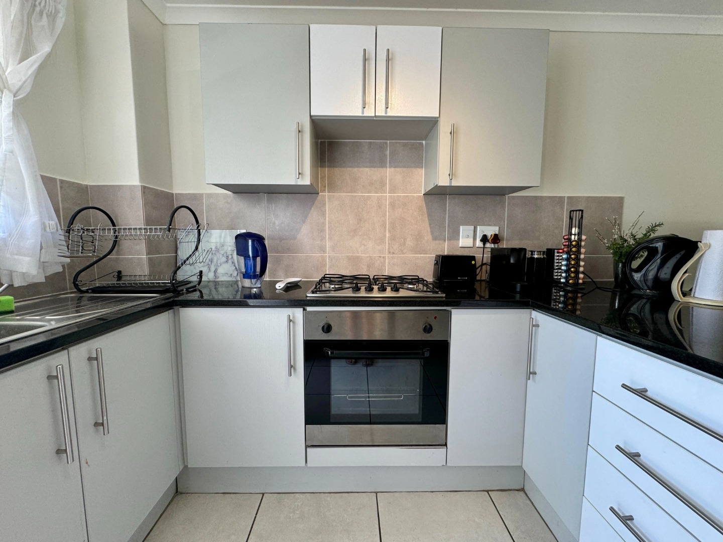 The heart of the home is its modern kitchen, equipped with sleek two-tone cabinetry, elegant black granite countertops, a built-in oven, and a gas hob. Both bedrooms are thoughtfully designed with comfort in mind, boasting built-in wardrobes for efficient storage and light wood-look flooring that adds a touch of warmth. The two fully tiled bathrooms include a separate shower cubicle, ensuring convenience and
